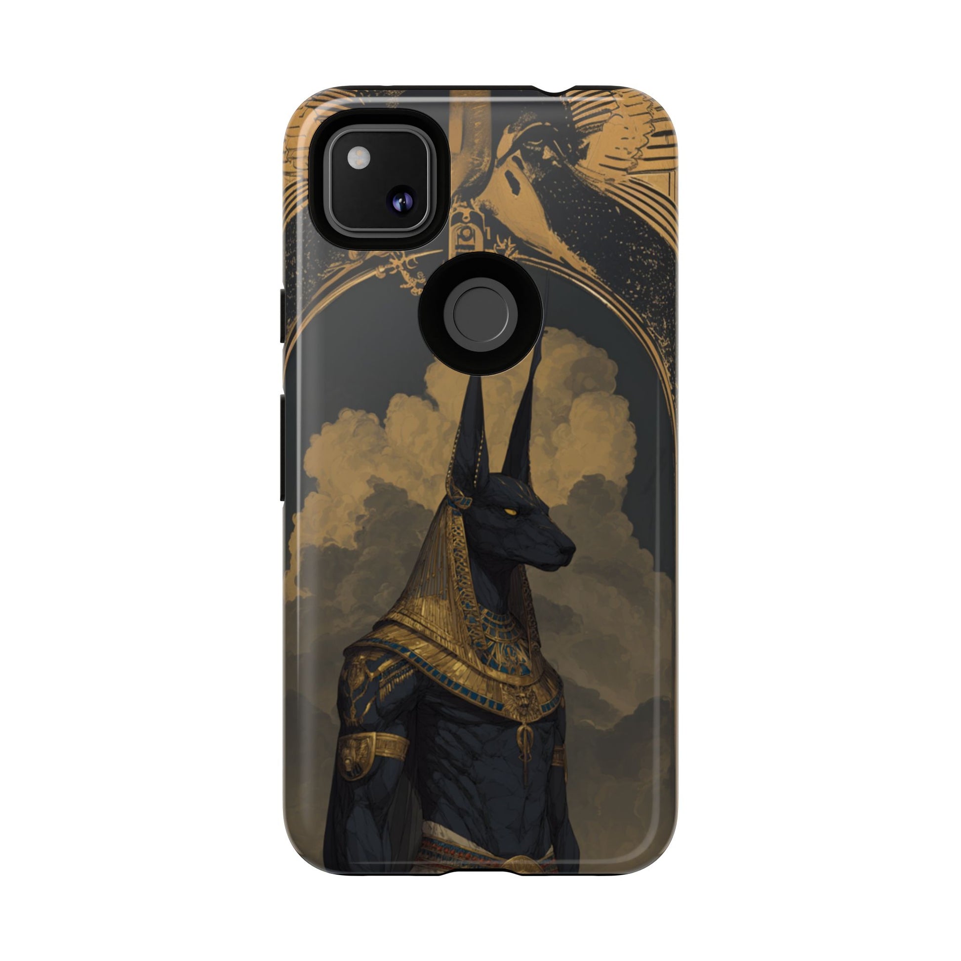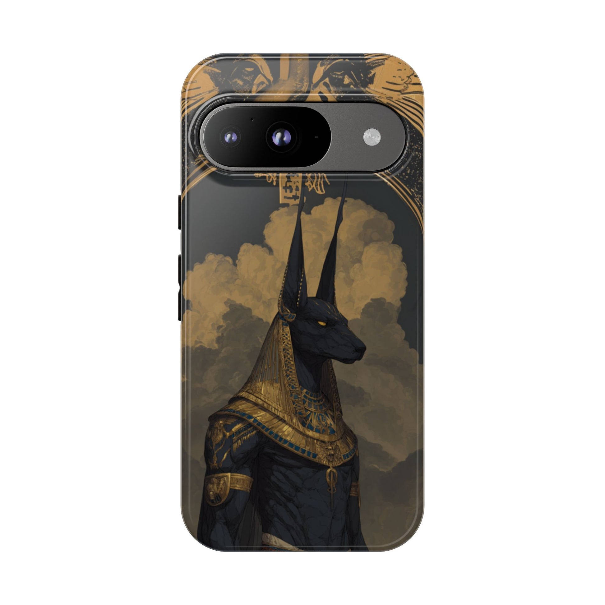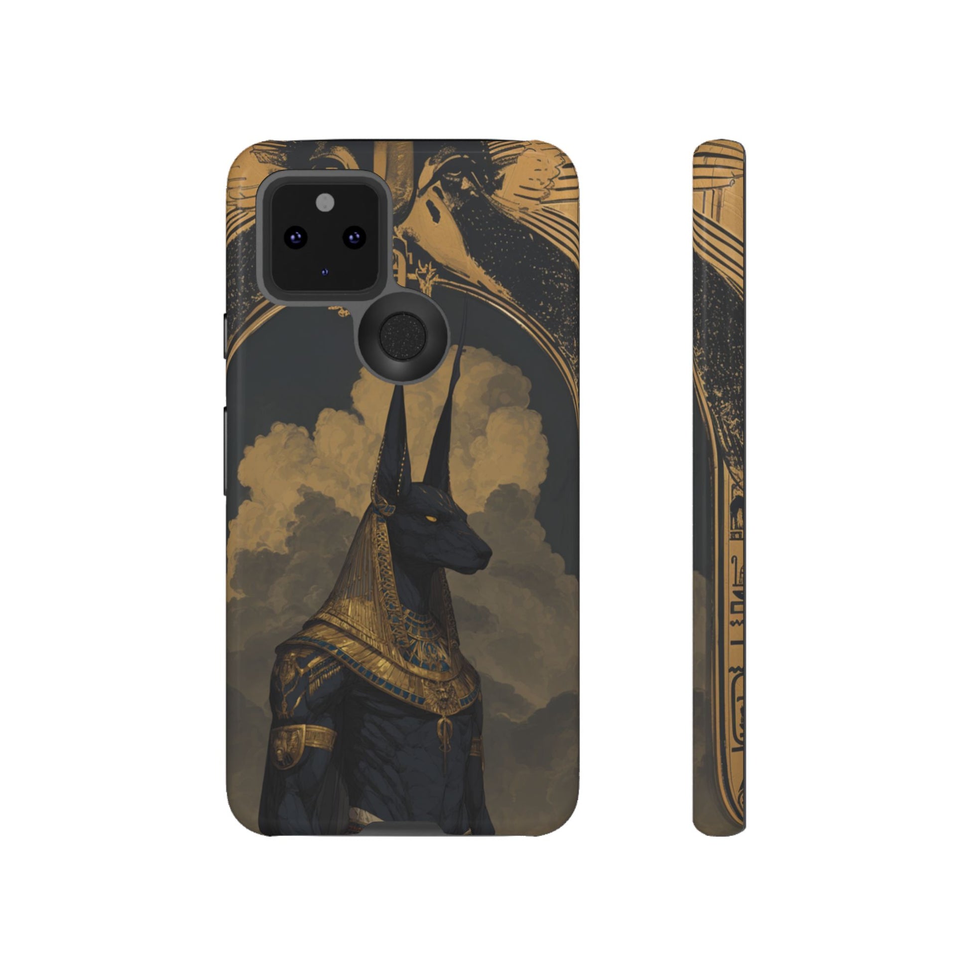 A stoic Anubis rendered in luminous gold and onyx stands guard over a storm‑lit horizon. Impact‑resistant dual‑layer construction pairs with luxe, high‑definition art to safeguard your Google Pixel with divine protection.