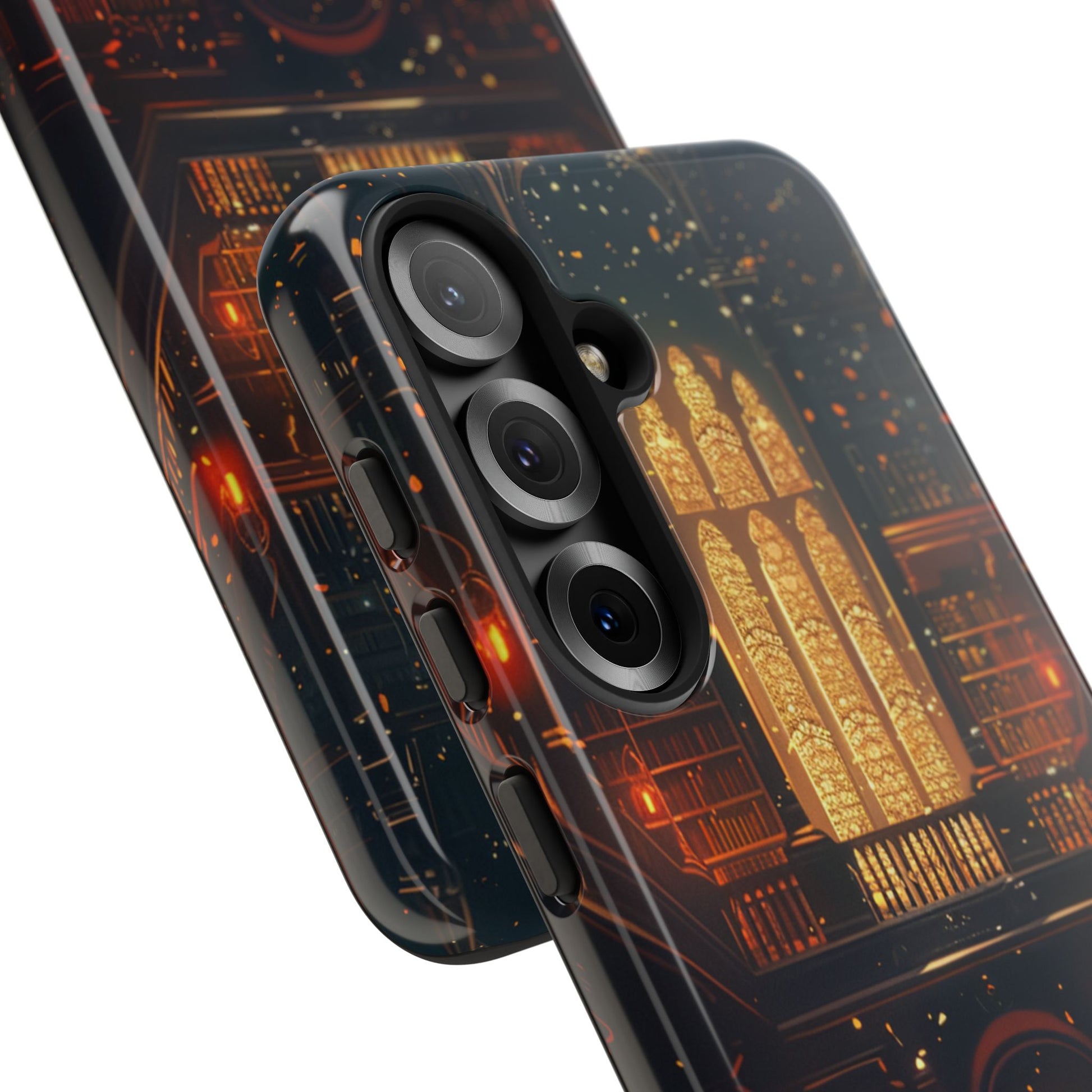 Step into a grand, ember‑lit library where golden dust swirls around towering shelves and gothic arches. Vivid fantasy art meets dual‑layer durability—perfect for safeguarding your Samsung Galaxy S‑Series on every adventure.