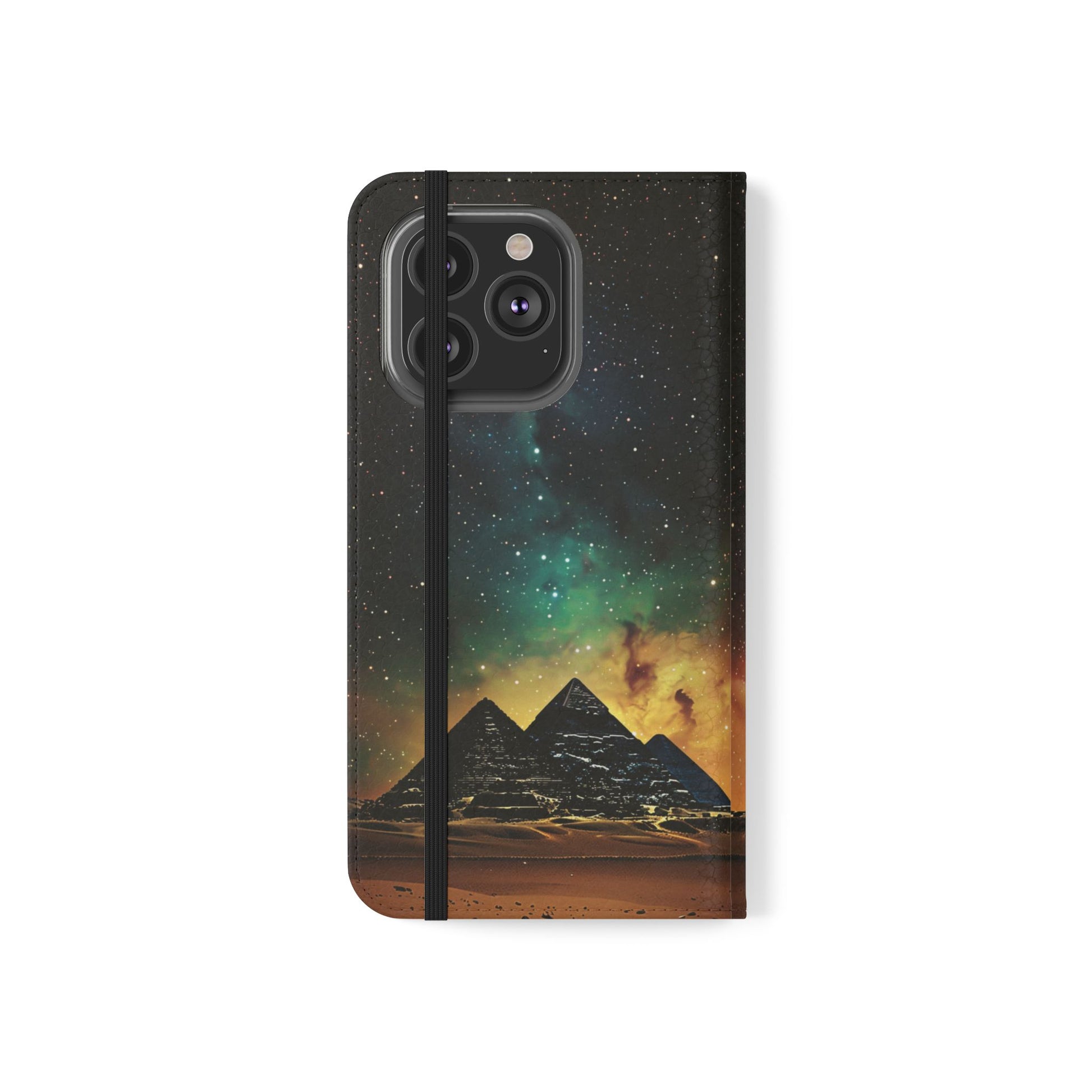 Protect your phone with our premium Astral Pyramids wallet case featuring majestic Egyptian pyramids silhouetted against a breathtaking cosmic nebula sky filled with vibrant orange, teal, and purple colors, thousands of stars, and swirling cosmic clouds above golden desert sands creating a mystical blend of ancient wonders and celestial beauty. This versatile flip case combines wallet functionality with comprehensive phone protection, card storage, and mesmerizing space and Egyptian artwork.