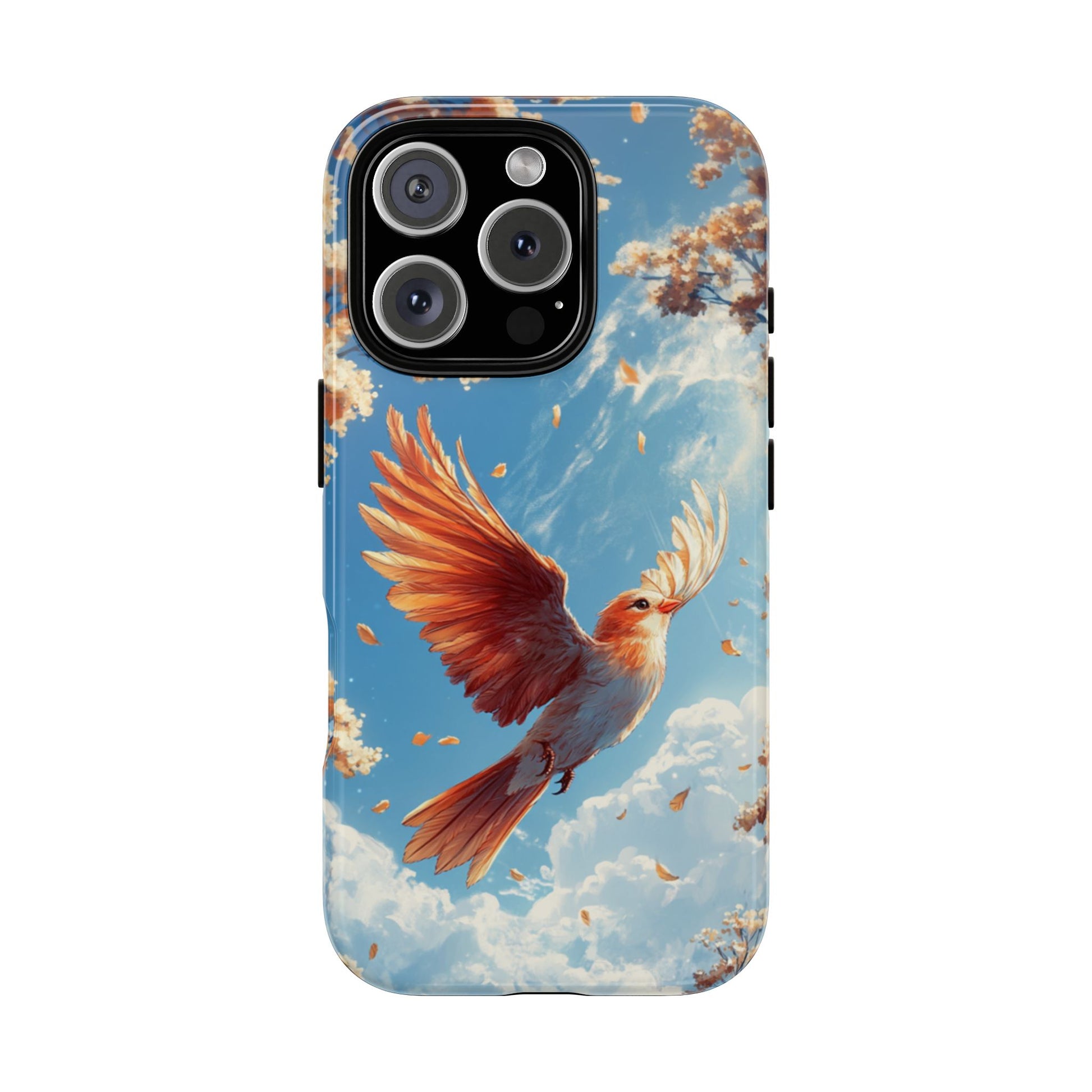 Carry a breath of crisp autumn air wherever you go with this iPhone case. A radiant orange‑gold songbird ascends between blooming treetops beneath a brilliant blue sky, capturing freedom, warmth, and the beauty of changing seasons.