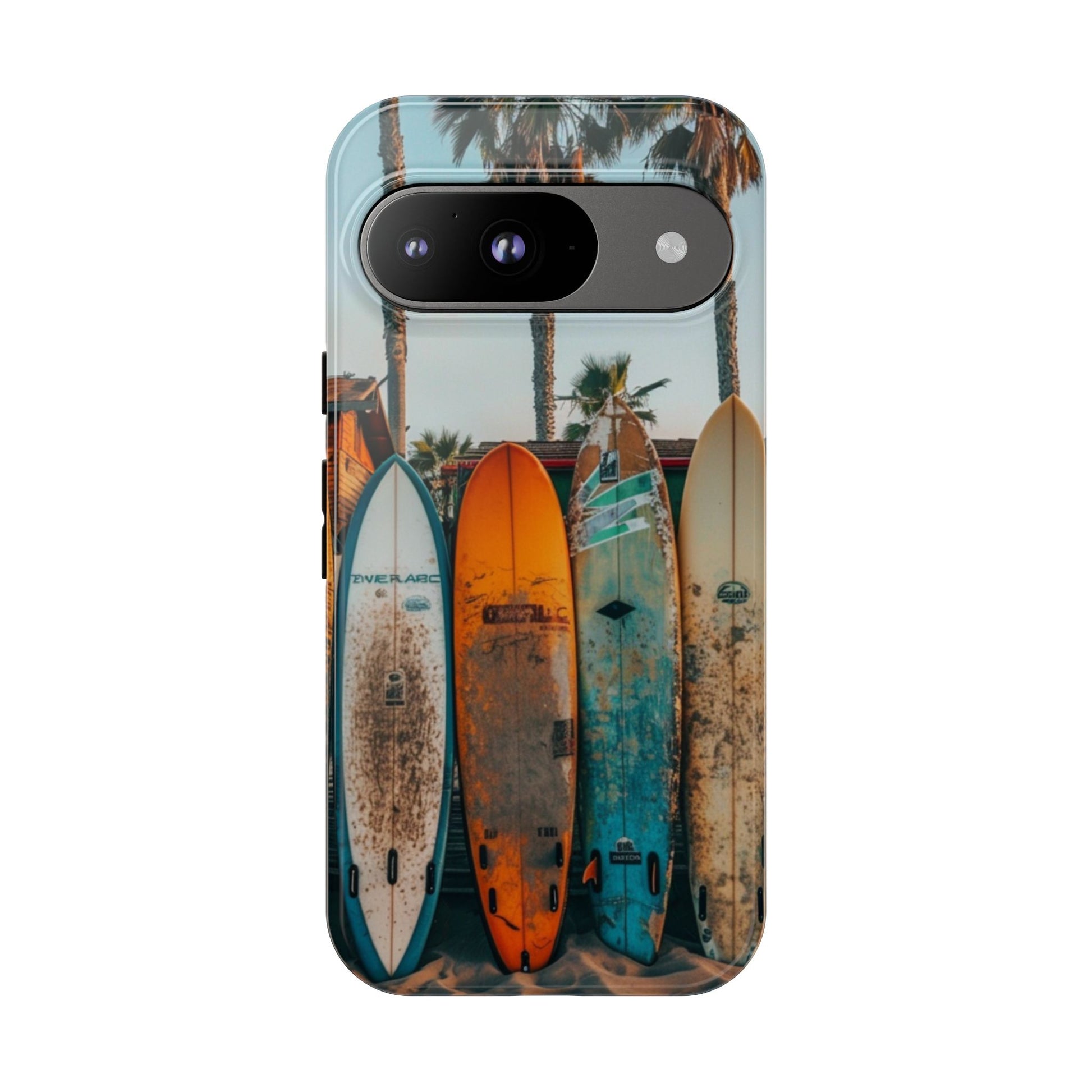 Capture the essence of California surf culture with our vibrant Beach Surfboards Google Pixel case. This authentic design showcases a collection of vintage surfboards lined up against swaying palm trees, evoking endless summer days and the laid-back coastal lifestyle. The warm, sun-kissed colors and weathered surfboard textures tell stories of countless beach adventures and perfect waves. Perfect for surfers, beach lovers, and anyone who dreams of coastal living.