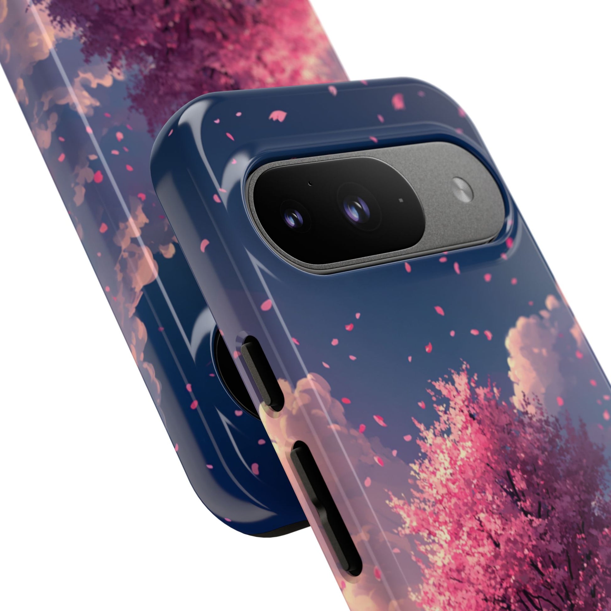 Immerse yourself in the breathtaking beauty of our Cherry Blossom Dream Google Pixel case. This stunning design captures the magical moment when cherry blossoms dance in the wind against a dramatic twilight sky. A magnificent cherry tree in full pink bloom stands majestically as its delicate petals swirl through the air like confetti, creating a mesmerizing spectacle of natural beauty. The sky transitions from deep navy blue to soft pink and purple hues, with billowing clouds that add depth and drama to the scene. This dreamy, anime-inspired aesthetic combines the timeless appeal of Japanese sakura season with contemporary artistic styling. The gentle cascade of falling petals creates movement and romance, while the serene landscape evokes feelings of peace and wonder. Perfect for nature lovers, anime enthusiasts, cherry blossom admirers, or anyone who appreciates the ephemeral beauty of spring blooms and dreamy sunset scenes.
