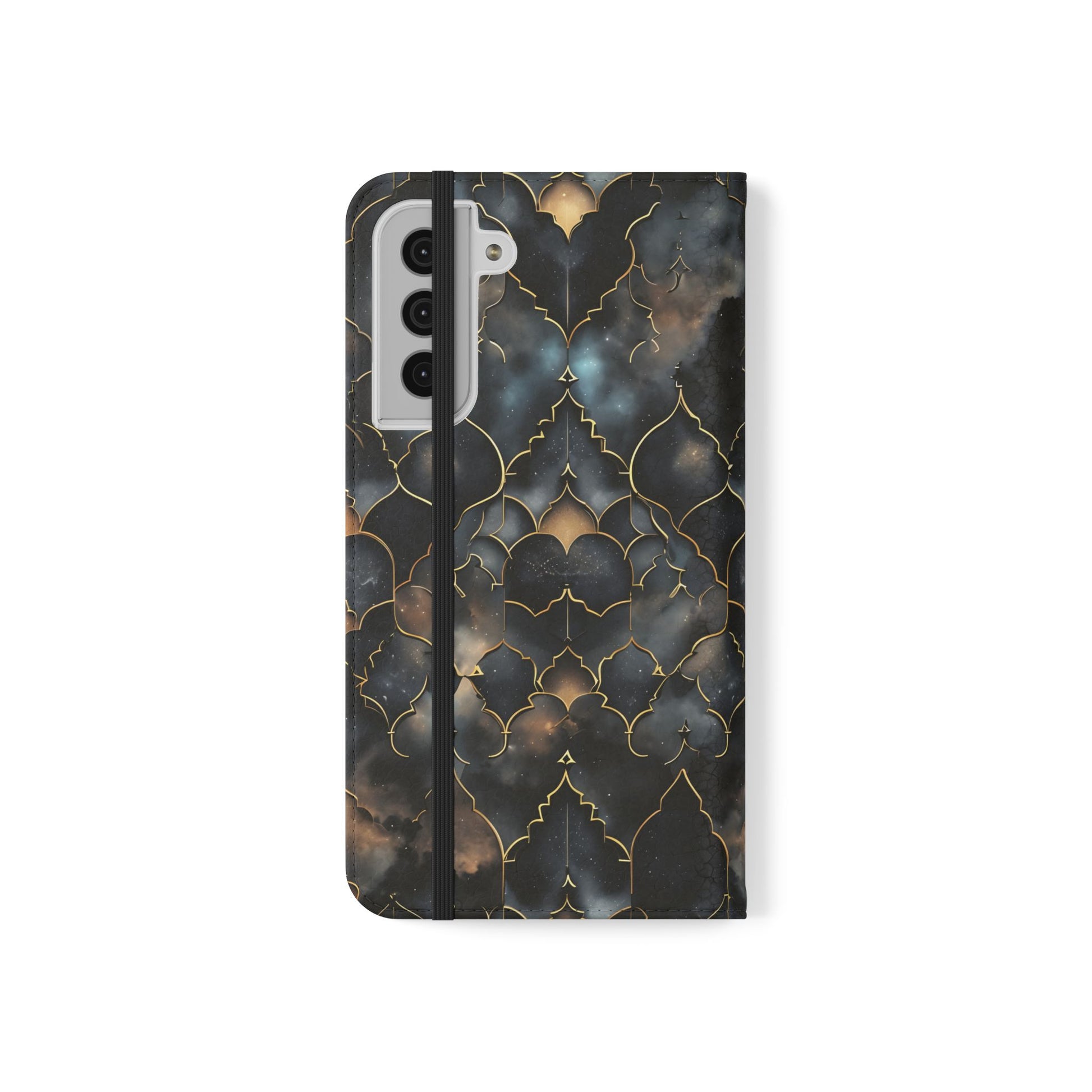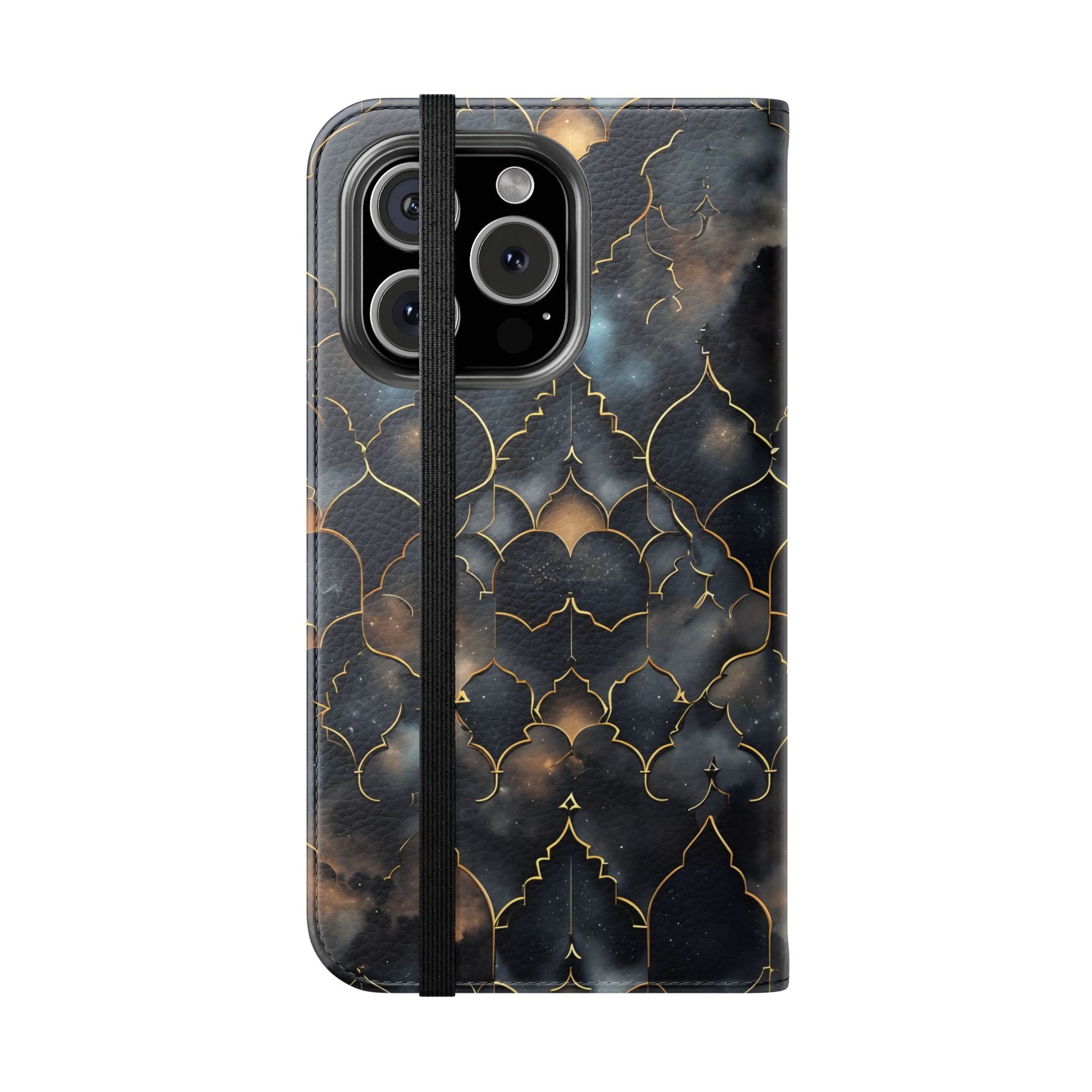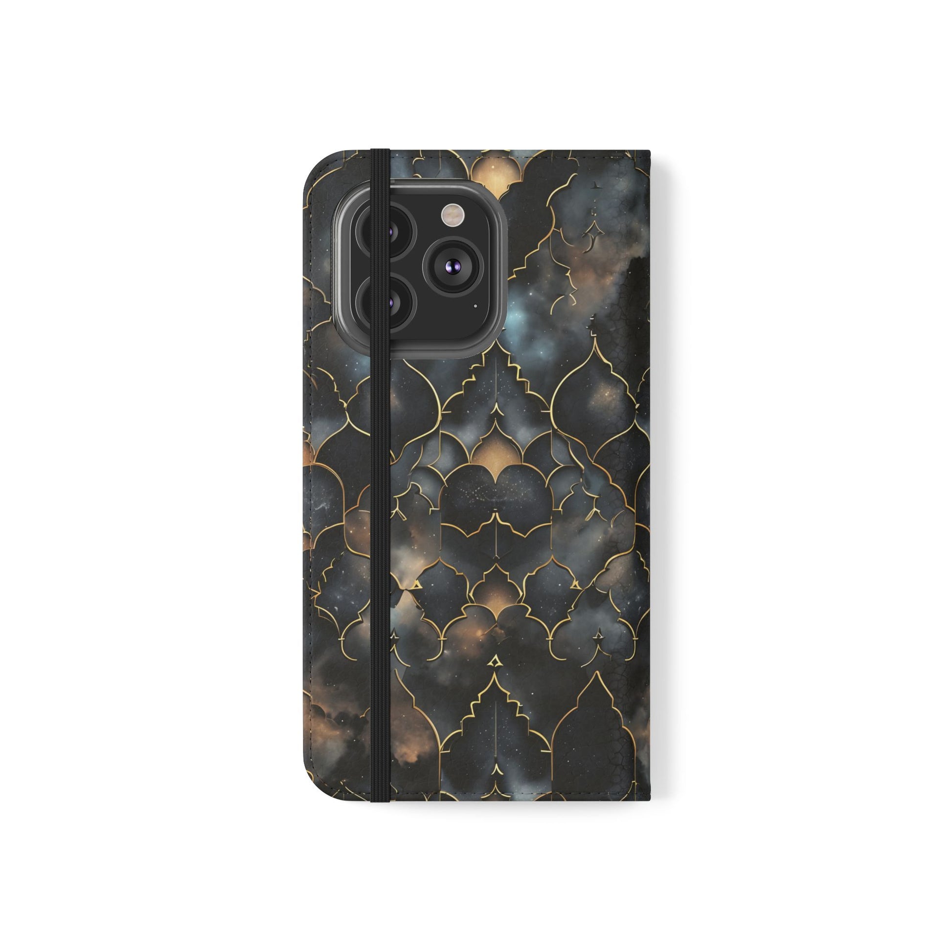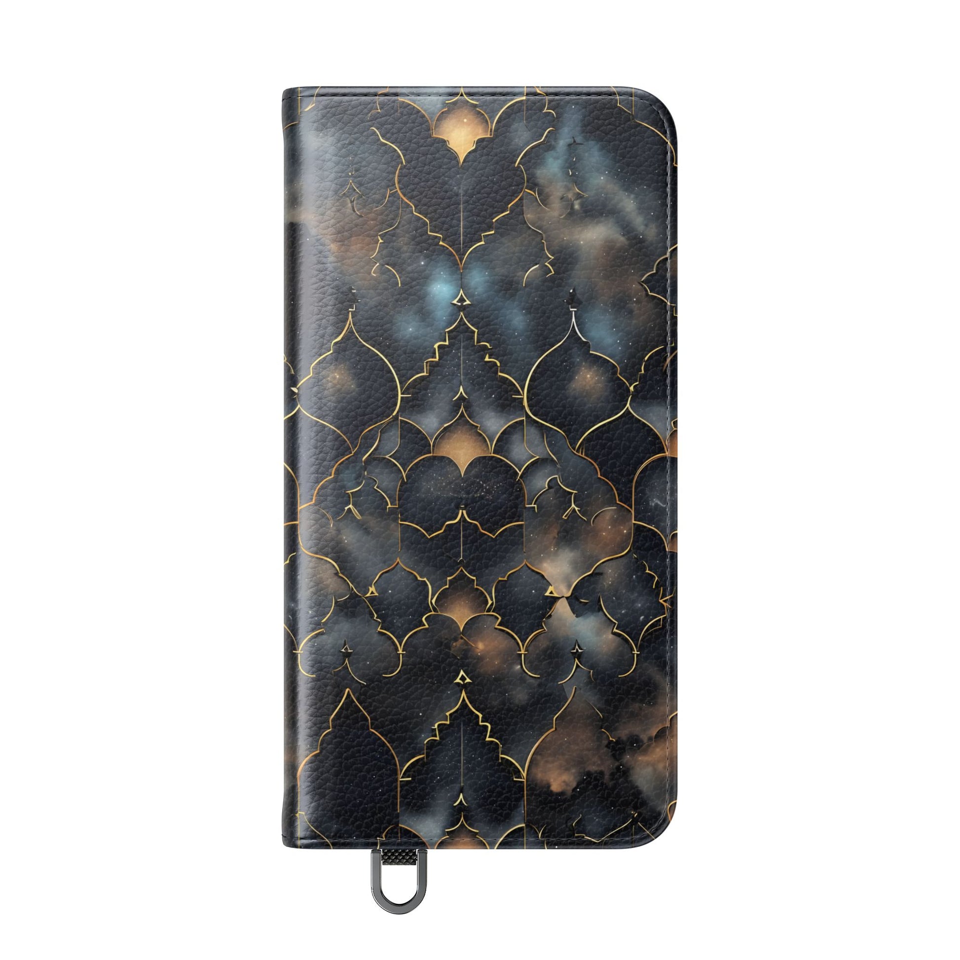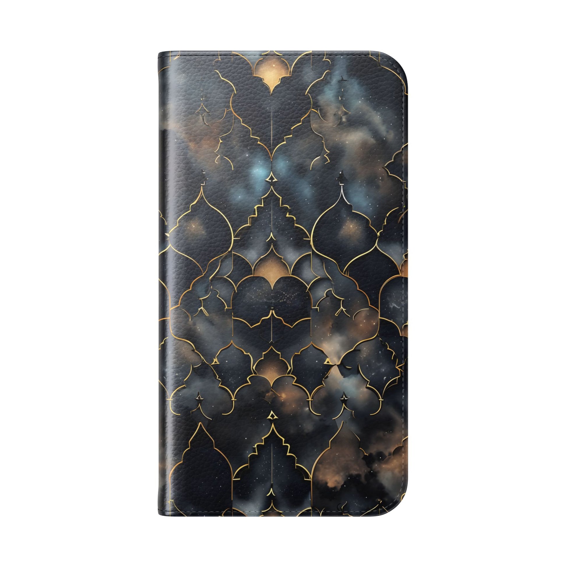 Experience the harmony of earthly artistry and cosmic wonder with our magnificent Cosmic Arabesque Wallet Flip Case. This sophisticated design features intricate golden Islamic geometric patterns that frame breathtaking views of swirling nebulae and starfields. The ornate arabesque shapes create elegant windows into the cosmos, where deep blues, purples, and golden browns of distant galaxies dance within the traditional Islamic architectural framework. This unique fusion celebrates both the mathematical precision of Islamic art and the infinite beauty of the universe. Perfect for lovers of Islamic culture, geometric art enthusiasts, or anyone drawn to the intersection of traditional craftsmanship and cosmic majesty.