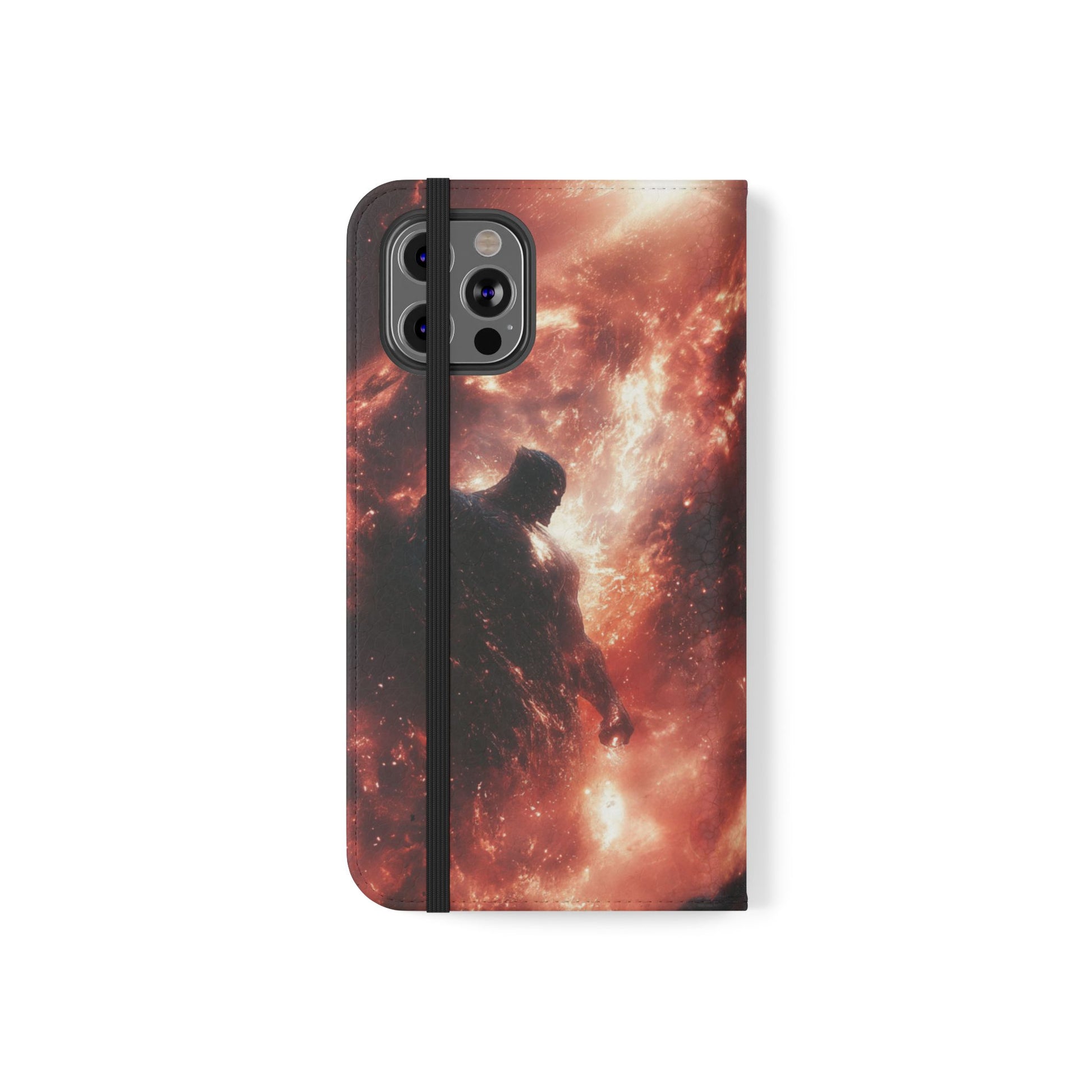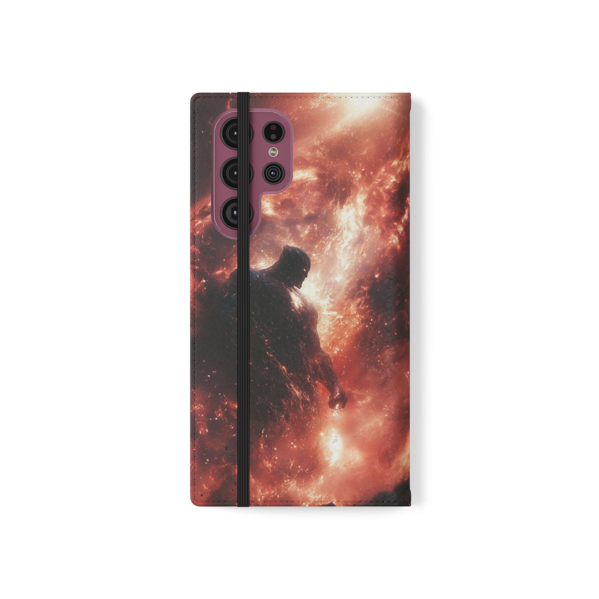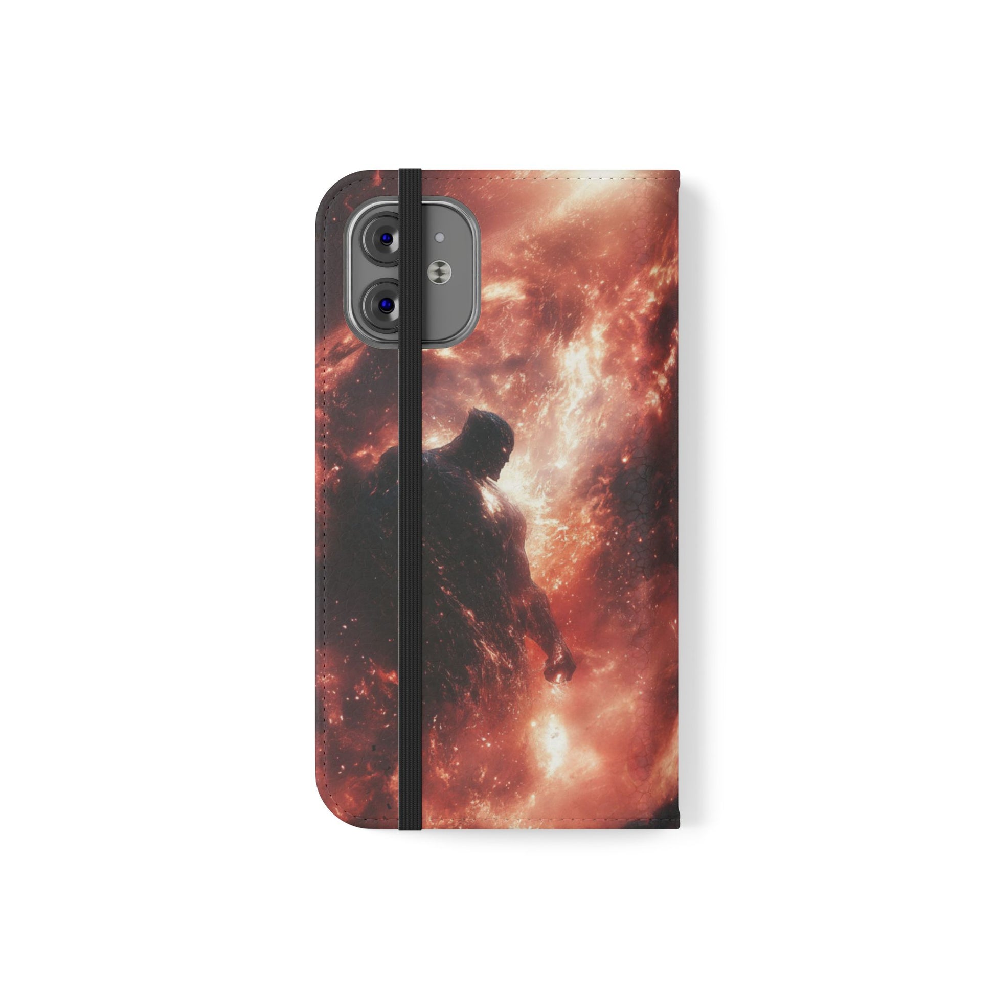 Protect your phone with our premium Cosmic Inferno Titan wallet case featuring a massive titan silhouette against a breathtaking red cosmic fire nebula with swirling flames and scattered stars. This versatile flip case combines wallet functionality with comprehensive phone protection, card storage, and stunning epic space artwork.
