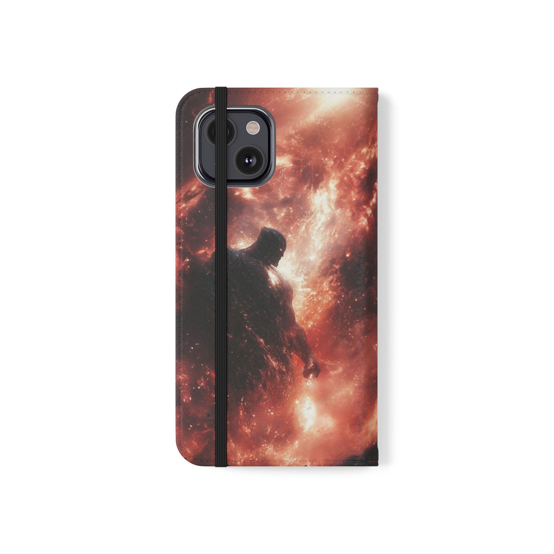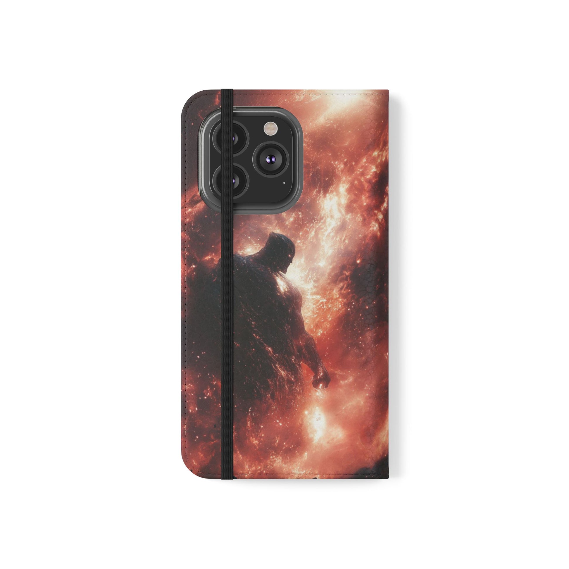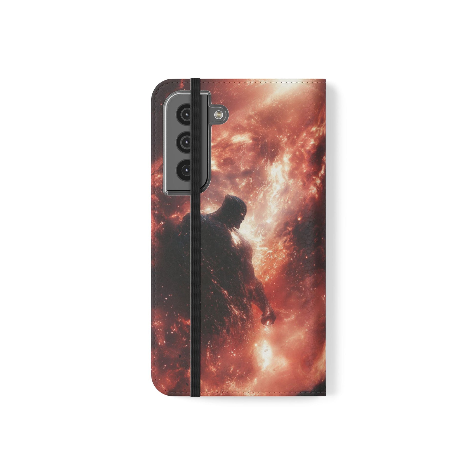 Protect your phone with our premium Cosmic Inferno Titan wallet case featuring a massive titan silhouette against a breathtaking red cosmic fire nebula with swirling flames and scattered stars. This versatile flip case combines wallet functionality with comprehensive phone protection, card storage, and stunning epic space artwork.