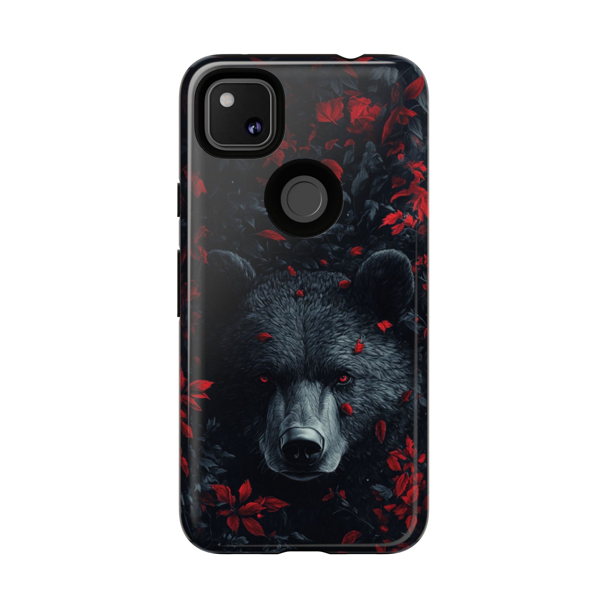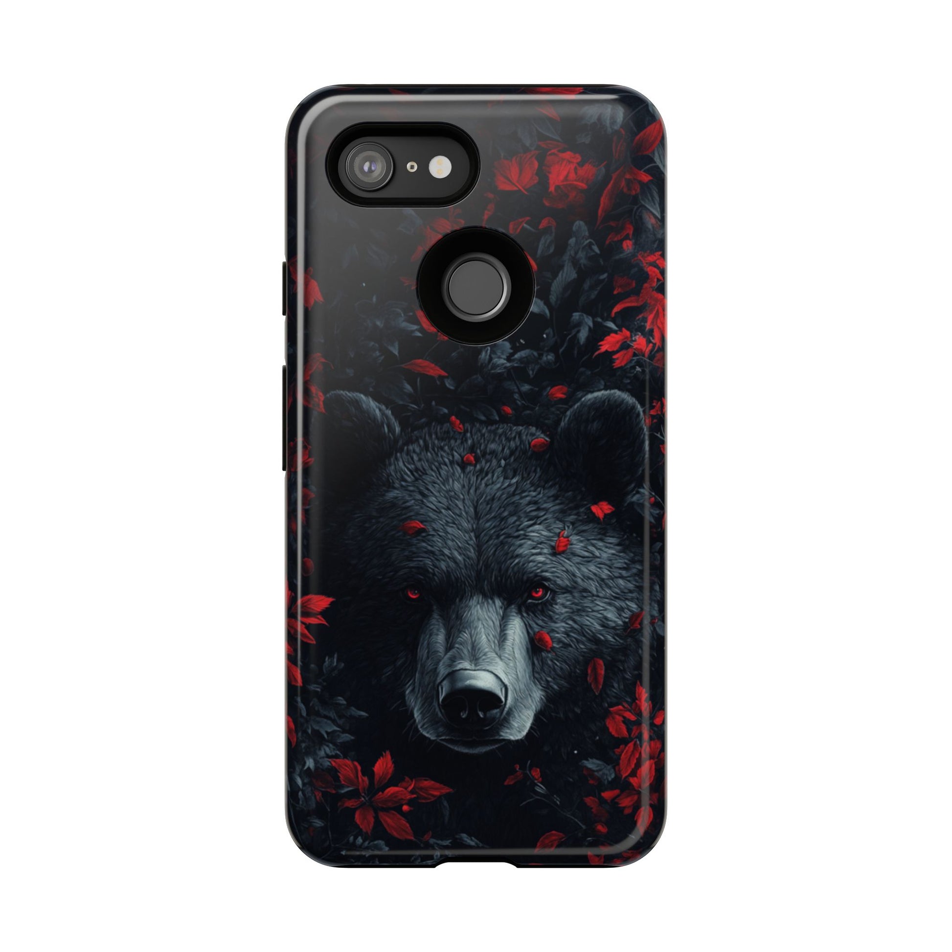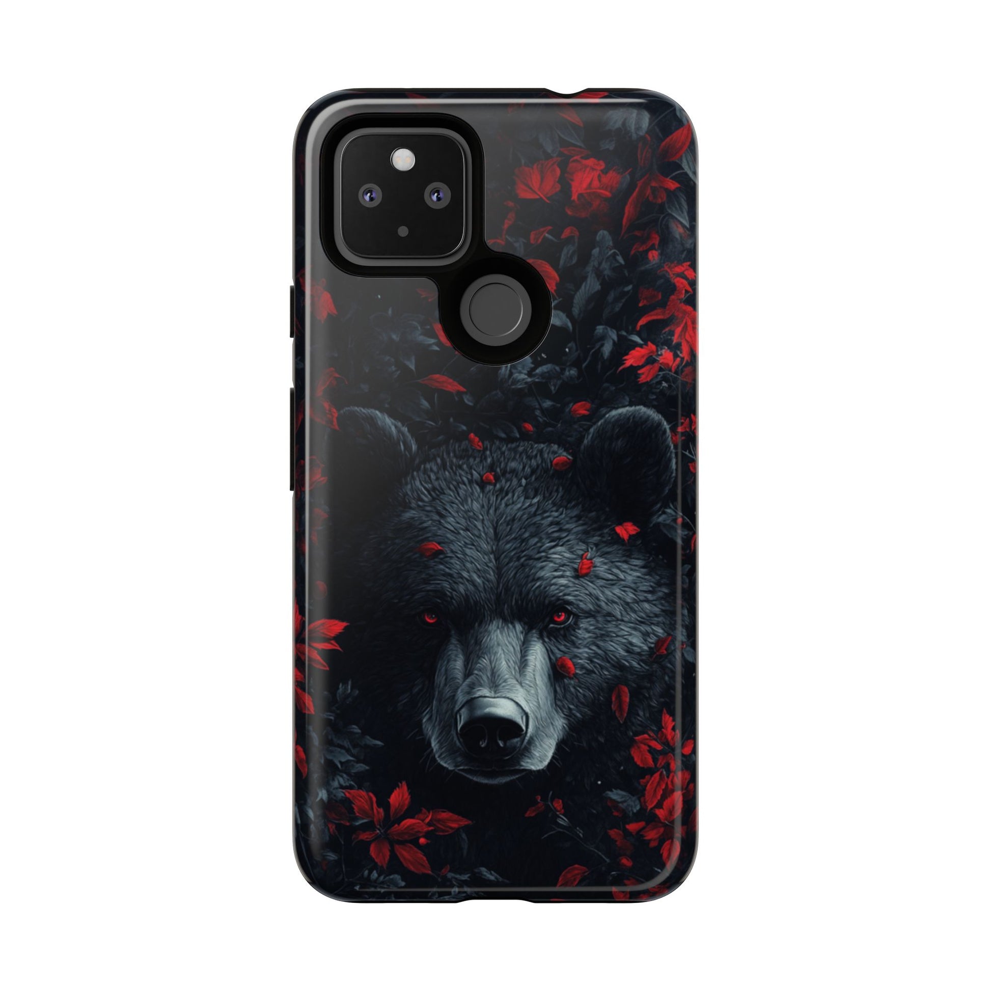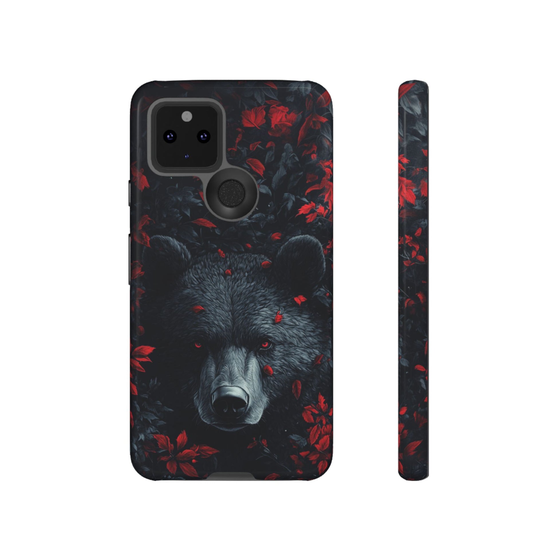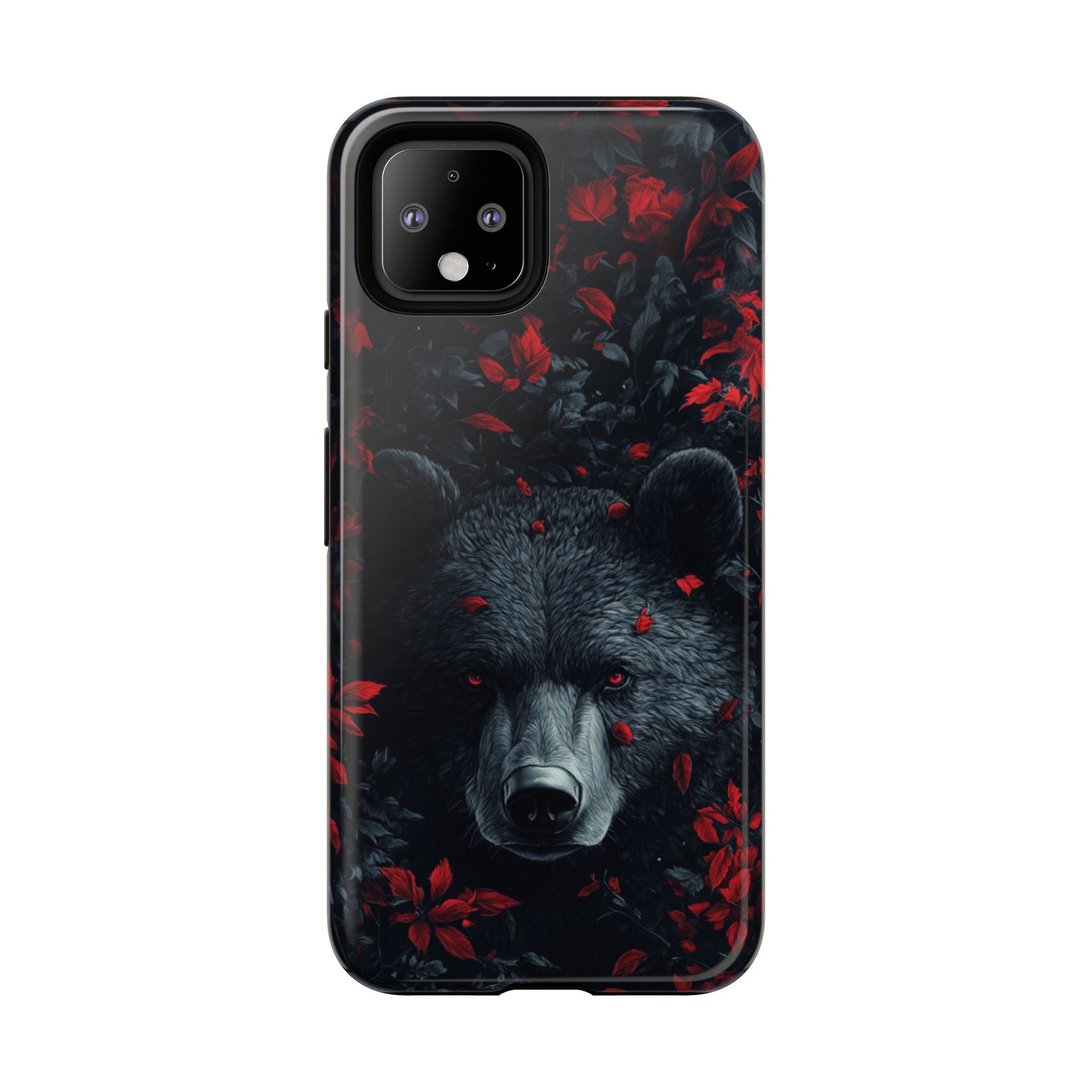 A coal‑furred bear with ember eyes lurks amid a halo of red leaves, ready to guard your Google Pixel. High‑definition detail pairs with impact‑resistant dual‑layer construction for everyday protection.