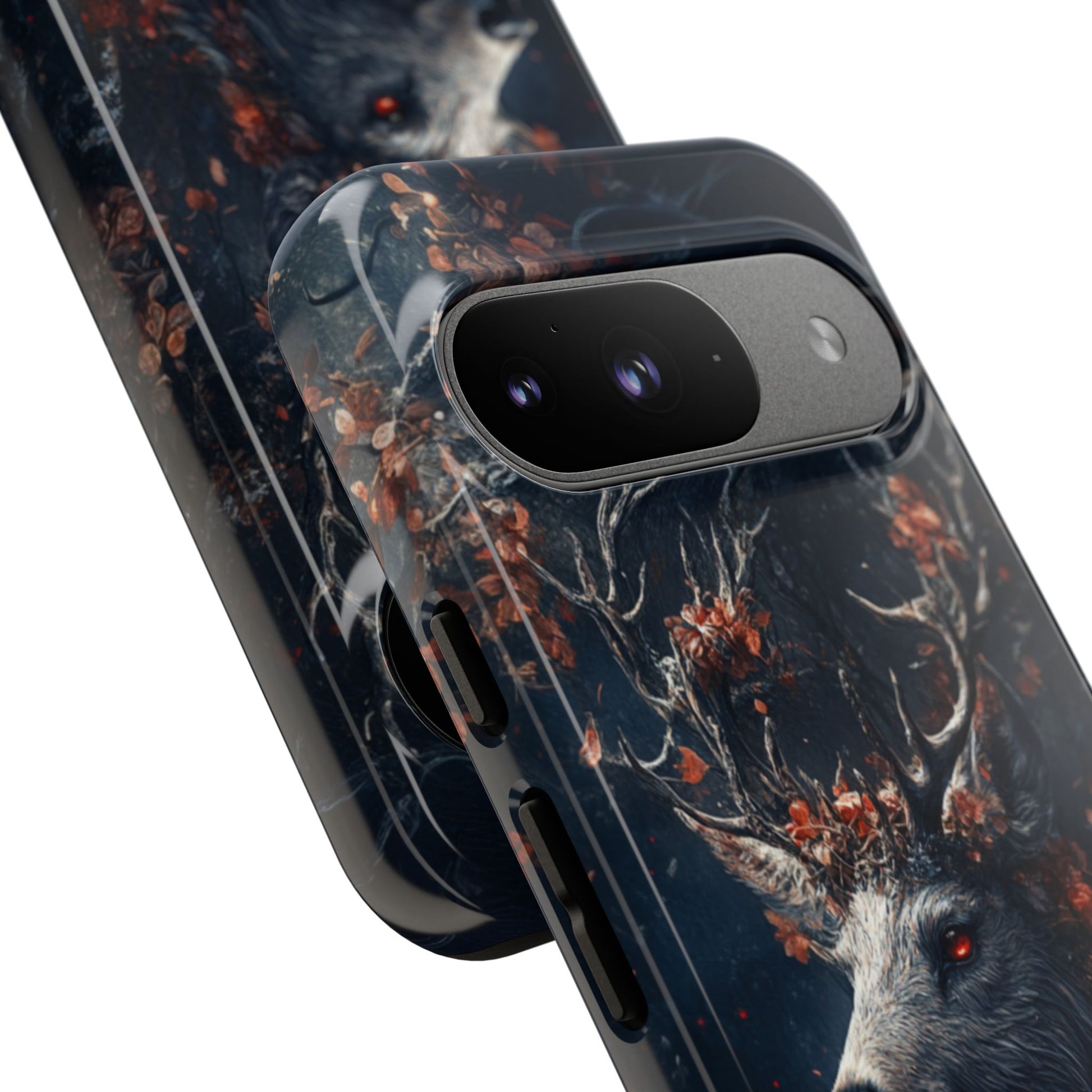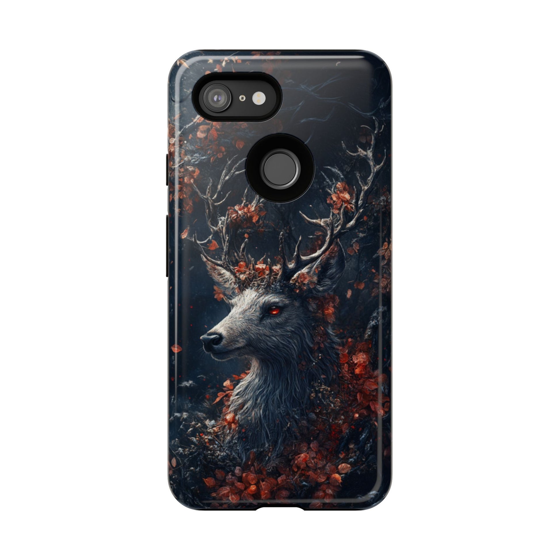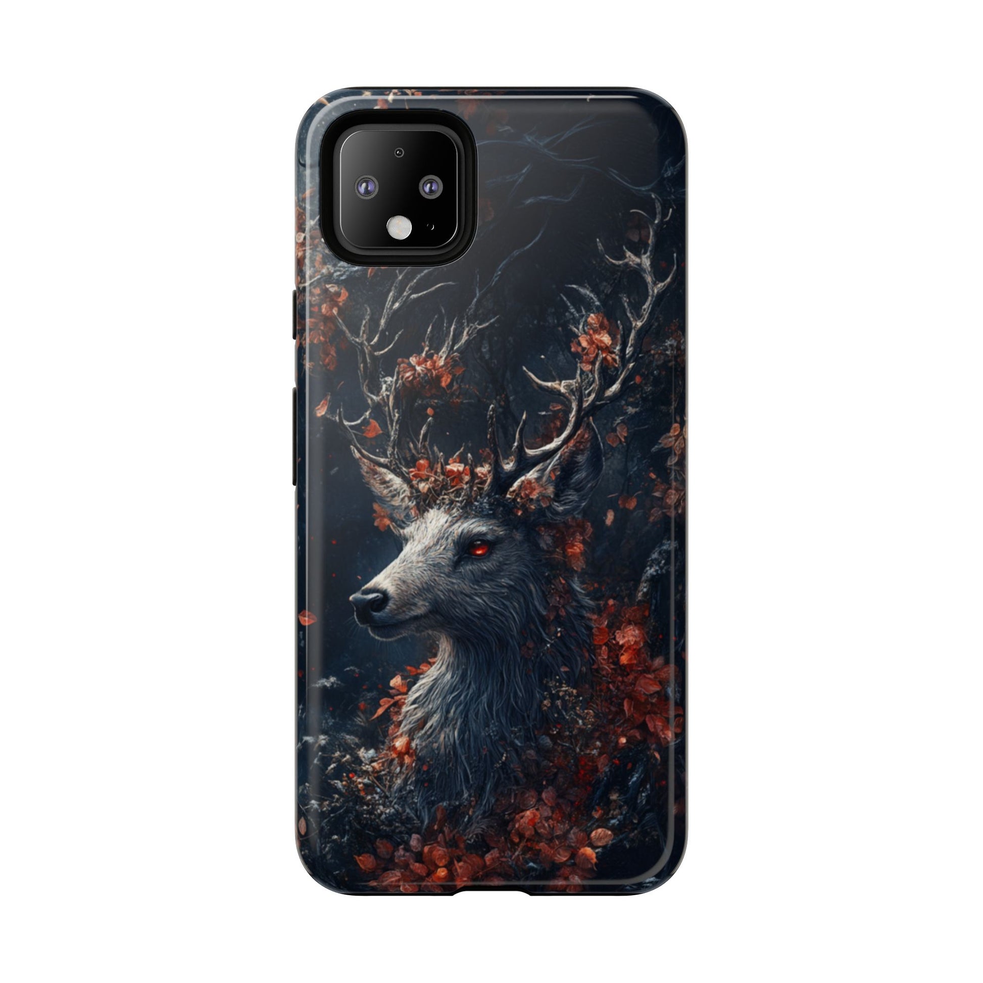 A pale stag spirit rises from shadowy roots, crimson foliage swirling around its antlers in an enchanted dusk. This high‑definition scene adorns your Google Pixel while impact‑resistant dual‑layer construction keeps it safe day to night.