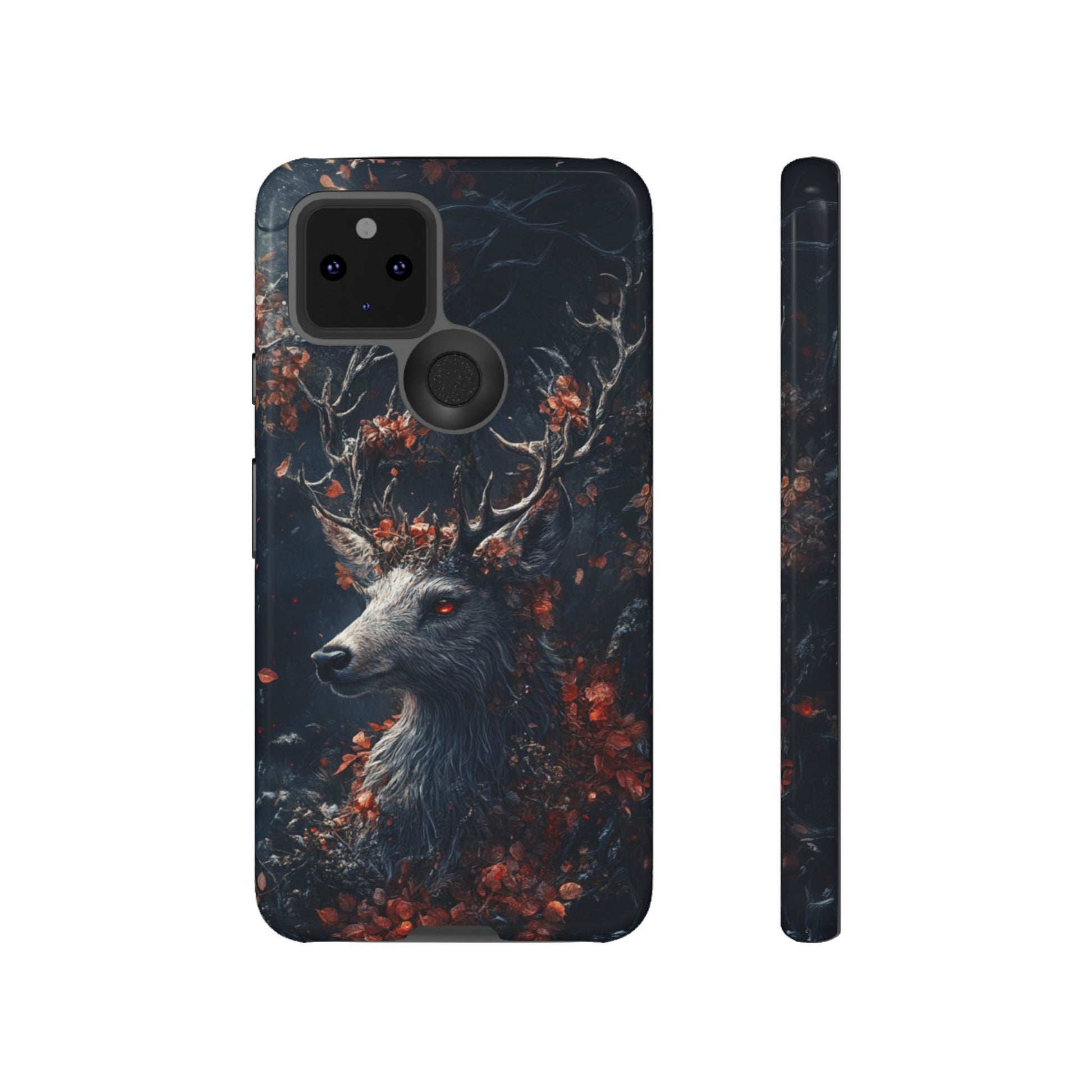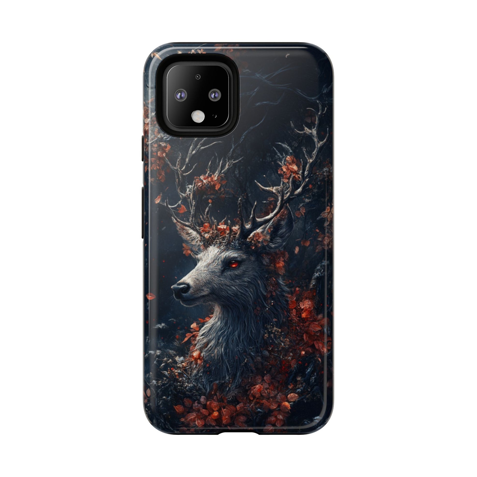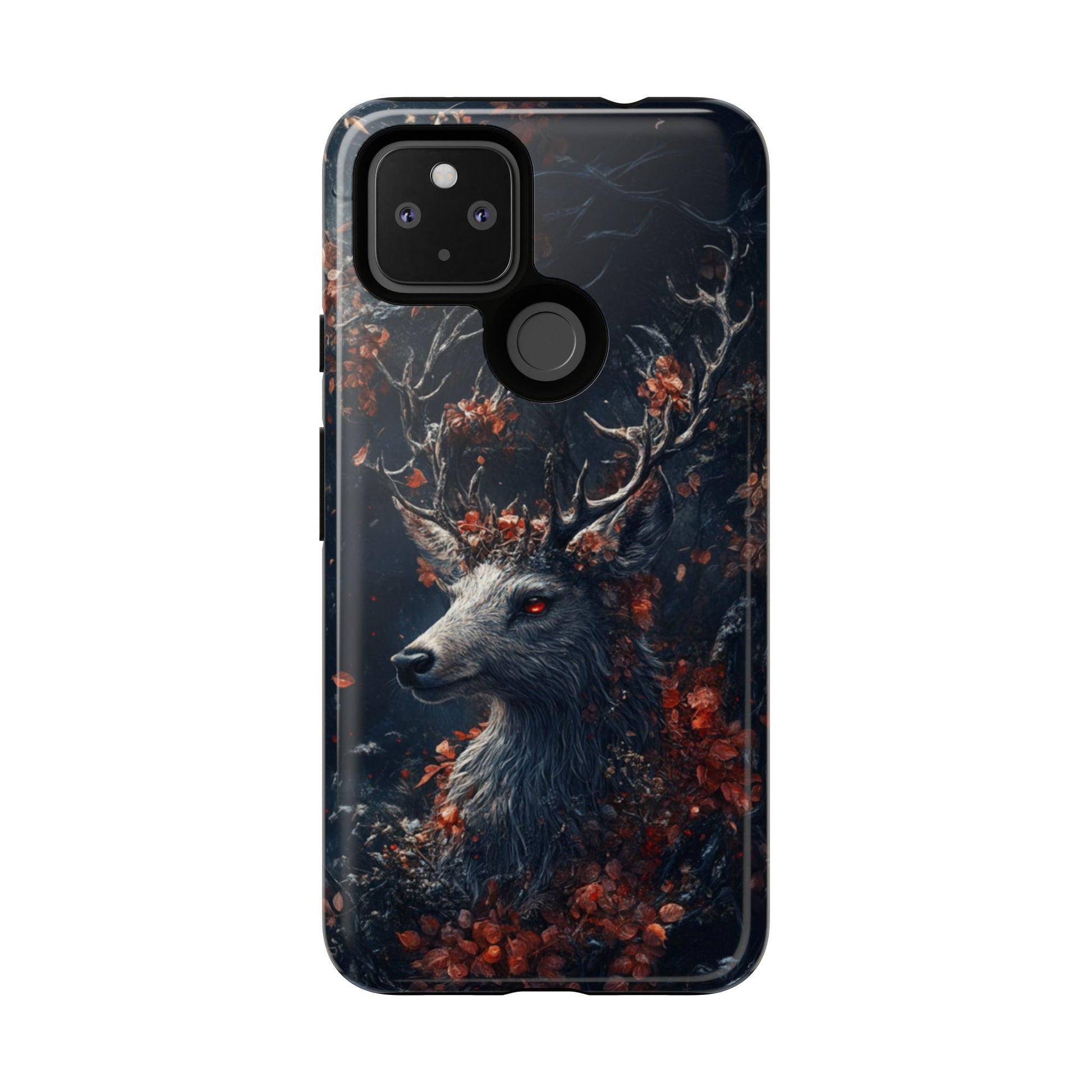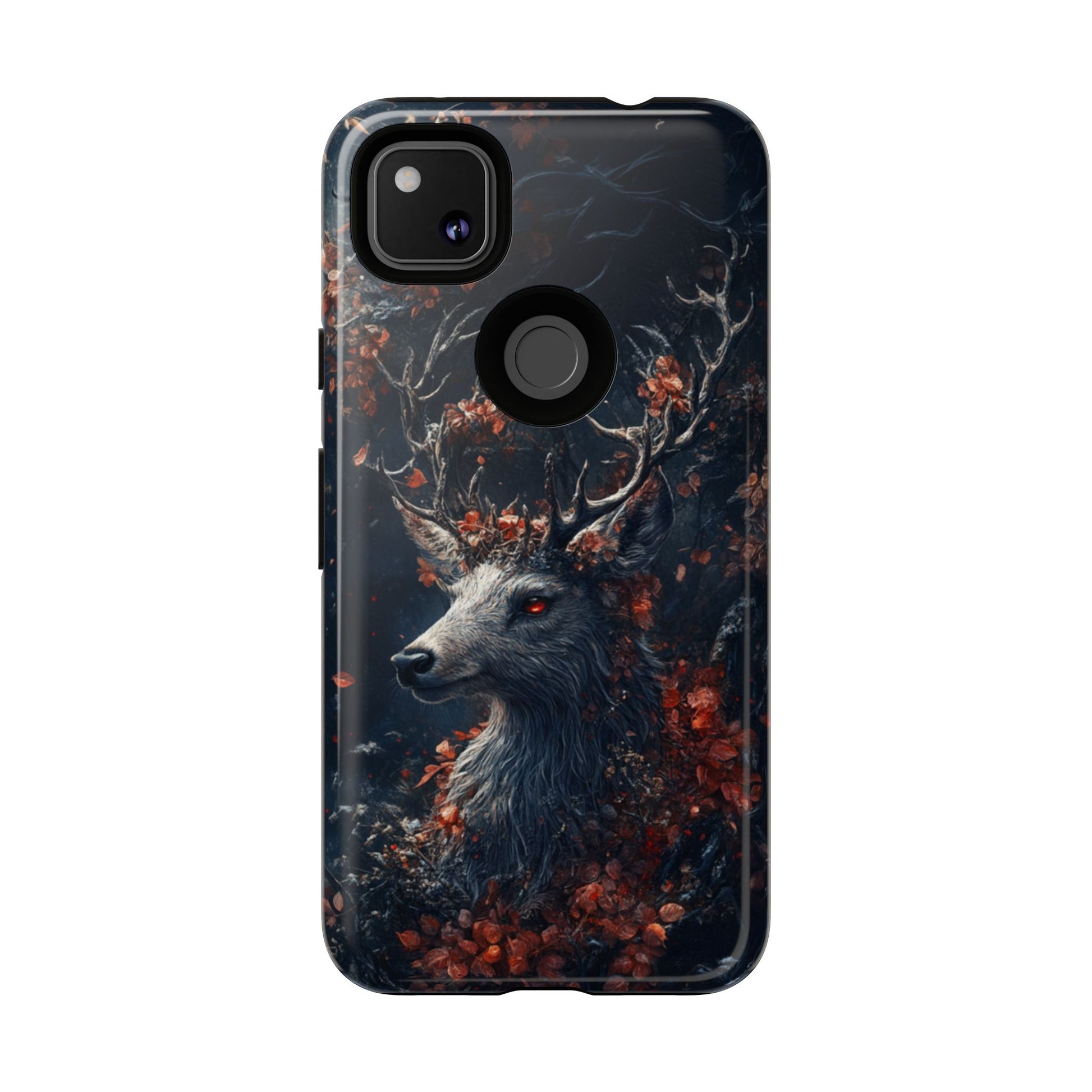 A pale stag spirit rises from shadowy roots, crimson foliage swirling around its antlers in an enchanted dusk. This high‑definition scene adorns your Google Pixel while impact‑resistant dual‑layer construction keeps it safe day to night.