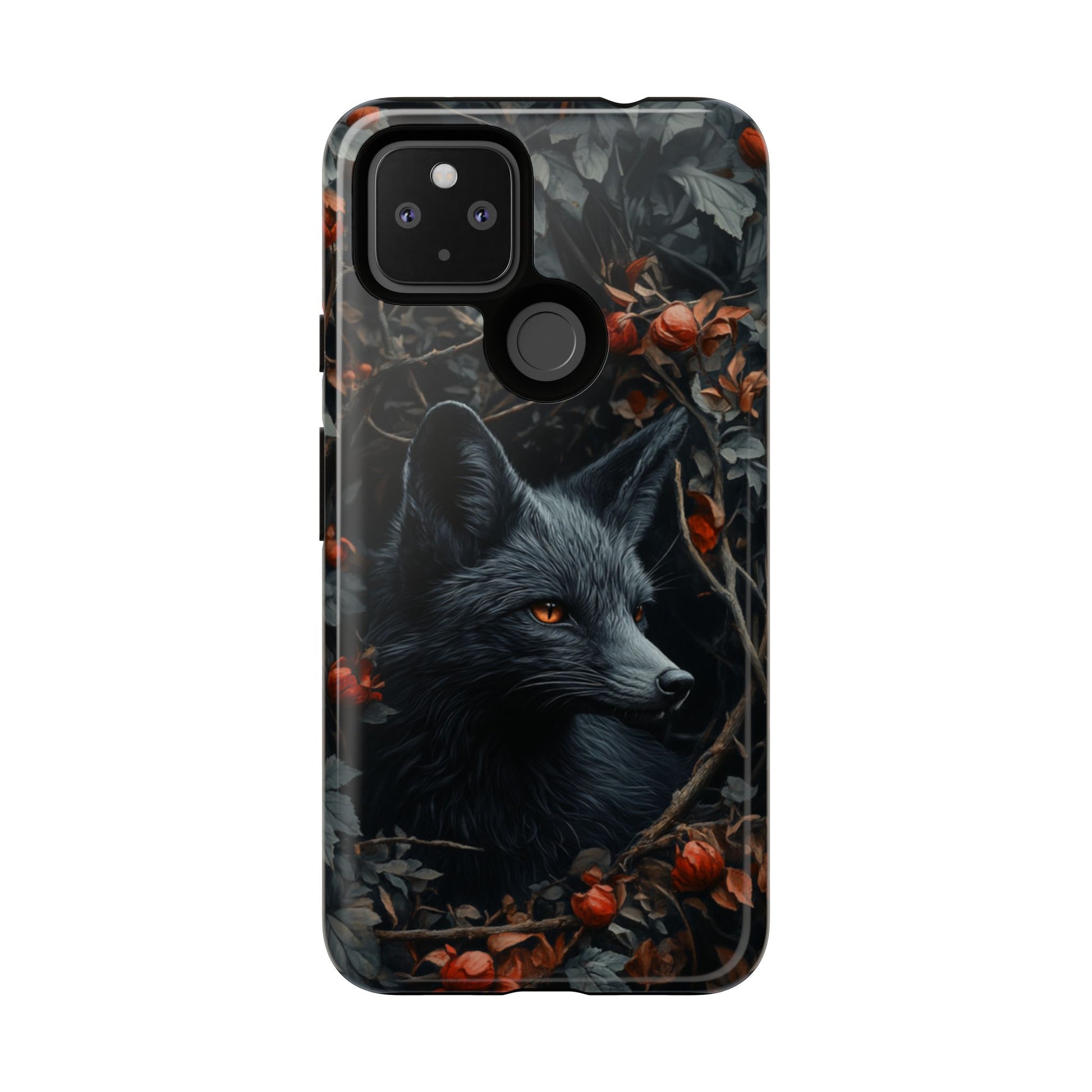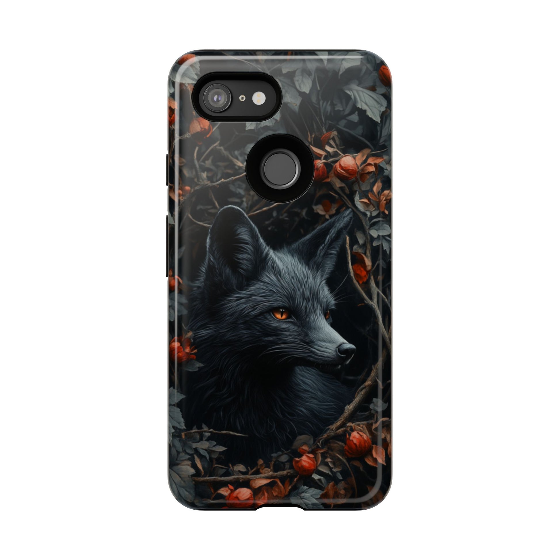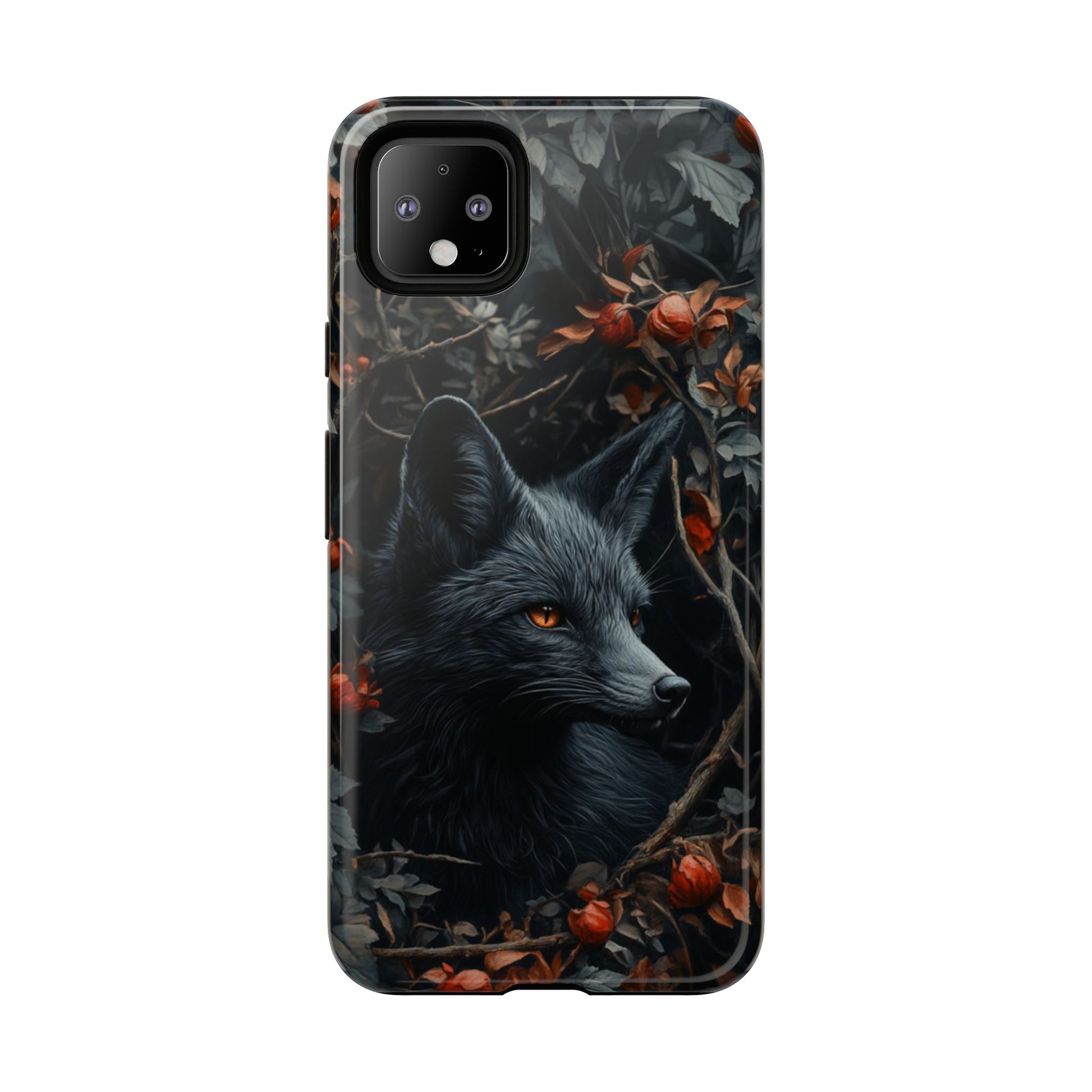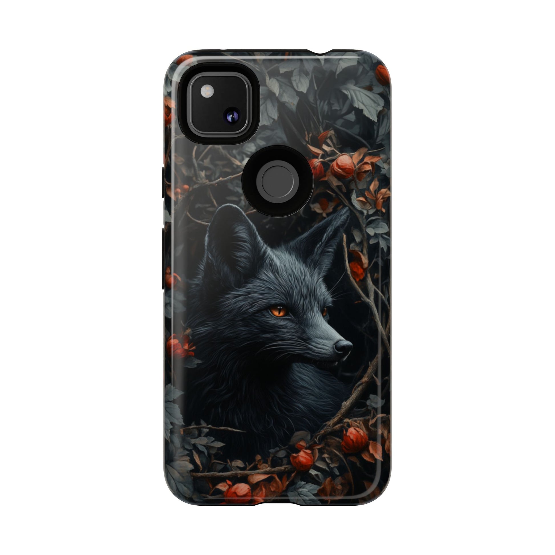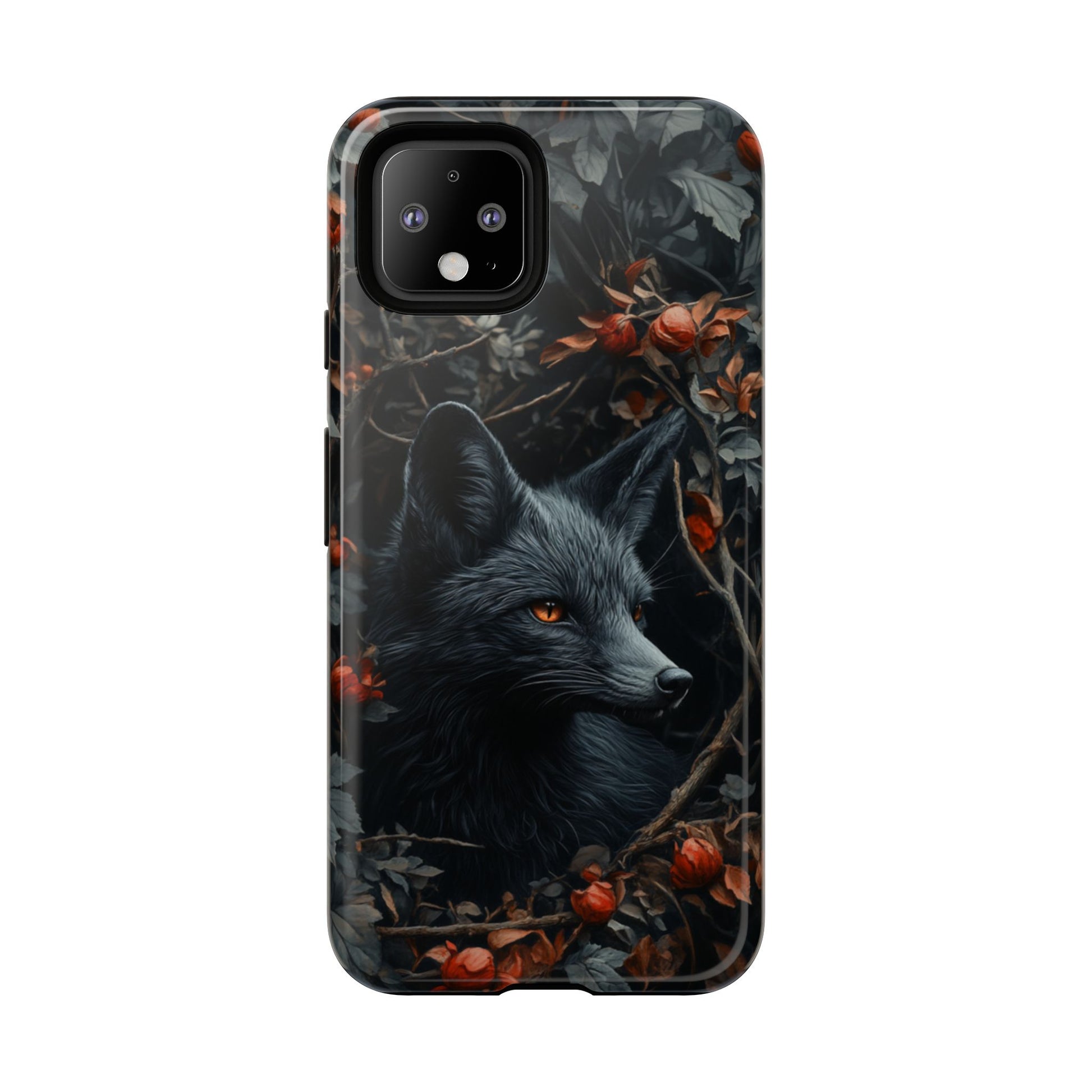 A coal‑black fox with fiery eyes lies hidden among shadowed foliage and glowing seedpods. This high‑definition scene adorns your Google Pixel while impact‑resistant dual‑layer construction keeps it safe day and night.
