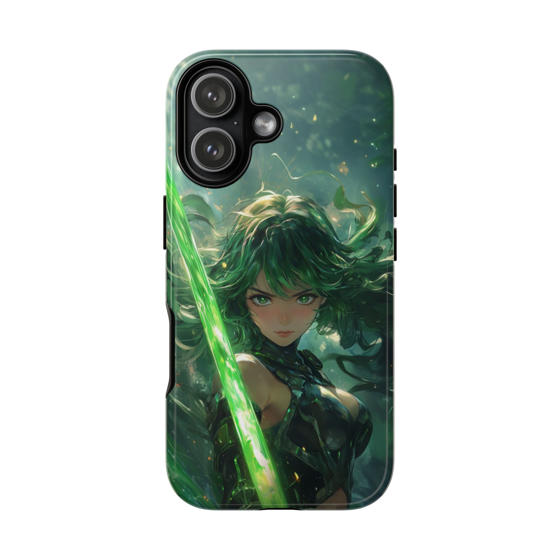 A fierce anime guardian wields a glowing green energy sword, her hair swirling like forest leaves in dappled sunlight. This wrap‑around print channels nature‑charged power to your iPhone while shielding it with a rugged dual‑layer shell.