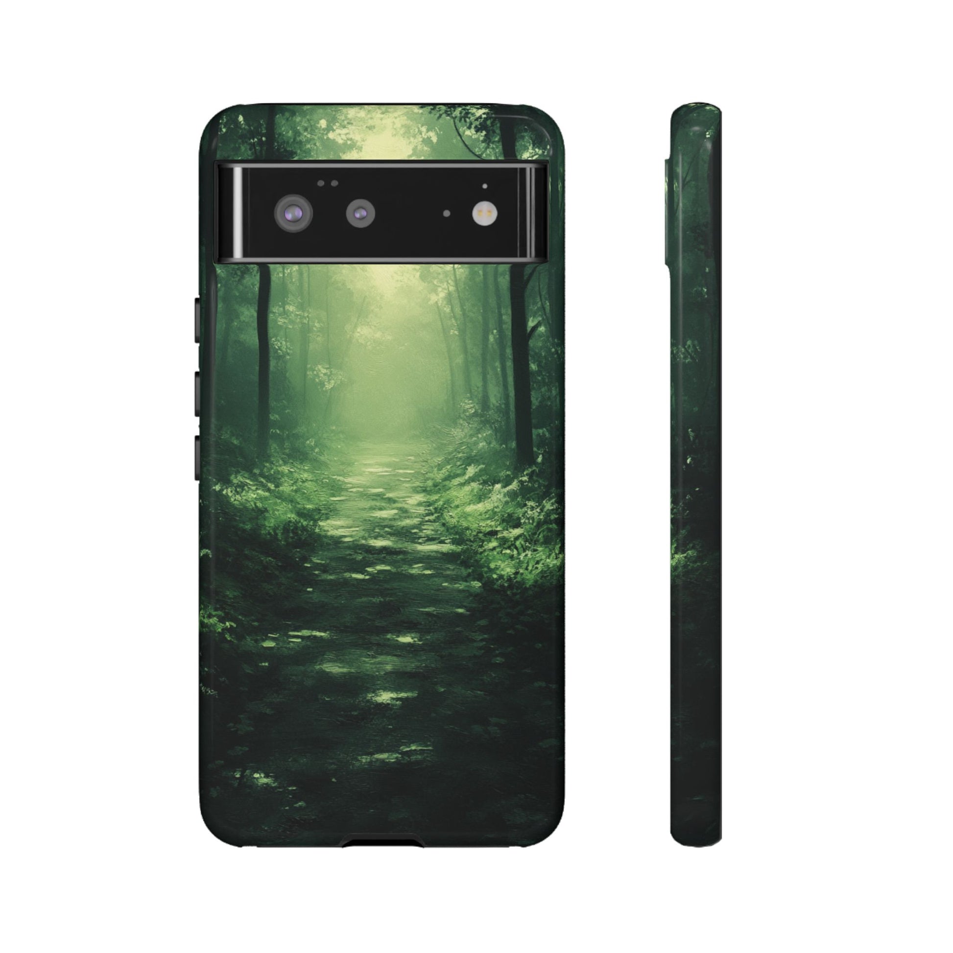 Protect your Google Pixel with our premium Emerald Mist Forest Path phone case featuring a serene forest path winding through lush green trees with ethereal emerald mist and glowing light. This robust Pixel case delivers outstanding drop protection while showcasing peaceful nature artwork perfect for Pixel users who appreciate serene forest landscapes.