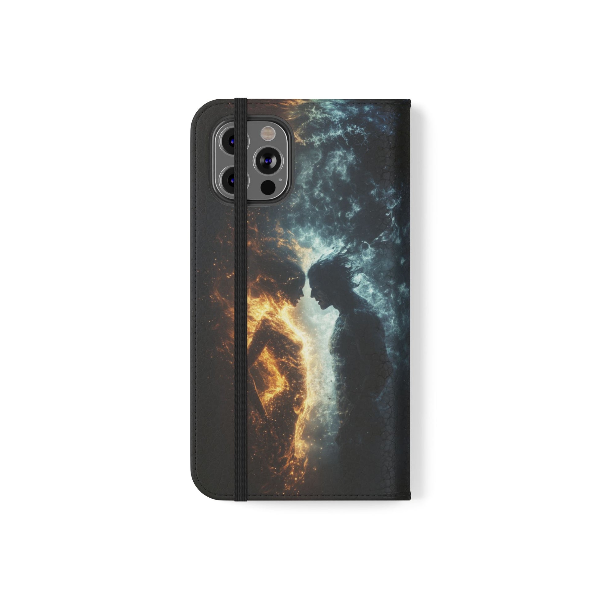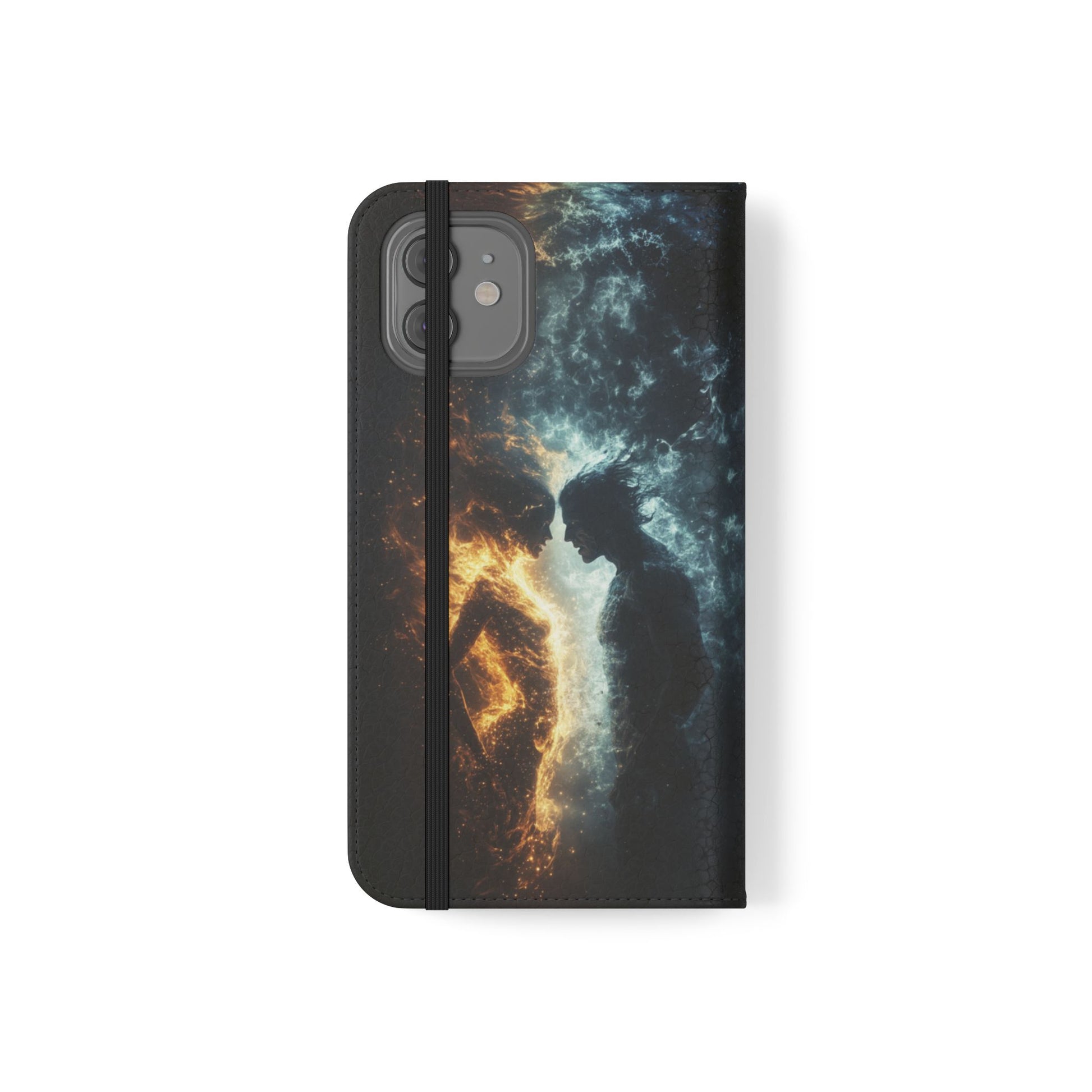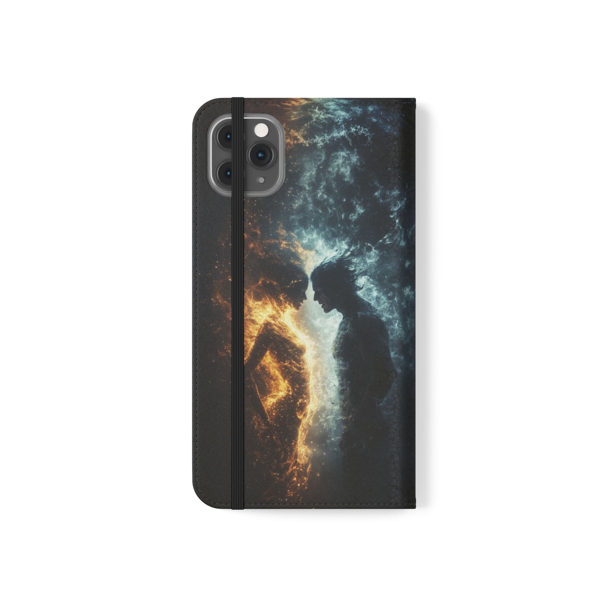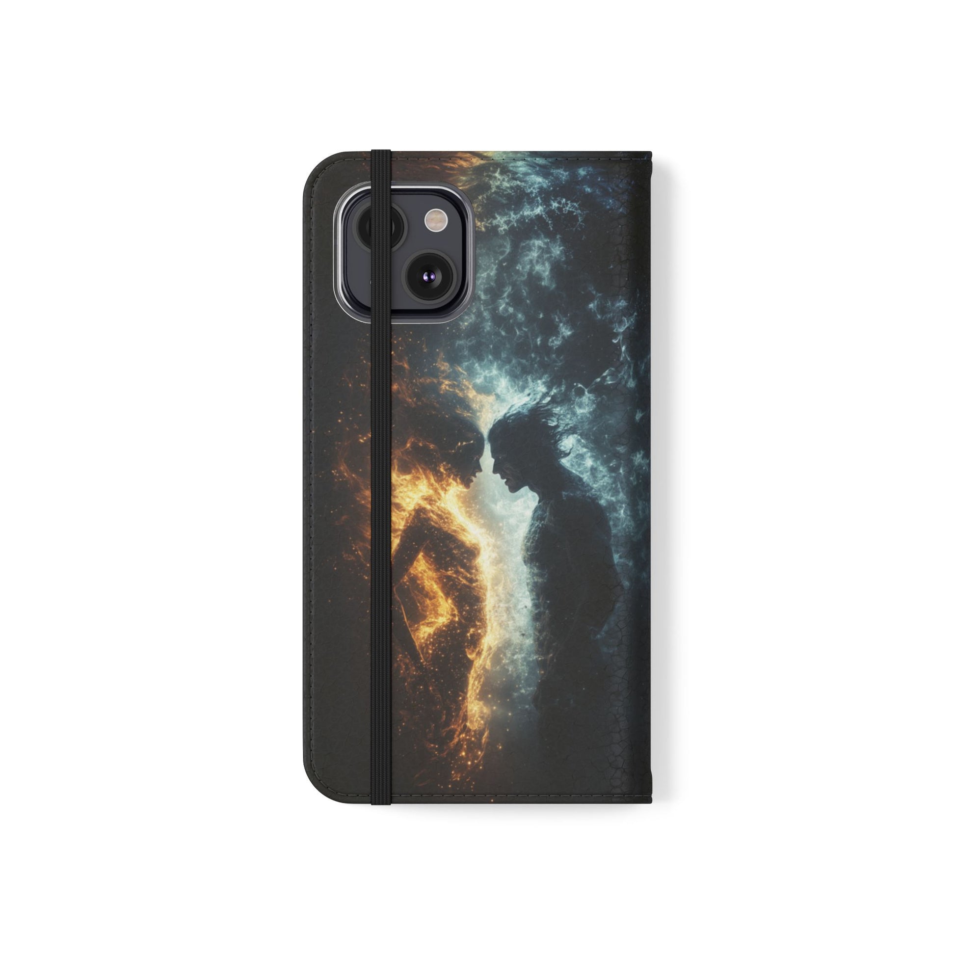 Protect your phone with our premium Fire & Frost Lovers wallet case featuring two silhouetted lovers about to kiss with one embodying blazing orange fire and the other cool blue ice elements merging together. This versatile flip case combines wallet functionality with comprehensive phone protection, card storage, and stunning romantic elemental artwork.