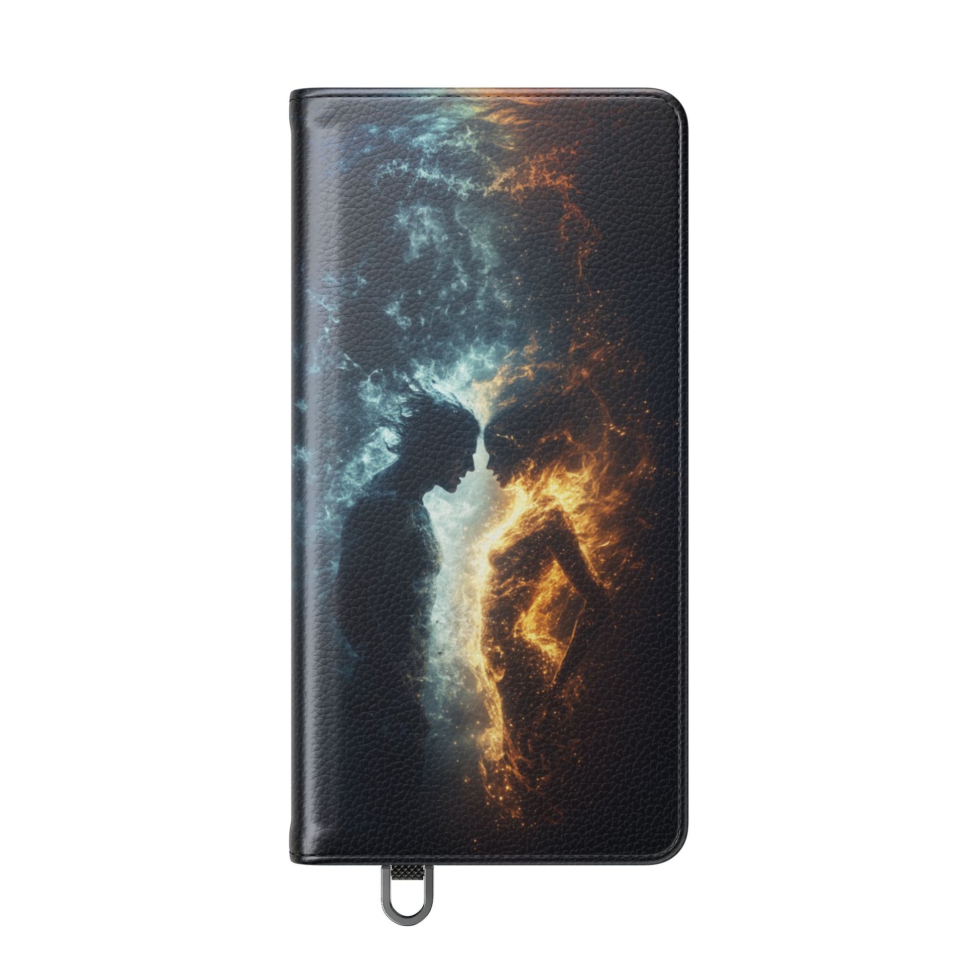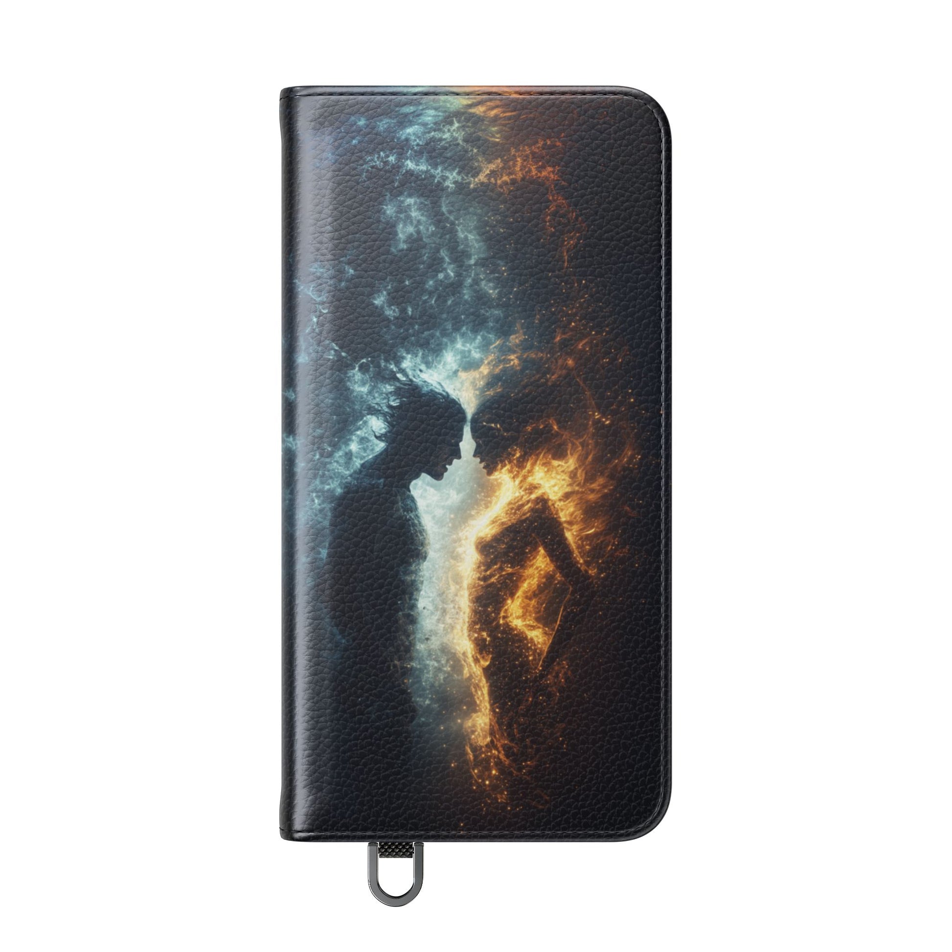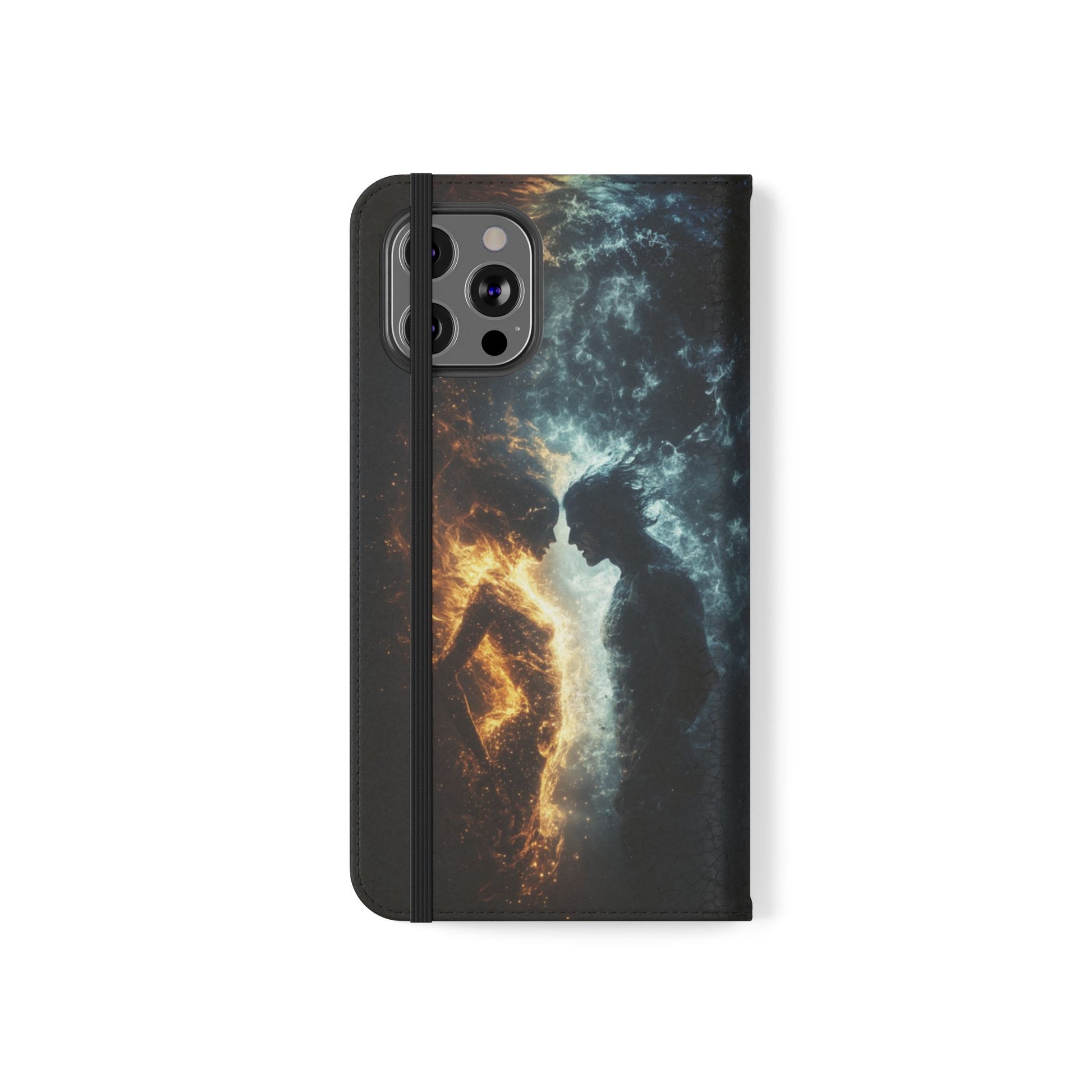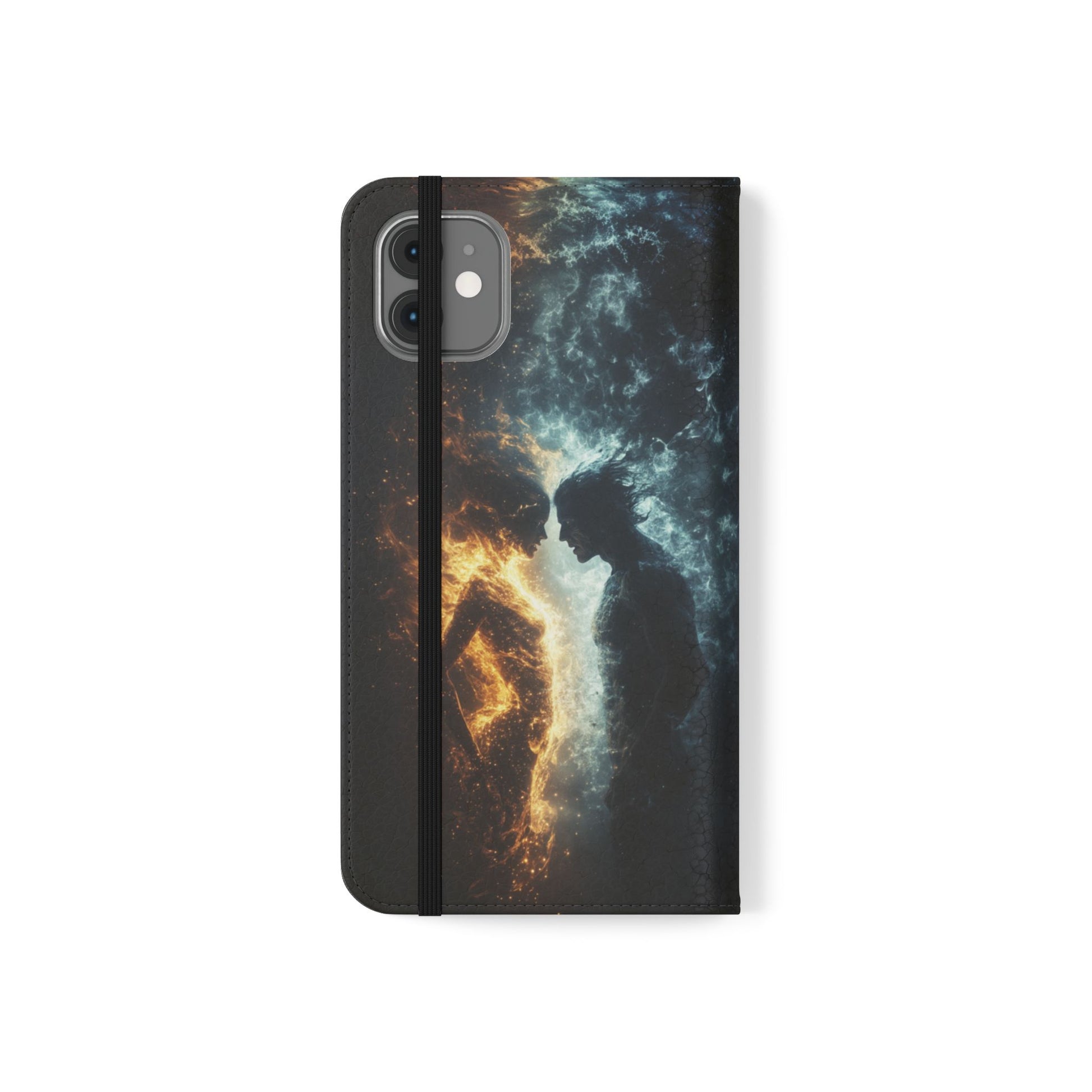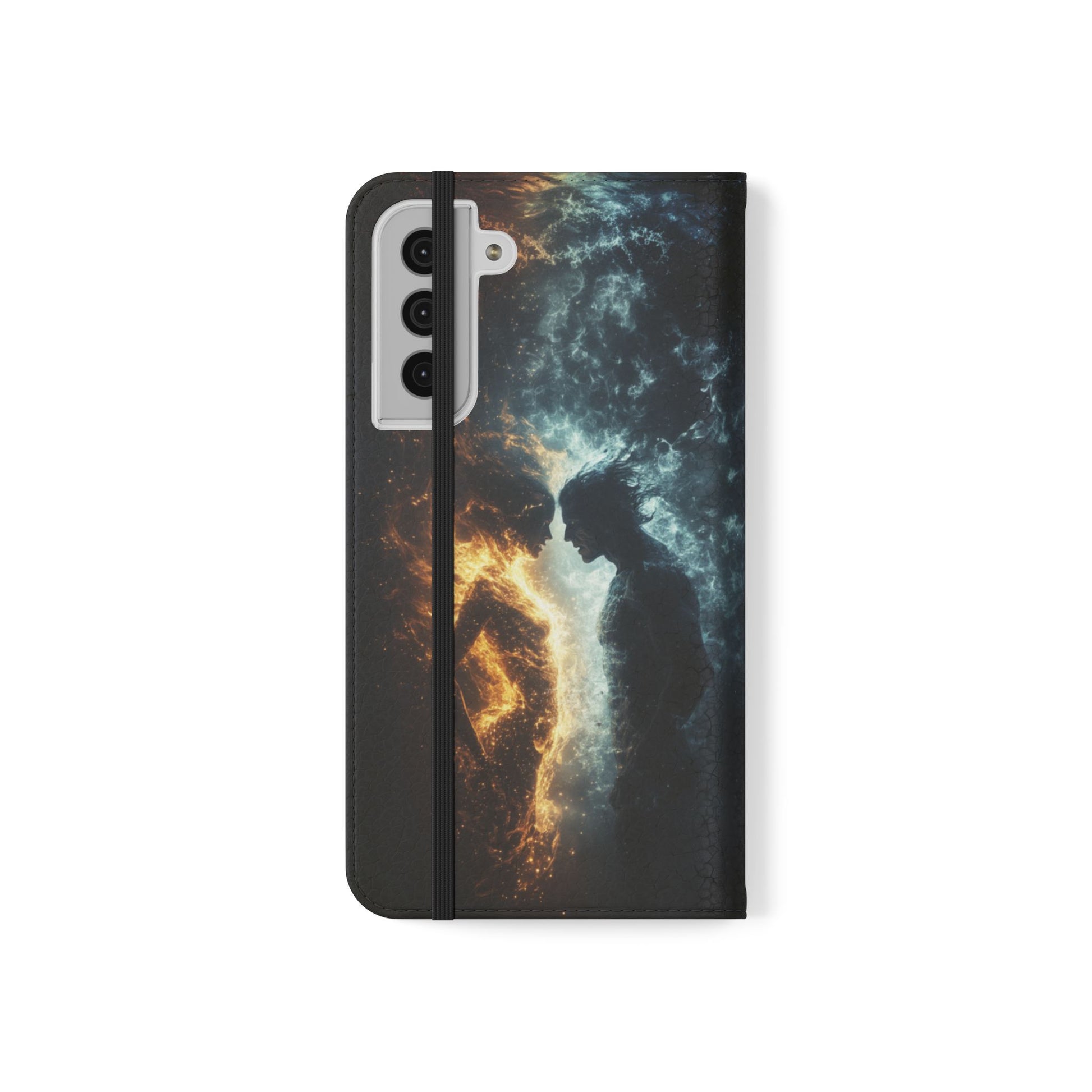 Protect your phone with our premium Fire & Frost Lovers wallet case featuring two silhouetted lovers about to kiss with one embodying blazing orange fire and the other cool blue ice elements merging together. This versatile flip case combines wallet functionality with comprehensive phone protection, card storage, and stunning romantic elemental artwork.