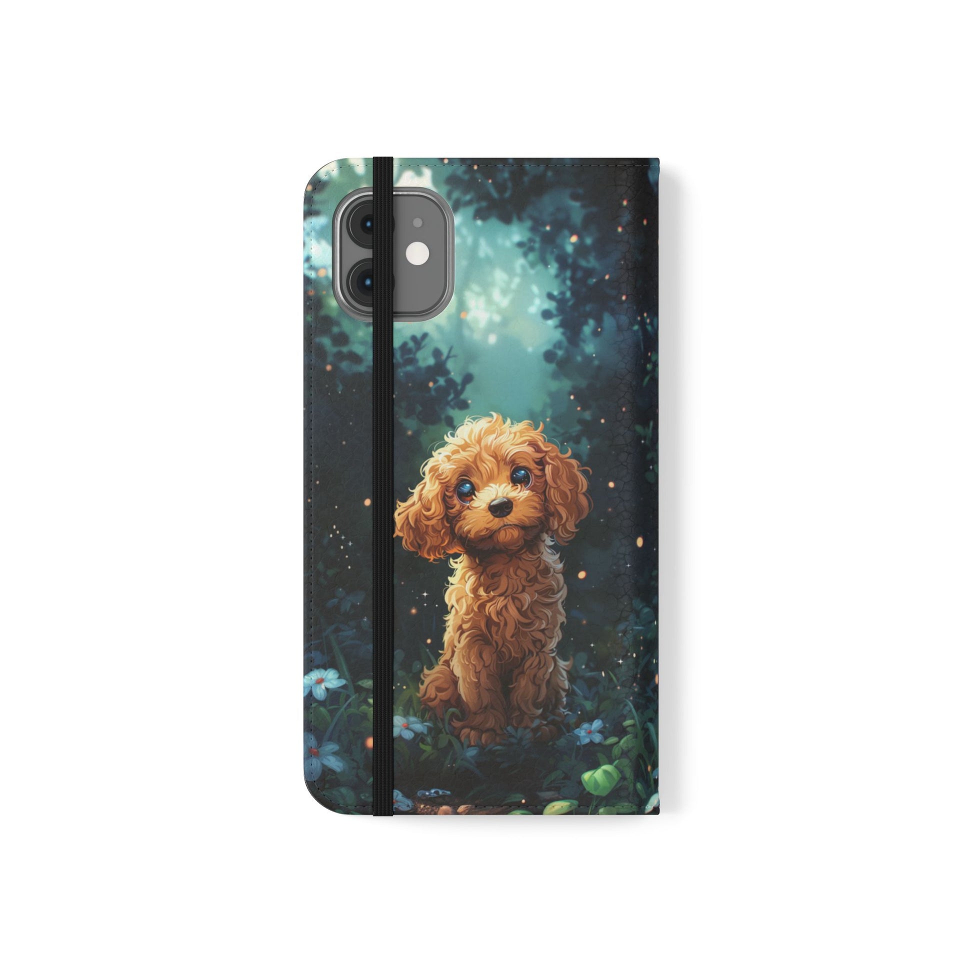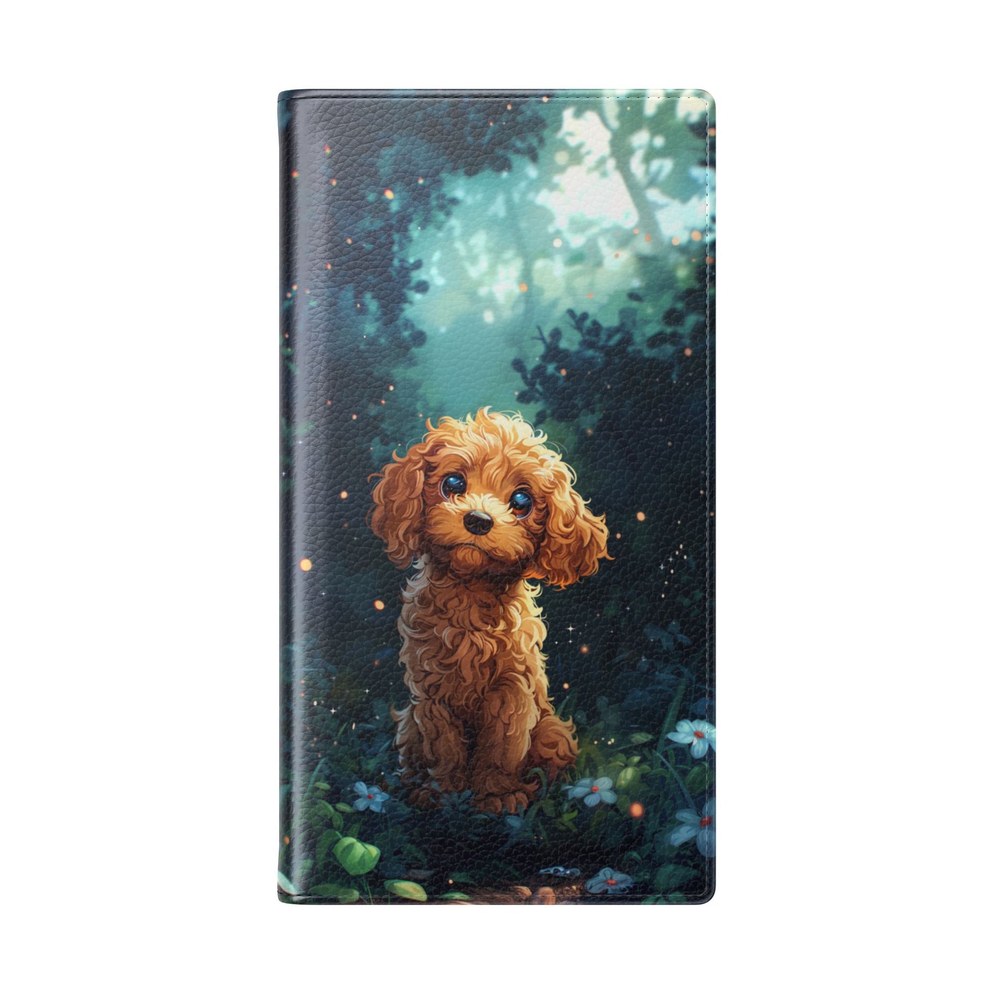 Step into a magical world with our captivating Forest Poodle Wallet Flip Case. This captivating design features an adorable golden poodle with luxuriously curly coat and soulful dark eyes, sitting gracefully in a mystical forest setting. The scene is illuminated by ethereal sunbeams filtering through ancient trees, while magical sparkles and fairy lights dance throughout the enchanted woodland. Delicate blue wildflowers carpet the forest floor, creating a whimsical fairy-tale atmosphere. The poodle's beautifully textured curls and gentle expression radiate warmth and charm, while the mystical forest backdrop with its golden light rays and floating sparkles creates an otherworldly, magical ambiance. Perfect for poodle lovers, fantasy enthusiasts, or anyone who believes in the magic of nature and adorable companions.