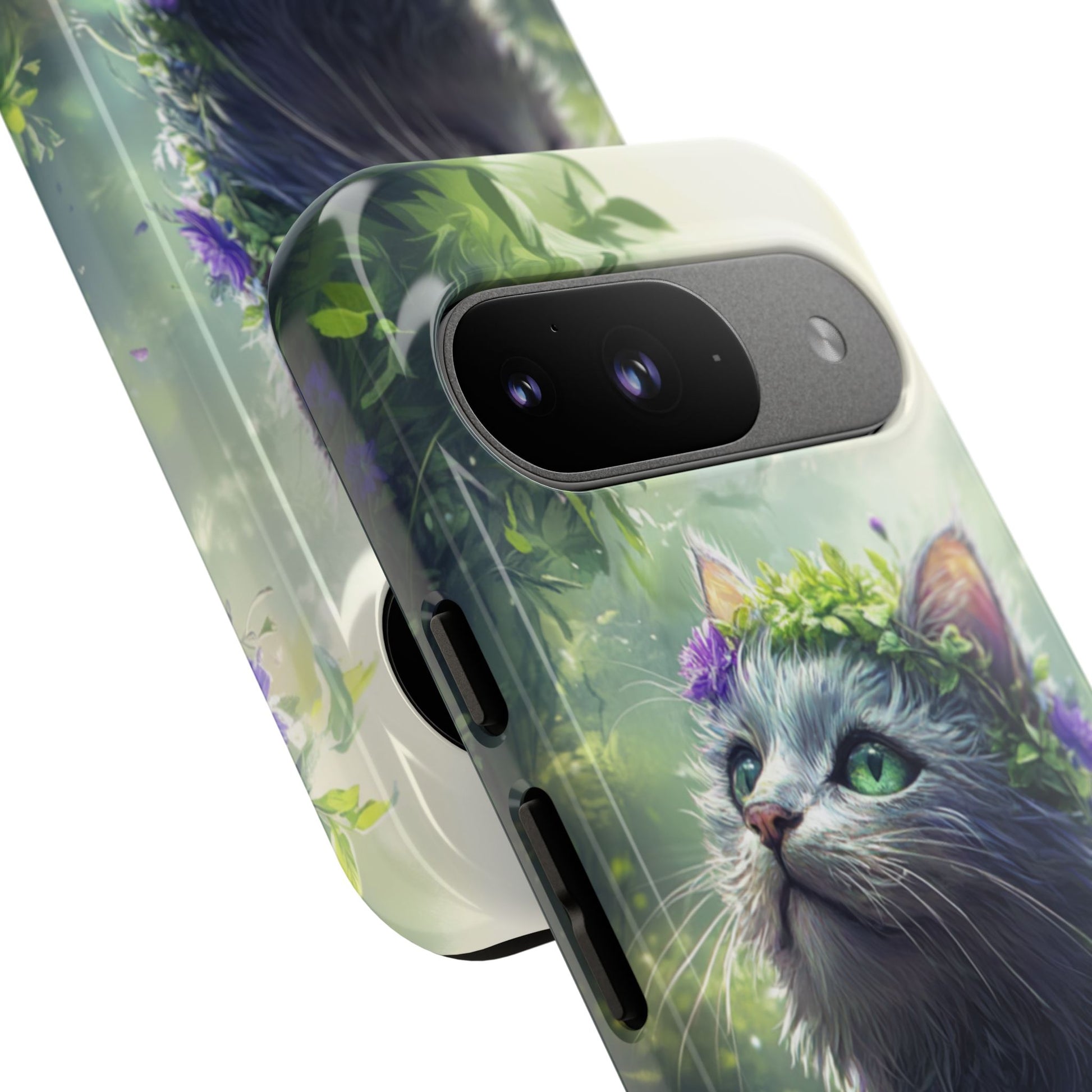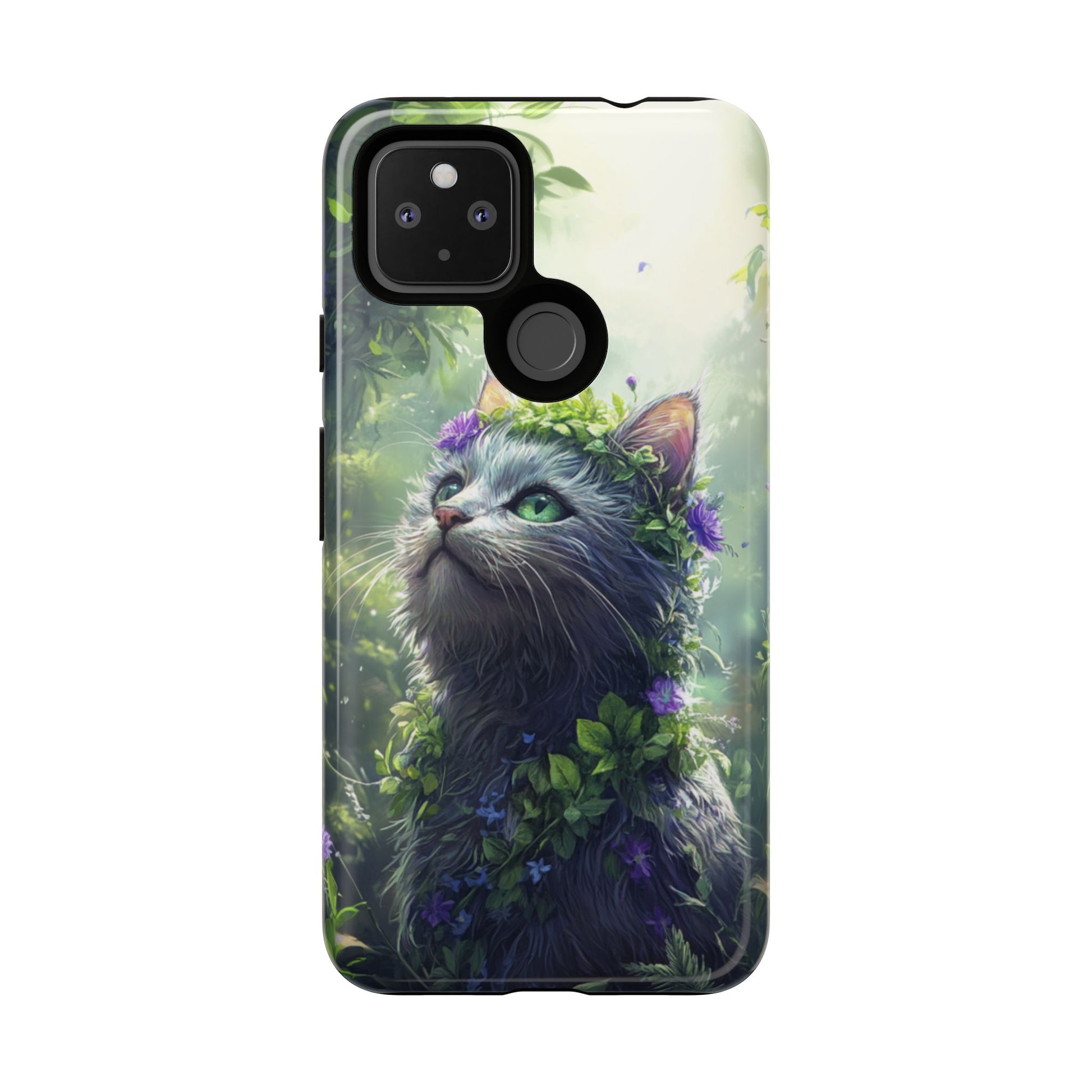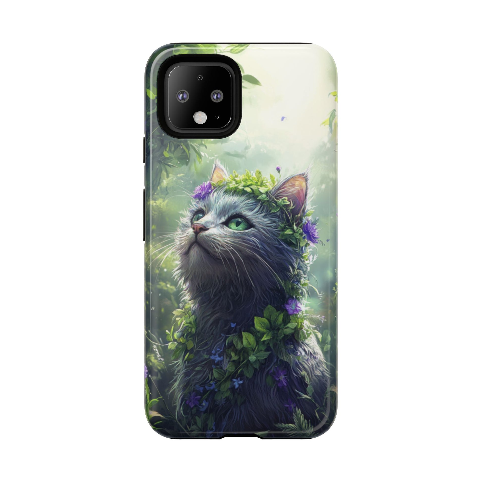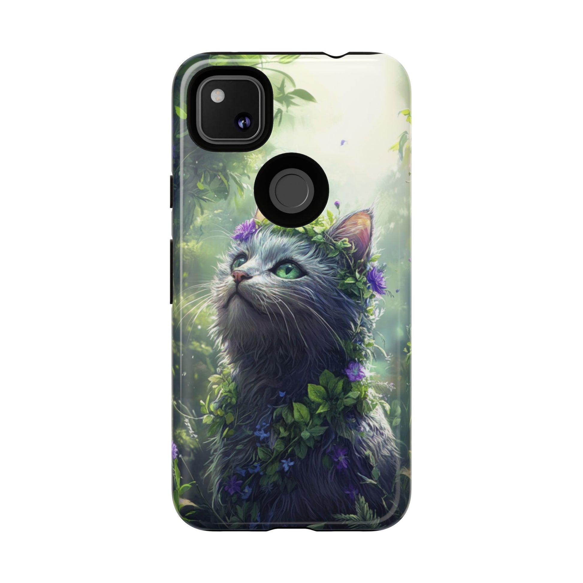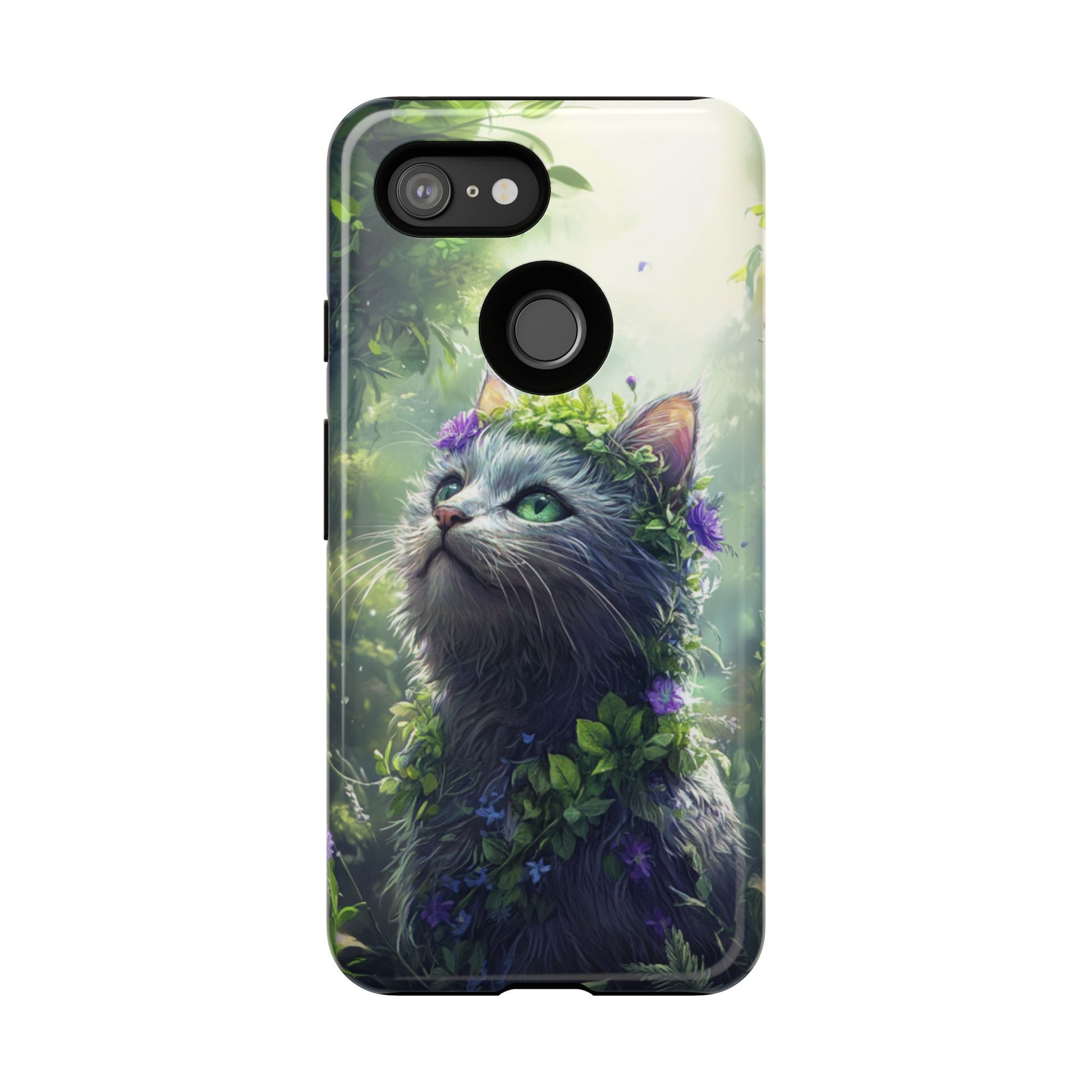 Enter an enchanted woodland realm with our mystical Forest Spirit Cat Google Pixel case. This captivating design features a beautiful gray cat adorned with a natural crown of purple wildflowers and fresh green foliage, gazing upward with striking emerald eyes toward dappled sunlight filtering through the forest canopy. Surrounded by lush vegetation and delicate purple blooms, this woodland guardian embodies the magical connection between feline grace and nature's spirit. The soft, dreamy lighting and rich botanical details create an atmosphere of wonder and tranquility. Perfect for cat lovers, nature enthusiasts, or anyone drawn to the mystical bond between animals and the natural world.