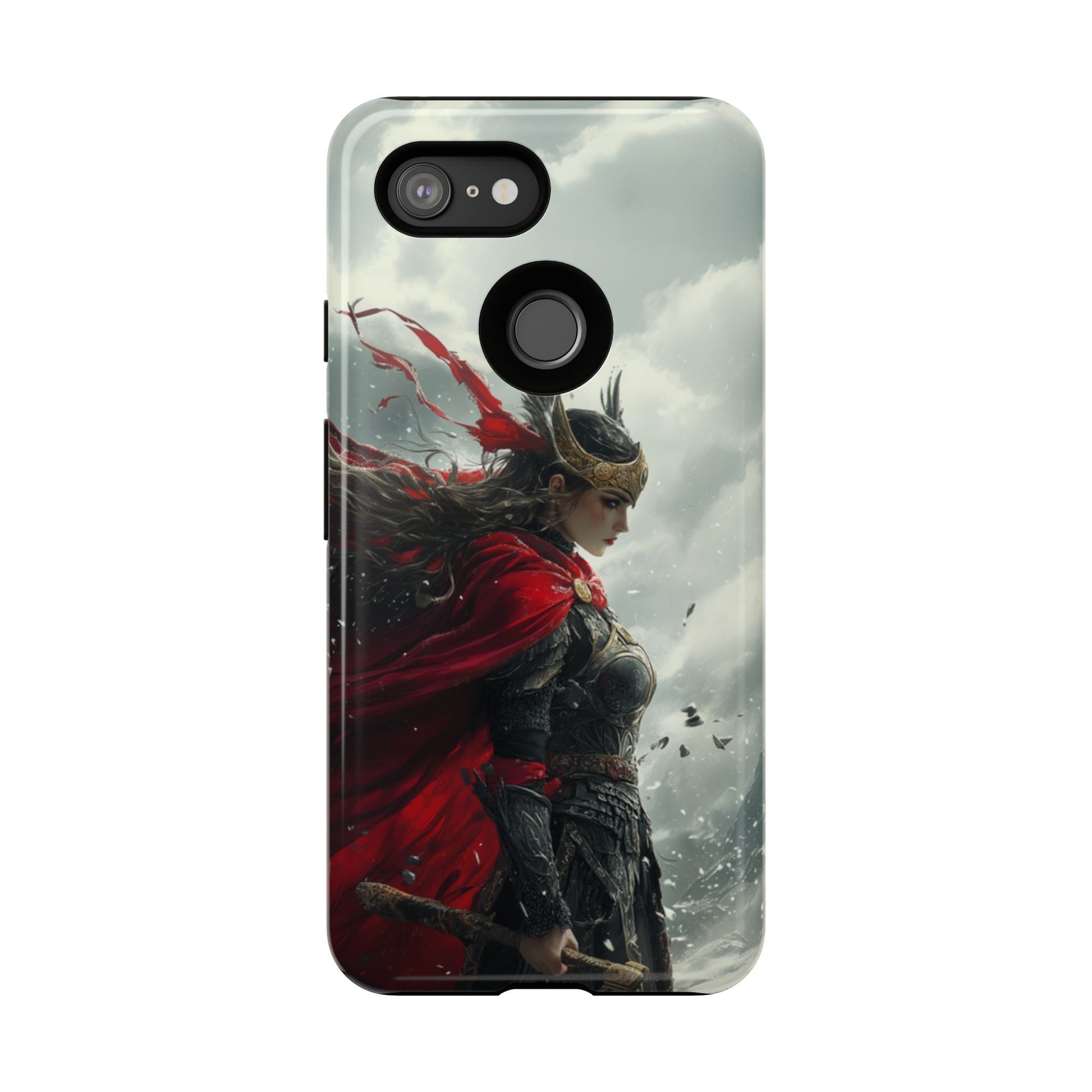 Freya, with frost‑kissed armor and crimson cloak, stands poised against swirling snow, embodying courage and grace. This detailed artwork pairs legendary Norse imagery with impact‑resistant dual‑layer protection for your Google Pixel.