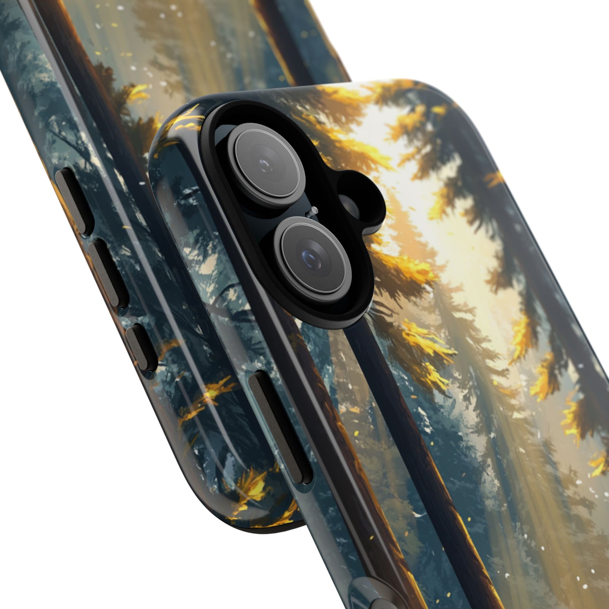 Morning sunlight pours through towering pines, illuminating a carpet of golden wildflowers along a tranquil forest trail. This wrap‑around print brings calming woodland magic to your iPhone while safeguarding it with dual‑layer protection.