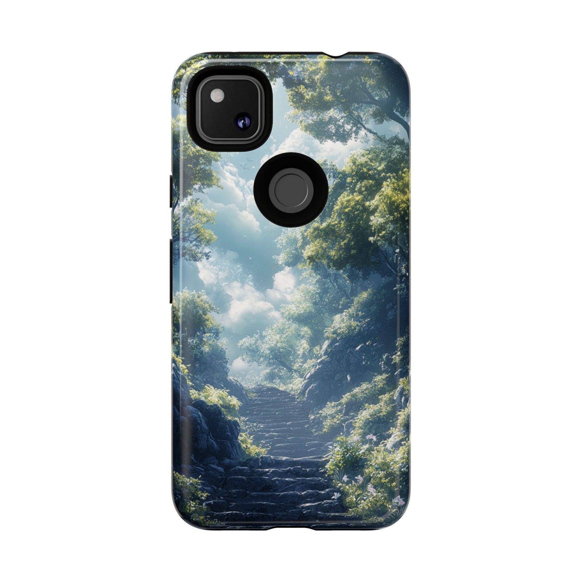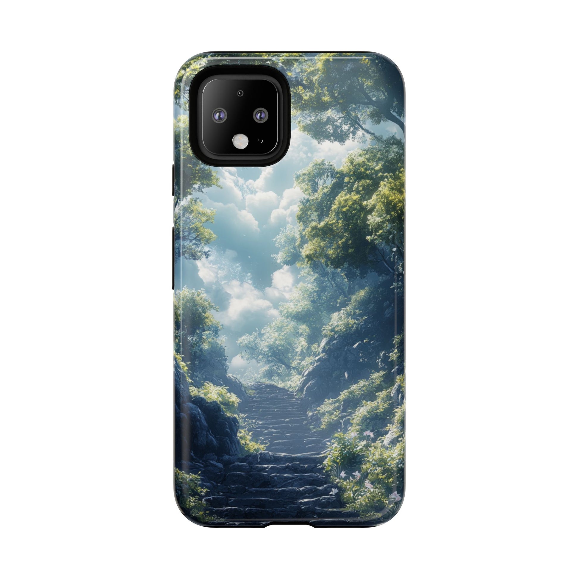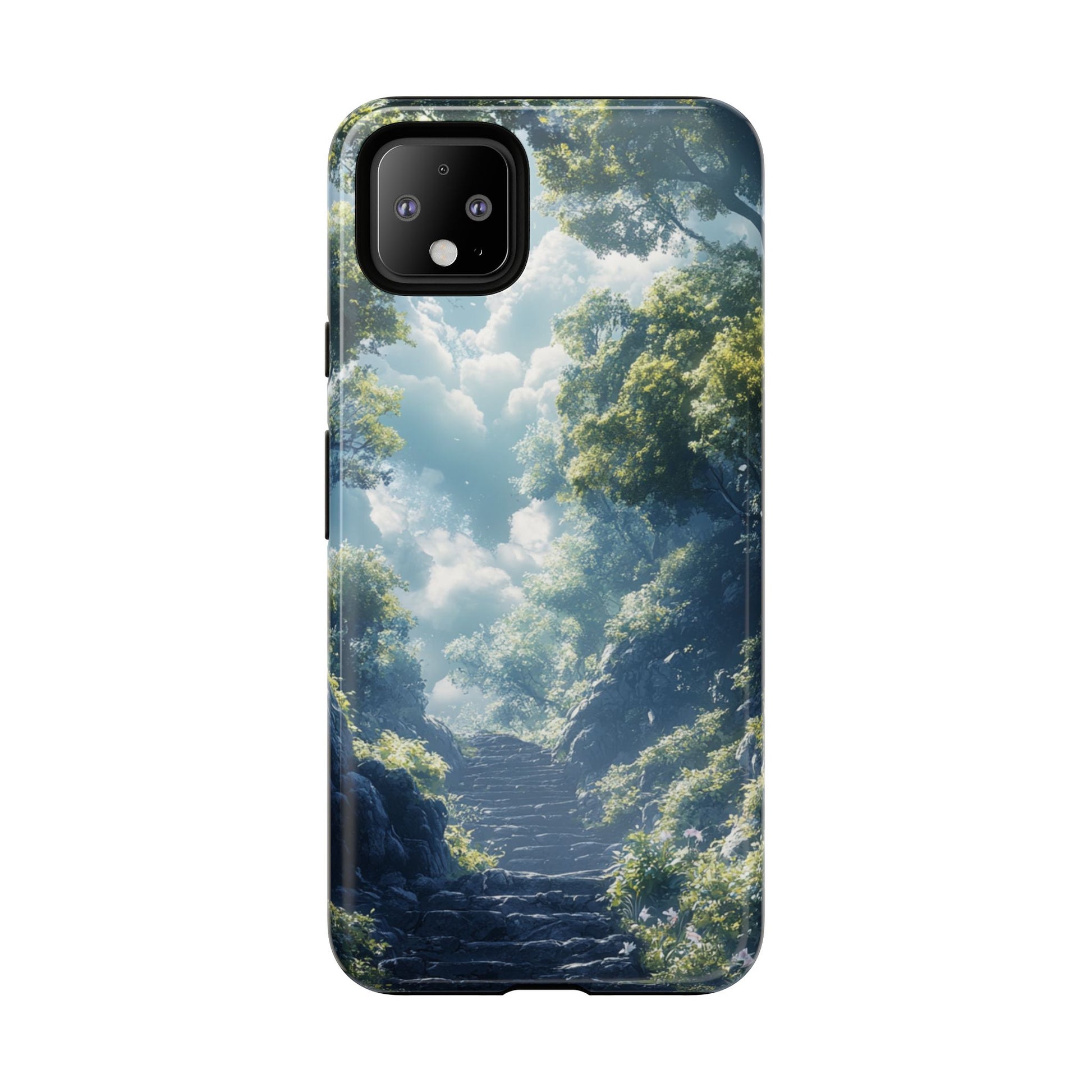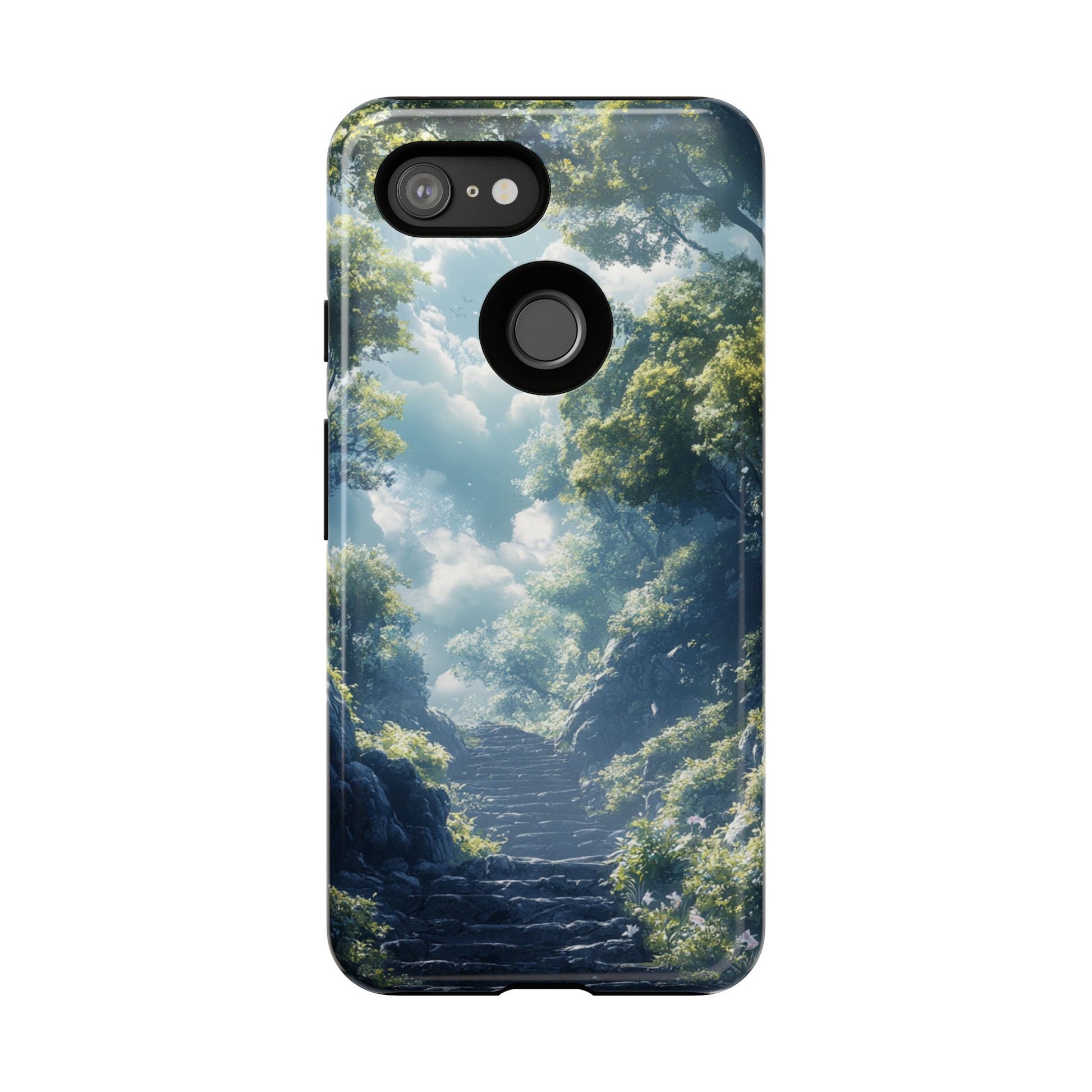 Discover inner peace with our inspiring Heavenly Path Google Pixel case. This breathtaking design features an ancient stone pathway winding upward through a lush, enchanted forest, with divine sunlight streaming through the verdant canopy above. The weathered stone steps, surrounded by vibrant greenery and delicate wildflowers, lead toward a bright, celestial opening where soft clouds and golden light create an atmosphere of hope and transcendence. This serene scene captures the beauty of nature's sanctuary and the spiritual journey of ascending toward light and peace. Perfect for nature lovers, meditation enthusiasts, or anyone seeking daily inspiration and tranquility.