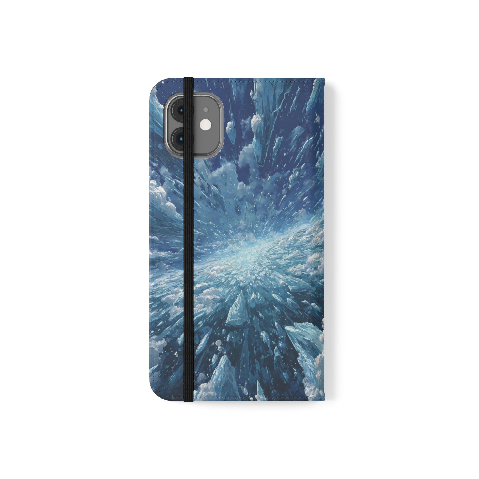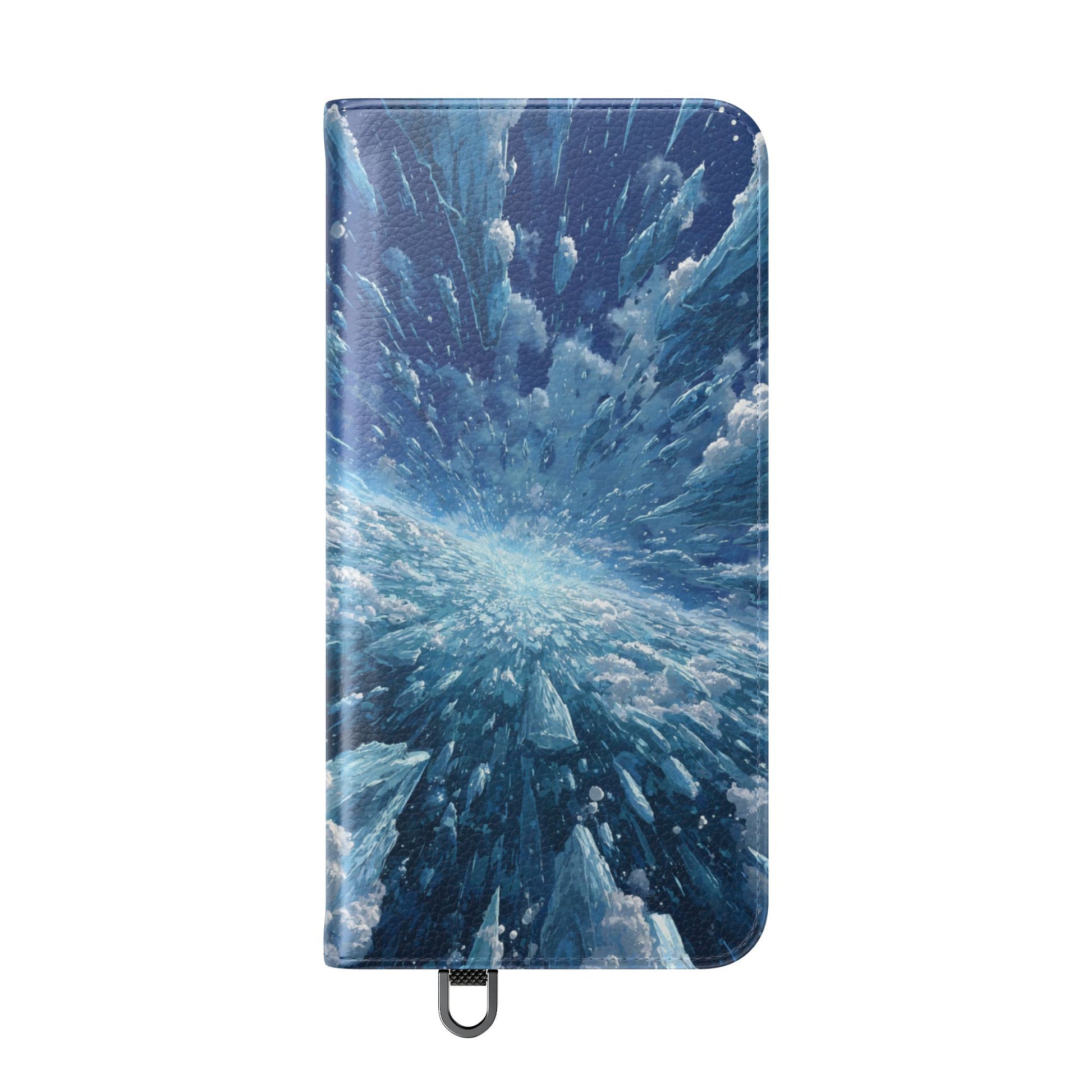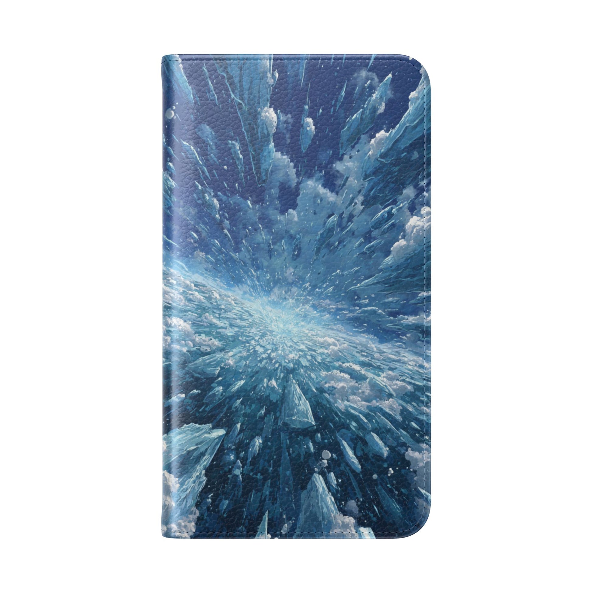 Protect your phone with our premium Ice Burst wallet case featuring a dynamic explosion of ice crystals and frozen shards radiating from the center in brilliant blues. This versatile flip case combines wallet functionality with comprehensive phone protection, card storage, and striking frozen geometric artwork.