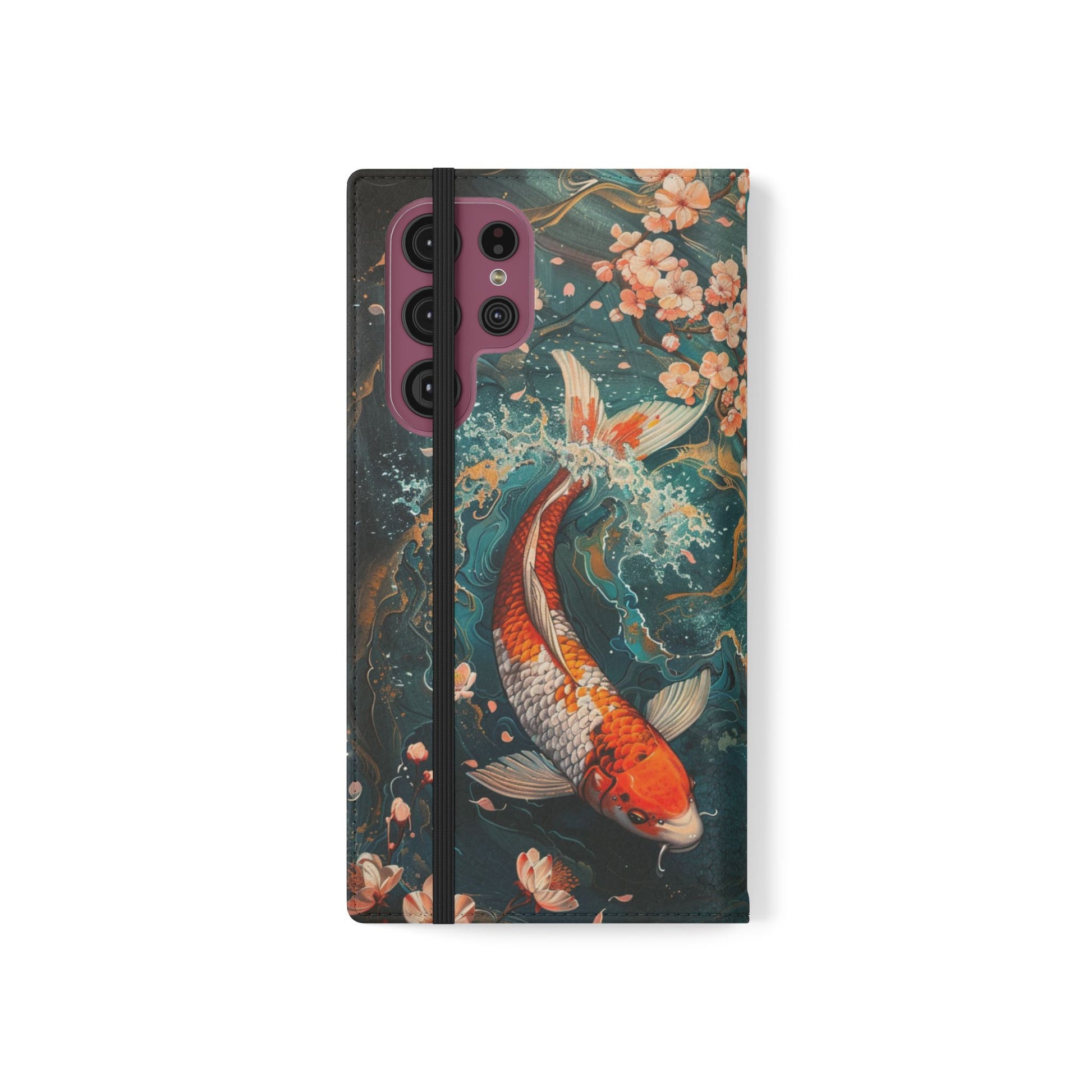 Find tranquility in our exquisite Koi Zen Garden Wallet Flip Case, a masterpiece that captures the serene beauty of traditional Japanese water gardens. This stunning design features a magnificent orange and white koi fish gracefully swimming through swirling turquoise waters, surrounded by delicate cherry blossoms in soft peach and coral tones. The artistic composition blends flowing water patterns with golden accents and floating petals, creating a harmonious scene that embodies the peaceful essence of Japanese garden design. The koi's vibrant scales are rendered in beautiful detail, from deep orange to pristine white, while the surrounding water flows in elegant curves that suggest movement and life. Cherry blossom branches frame the scene with their gentle blooms, adding romance and seasonal beauty to this meditative artwork. Perfect for those who appreciate Japanese culture, seek inner peace, love koi fish, or anyone drawn to the calming aesthetics of traditional Asian art and zen philosophy.