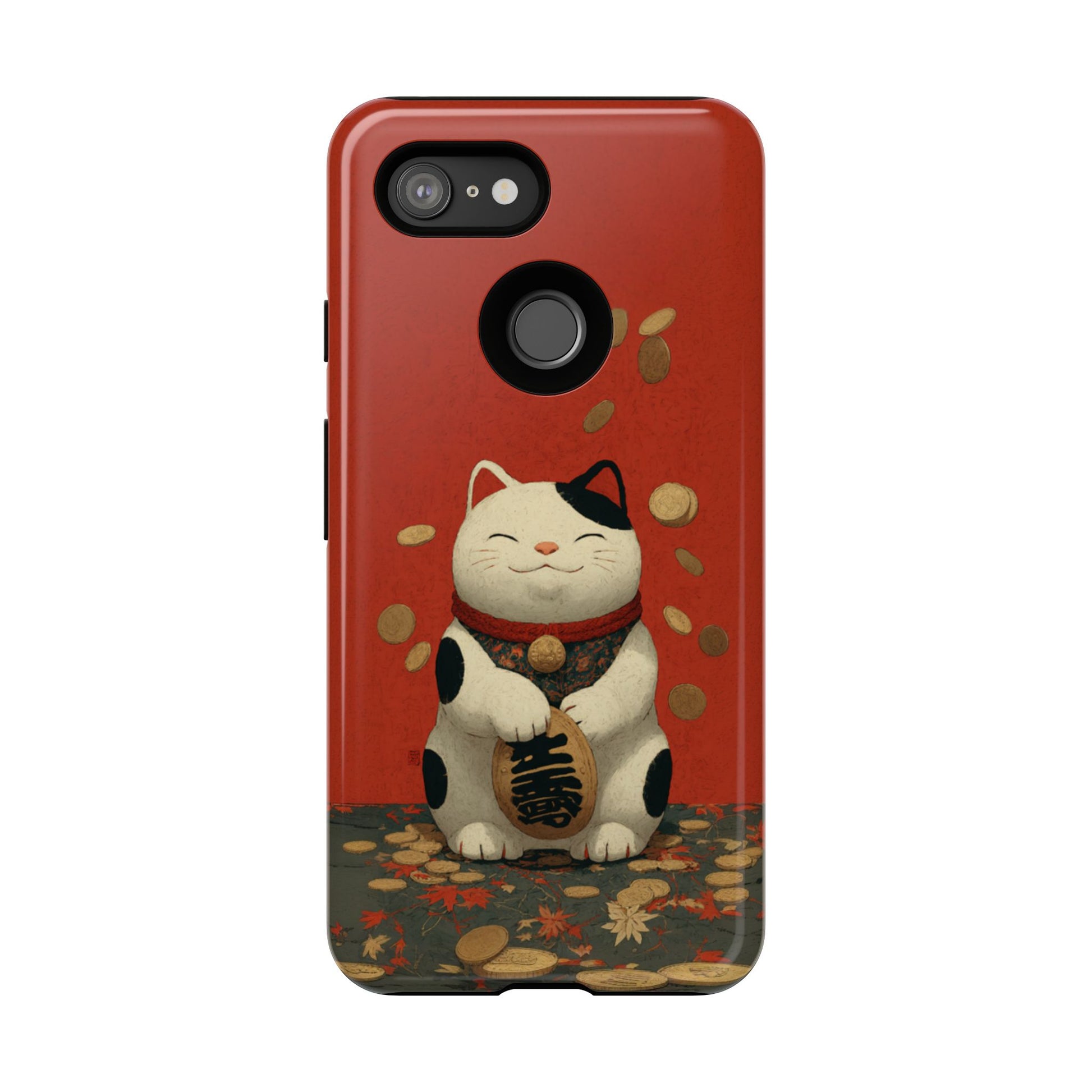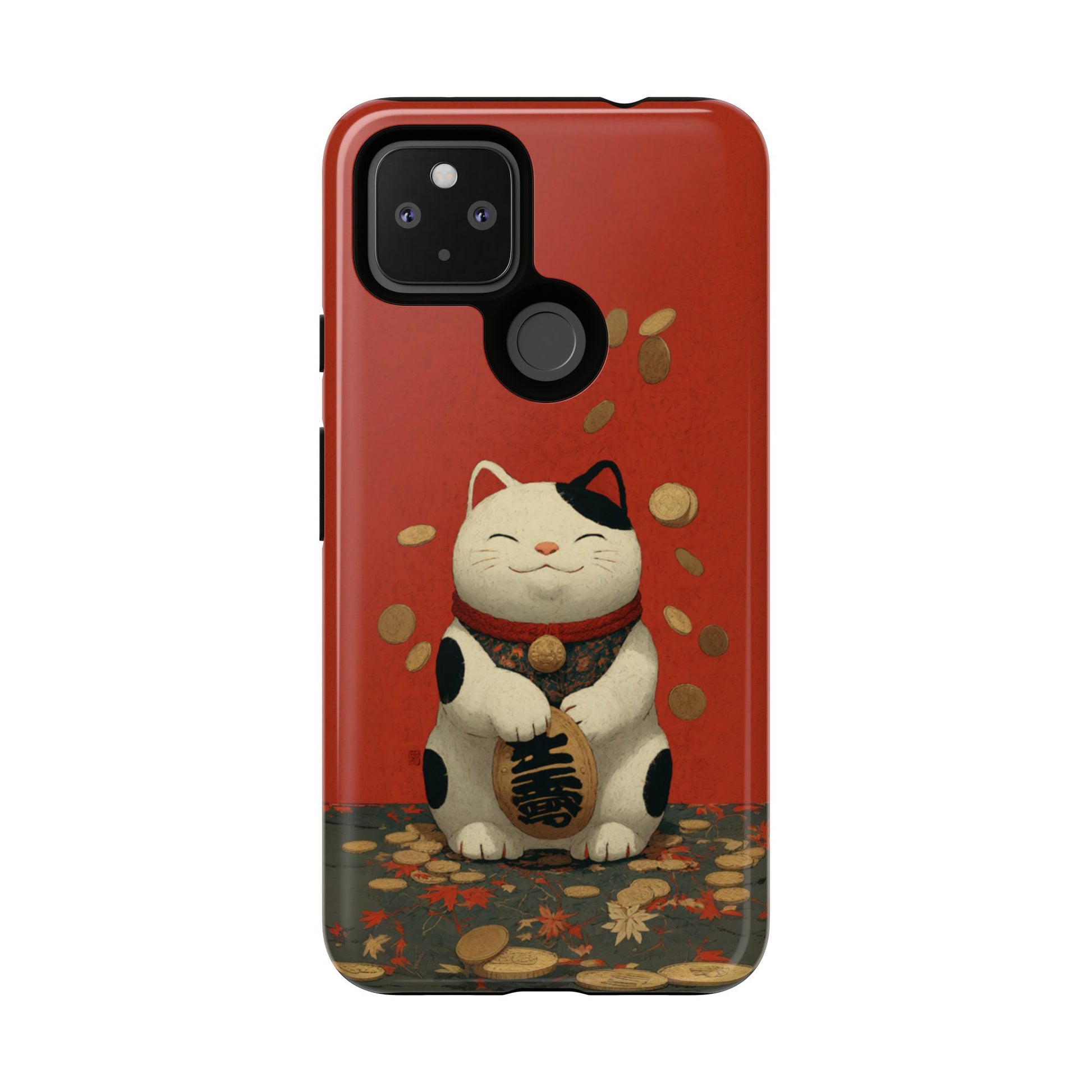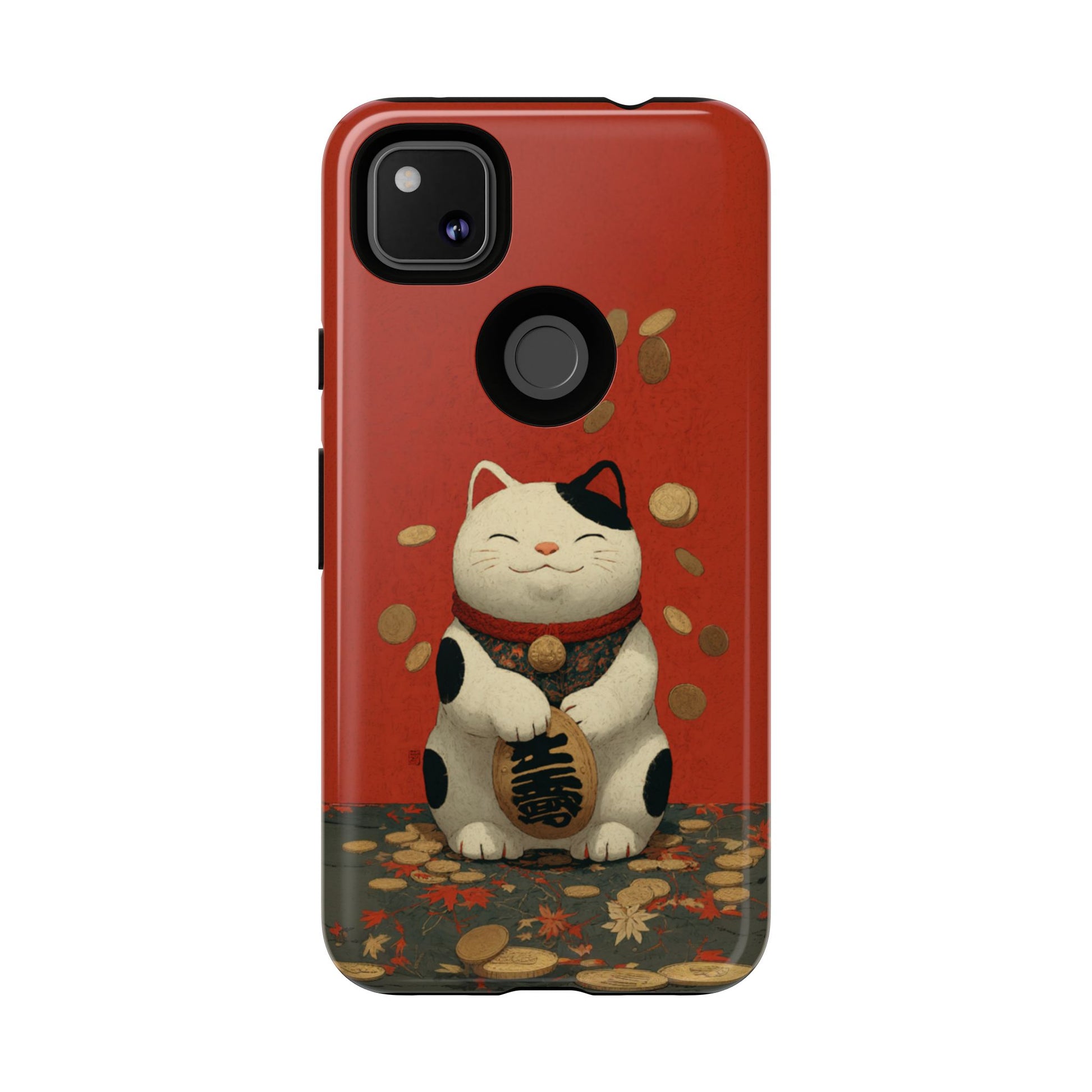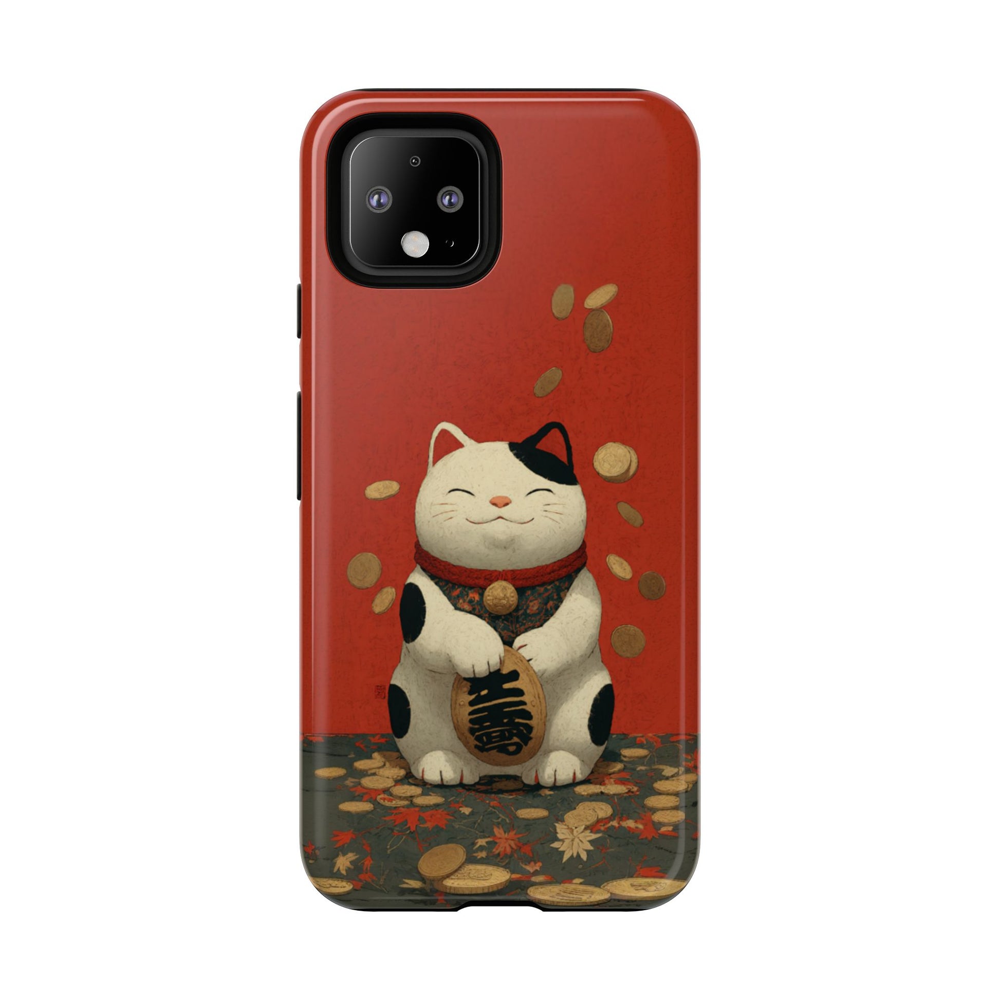 Bring good fortune with our charming Lucky Cat Google Pixel case featuring a traditional maneki neko surrounded by golden coins and autumn leaves. The classic white cat with black markings sits peacefully against a vibrant red background, symbolizing prosperity and positive energy. Perfect for those who appreciate Japanese culture, feng shui principles, or simply love adorable cat designs with meaningful symbolism.
