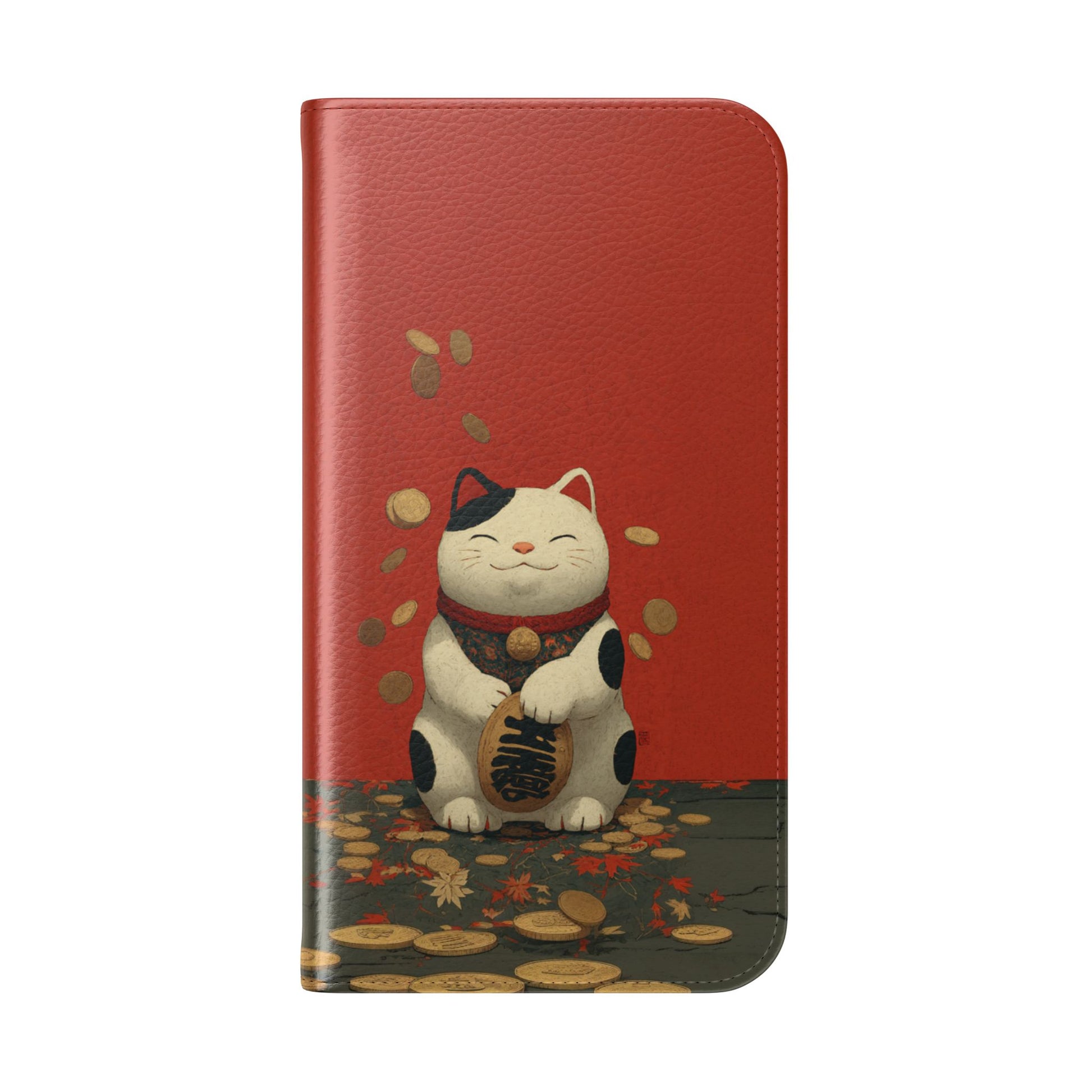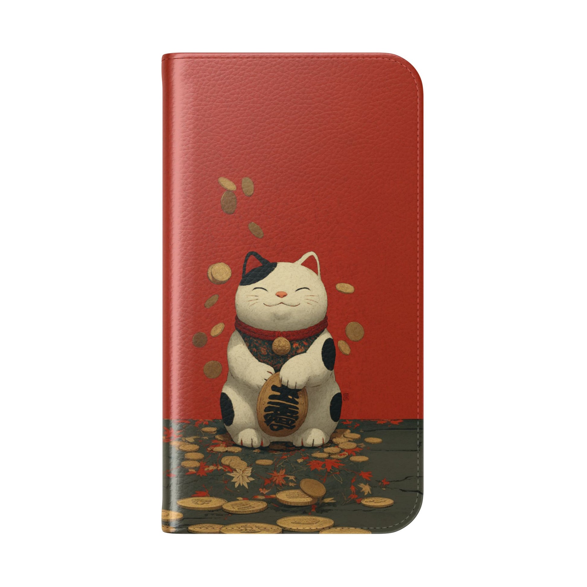 Bring good fortune with our charming Lucky Cat Wallet Flip Case featuring a traditional maneki neko surrounded by golden coins and autumn leaves. The classic white cat with black markings sits peacefully against a vibrant red background, symbolizing prosperity and positive energy. Perfect for those who appreciate Japanese culture, feng shui principles, or simply love adorable cat designs with meaningful symbolism.