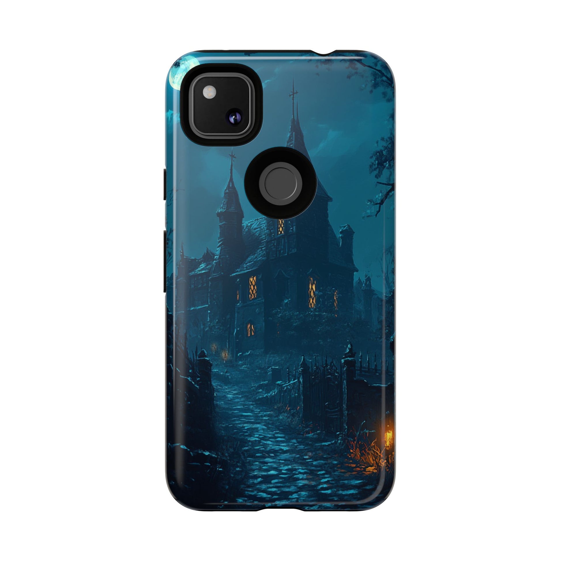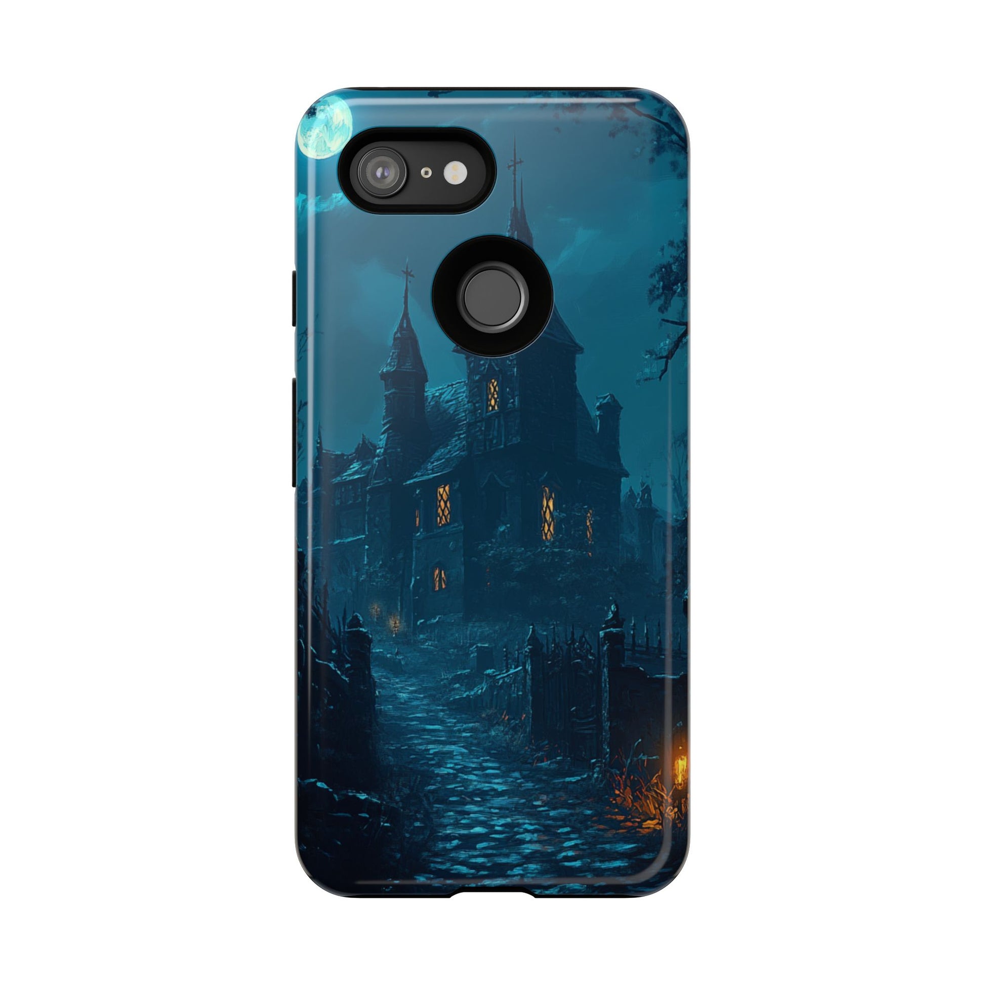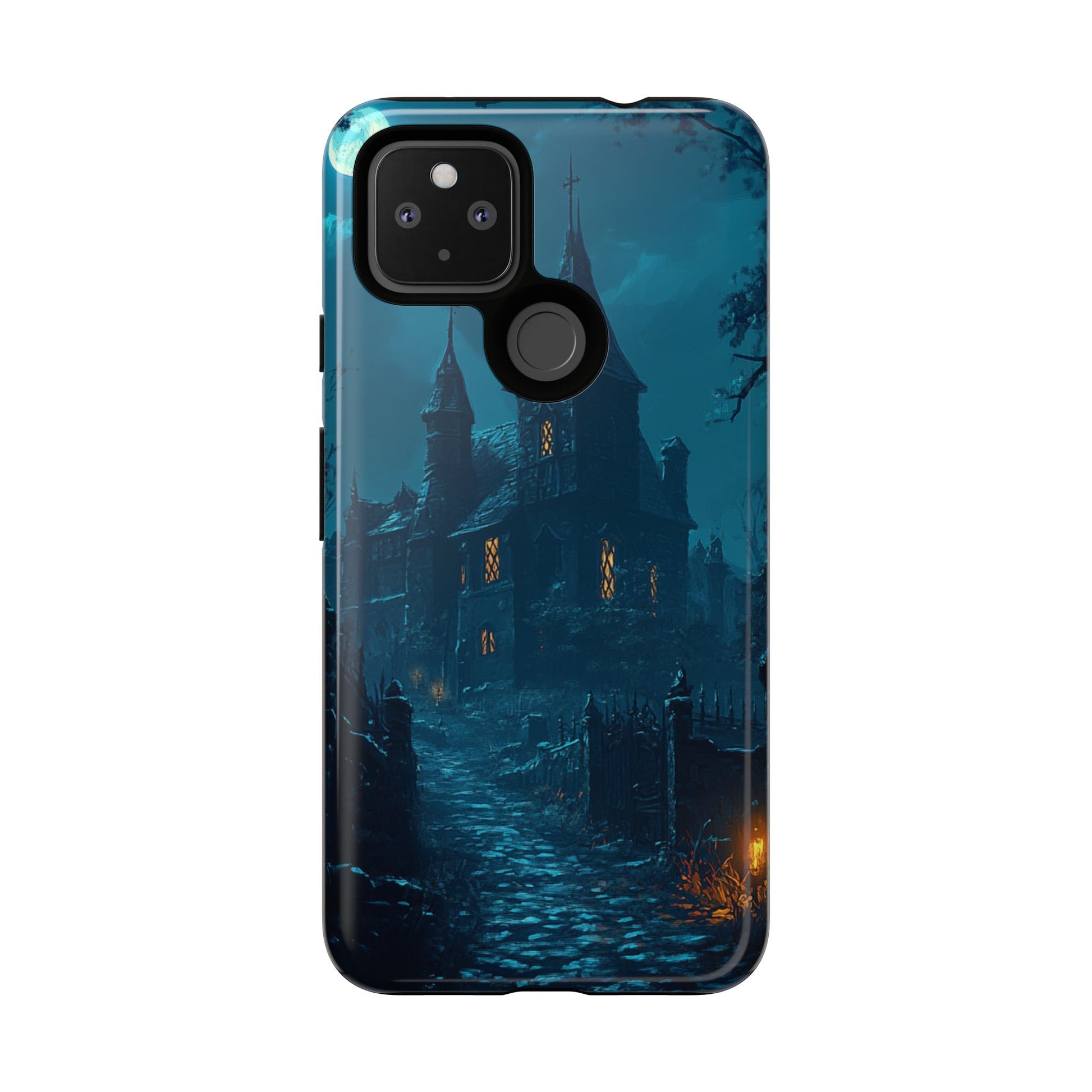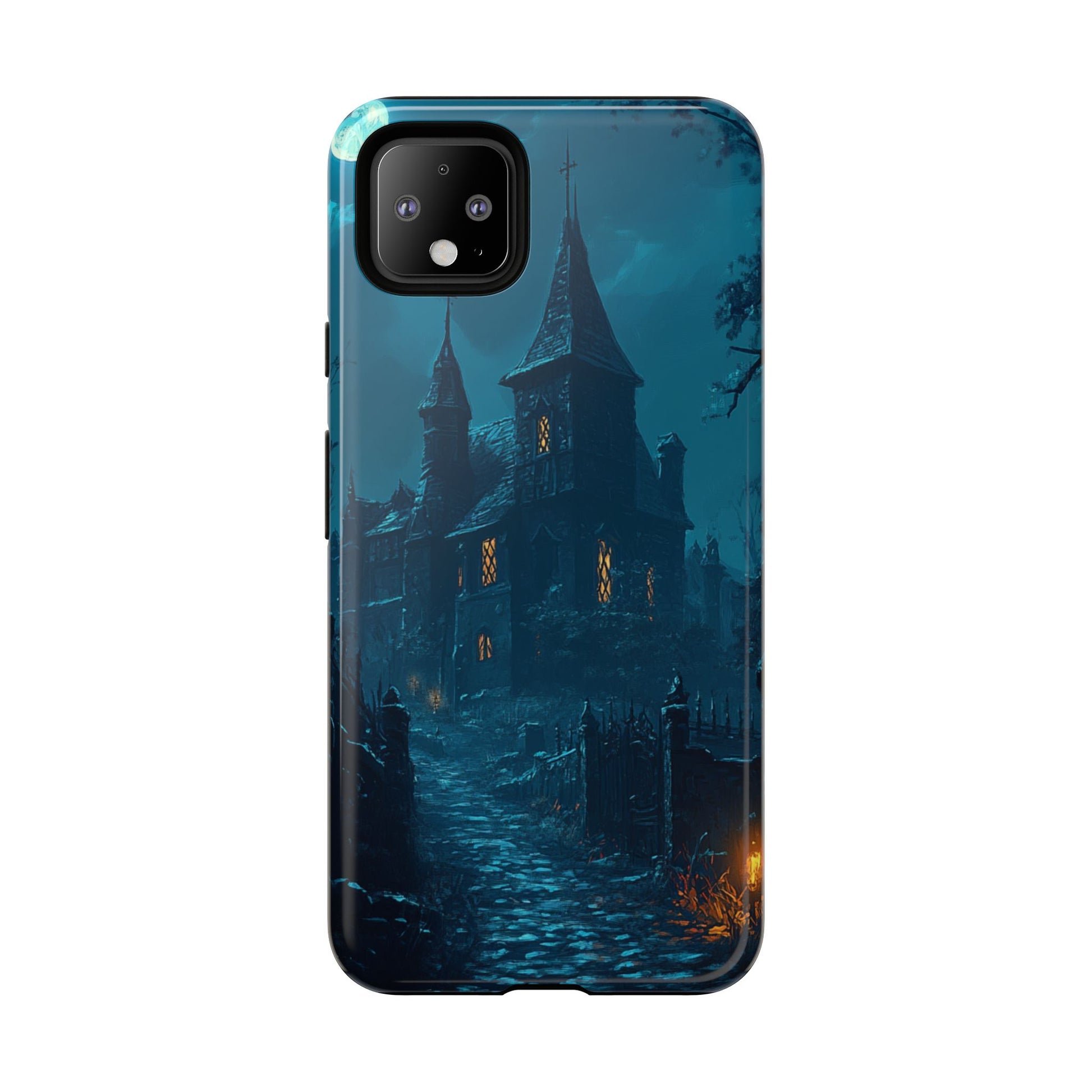 Step into a world of mystery and medieval grandeur with our captivating Midnight Castle Google Pixel case. This atmospheric design features a magnificent gothic castle silhouetted against a luminous full moon, with warm golden light glowing from its ancient windows like beacons in the darkness. The scene is shrouded in deep blue moonlight that bathes the entire landscape in an otherworldly glow, while towering spires and weathered stone walls speak of centuries past. A cobblestone path winds through the foreground, flanked by gnarled trees and iron gates, leading the eye toward the imposing fortress. Ravens soar across the moonlit sky, adding to the mystical atmosphere. The interplay of shadow and light creates dramatic depth, with the castle's illuminated windows suggesting life within its ancient walls. Perfect for lovers of gothic architecture, medieval history, dark fantasy enthusiasts, or anyone drawn to mysterious and atmospheric artwork that evokes tales of knights, legends, and forgotten realms.