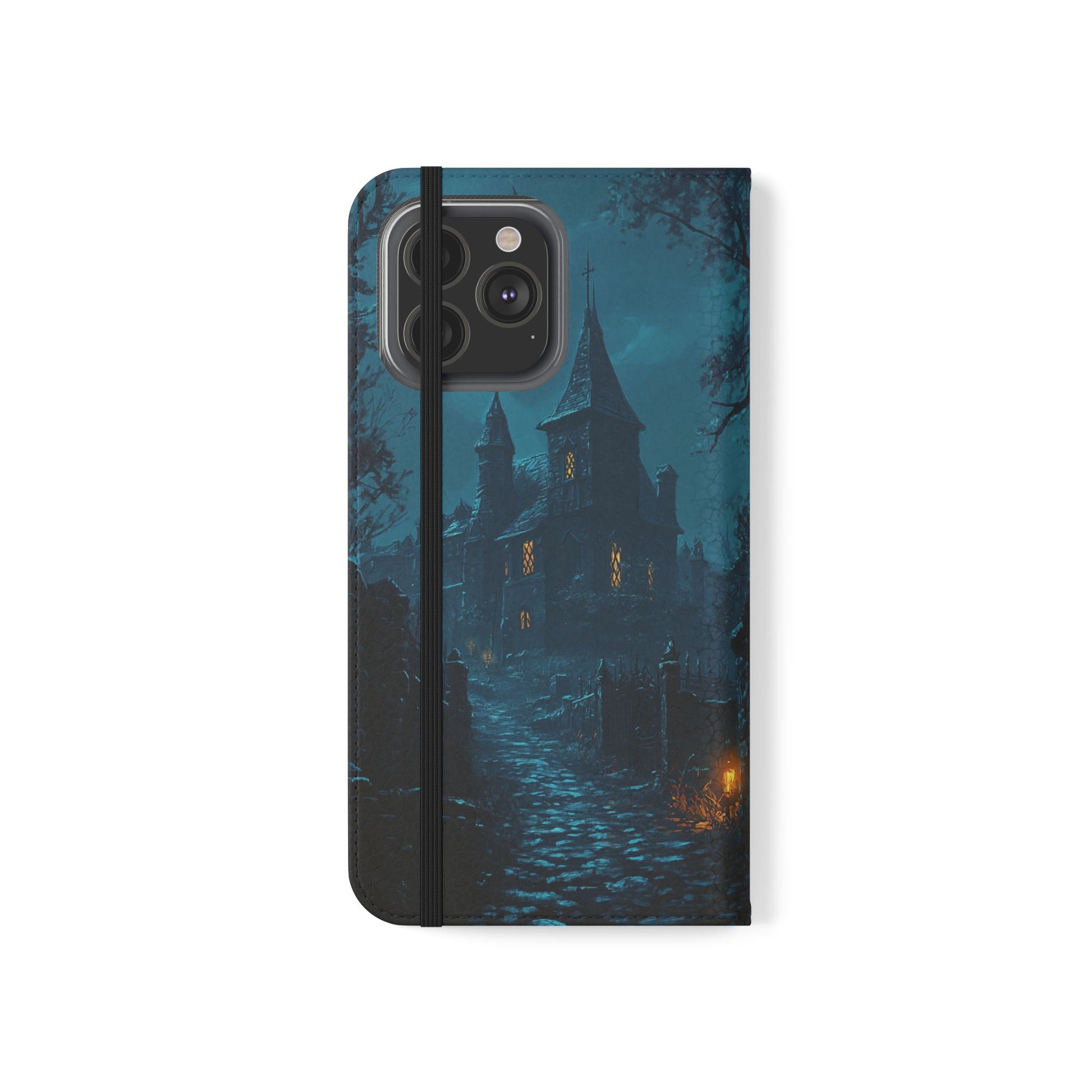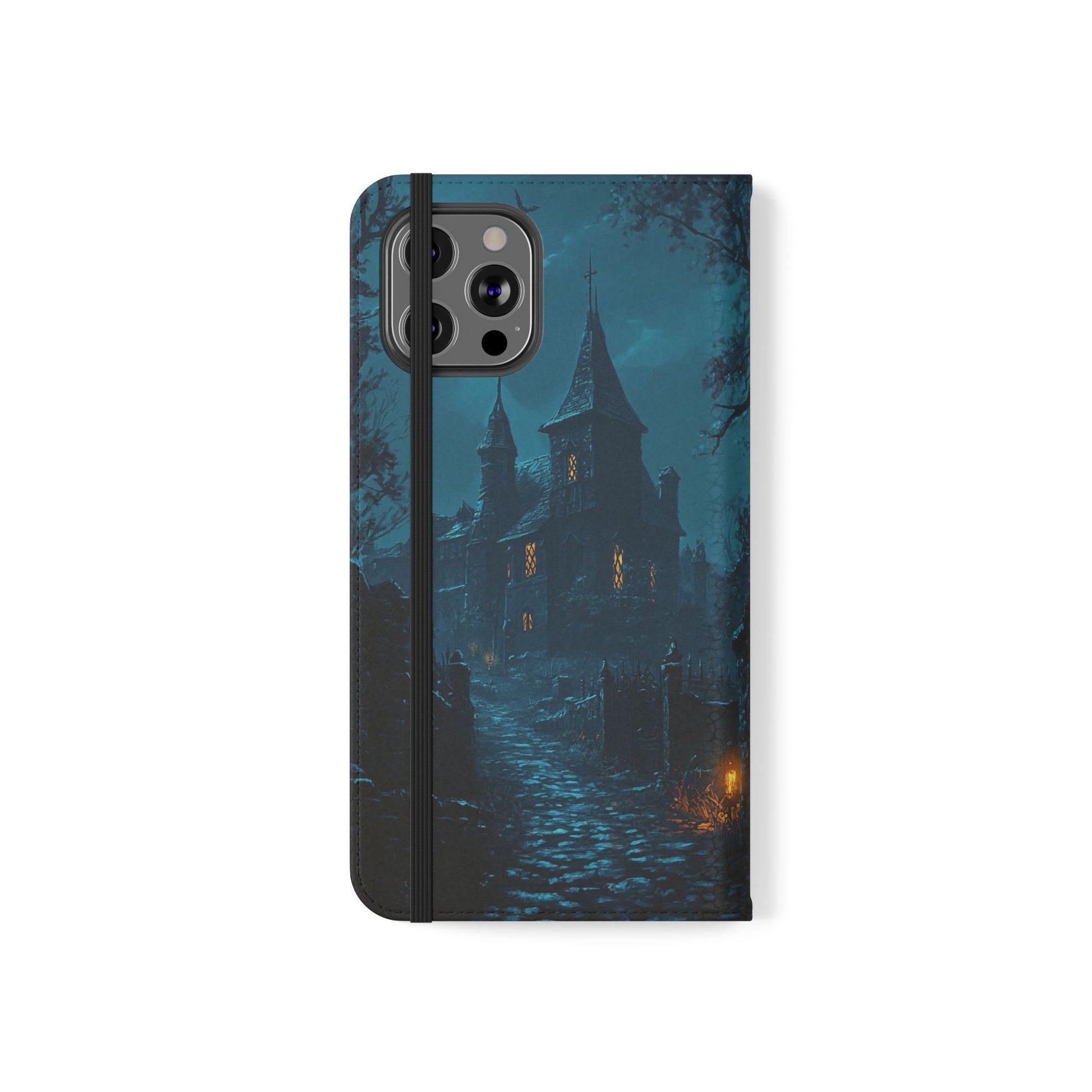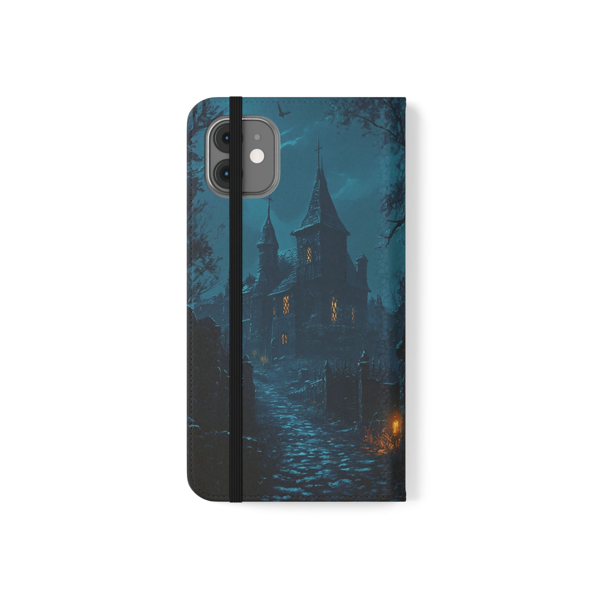 Step into a world of mystery and medieval grandeur with our captivating Midnight Castle Wallet Flip Case. This atmospheric design features a magnificent gothic castle silhouetted against a luminous full moon, with warm golden light glowing from its ancient windows like beacons in the darkness. The scene is shrouded in deep blue moonlight that bathes the entire landscape in an otherworldly glow, while towering spires and weathered stone walls speak of centuries past. A cobblestone path winds through the foreground, flanked by gnarled trees and iron gates, leading the eye toward the imposing fortress. Ravens soar across the moonlit sky, adding to the mystical atmosphere. The interplay of shadow and light creates dramatic depth, with the castle's illuminated windows suggesting life within its ancient walls. Perfect for lovers of gothic architecture, medieval history, dark fantasy enthusiasts, or anyone drawn to mysterious and atmospheric artwork that evokes tales of knights, legends, and forgotten realms.