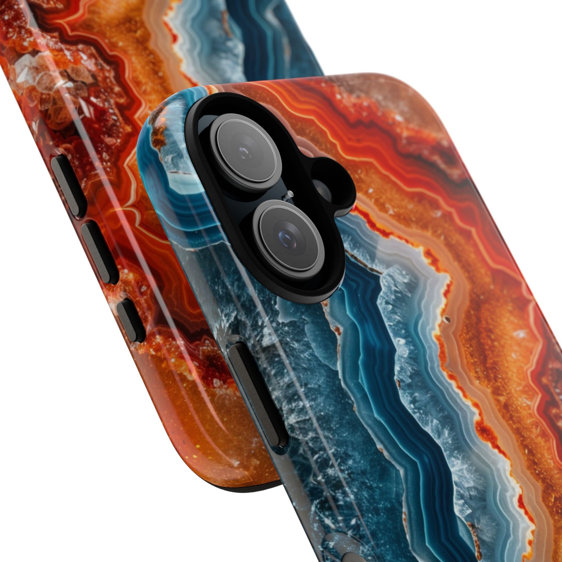 Fiery orange crystal meets deep ocean blue in this striking agate‑slice design. The high‑definition wrap‑around print transforms your iPhone into a pocket‑sized geode while delivering rugged dual‑layer protection.