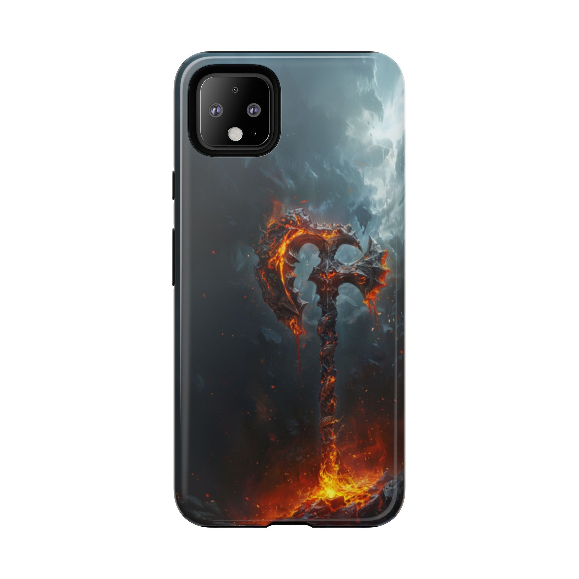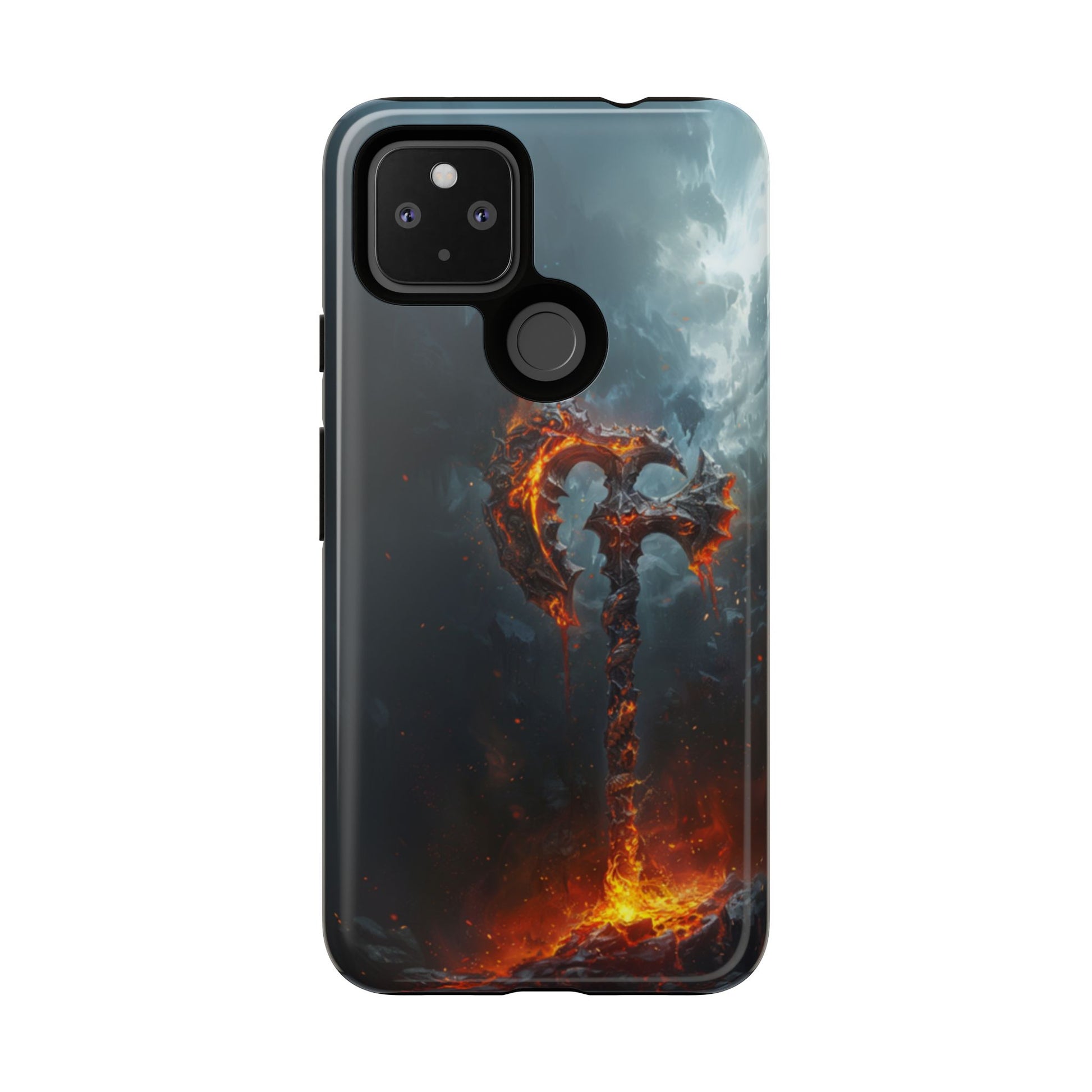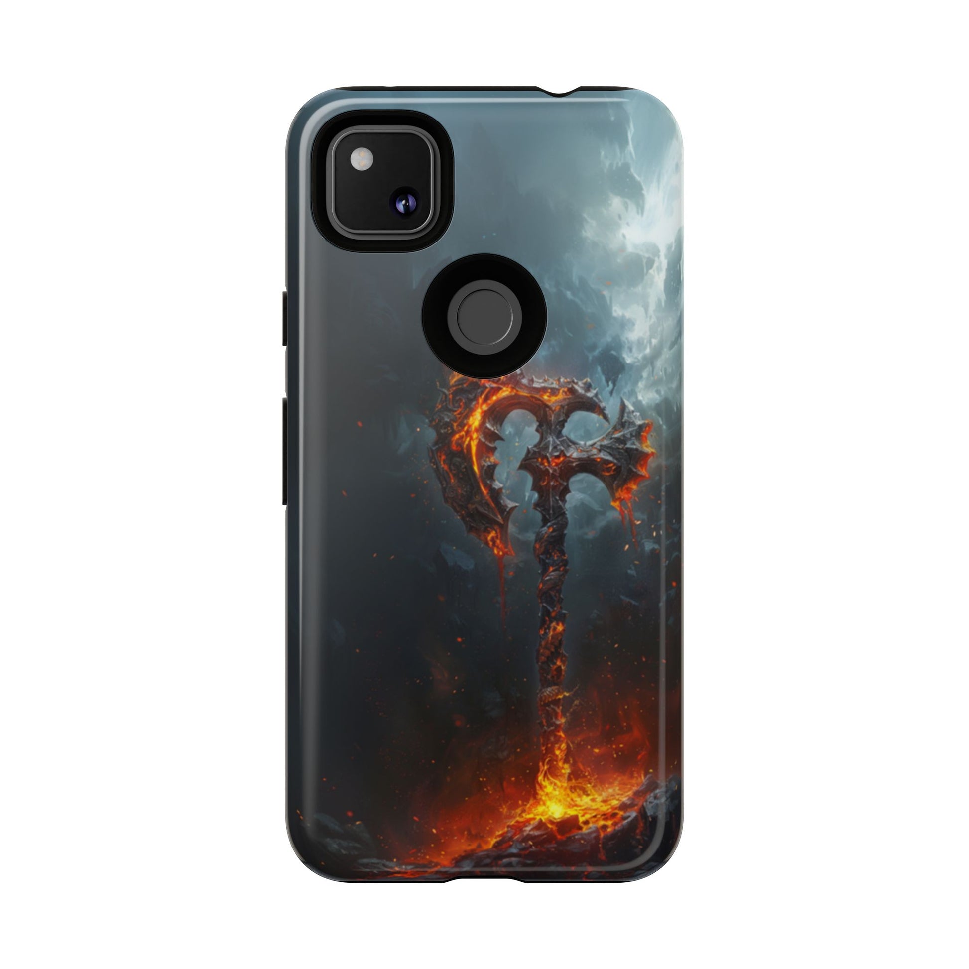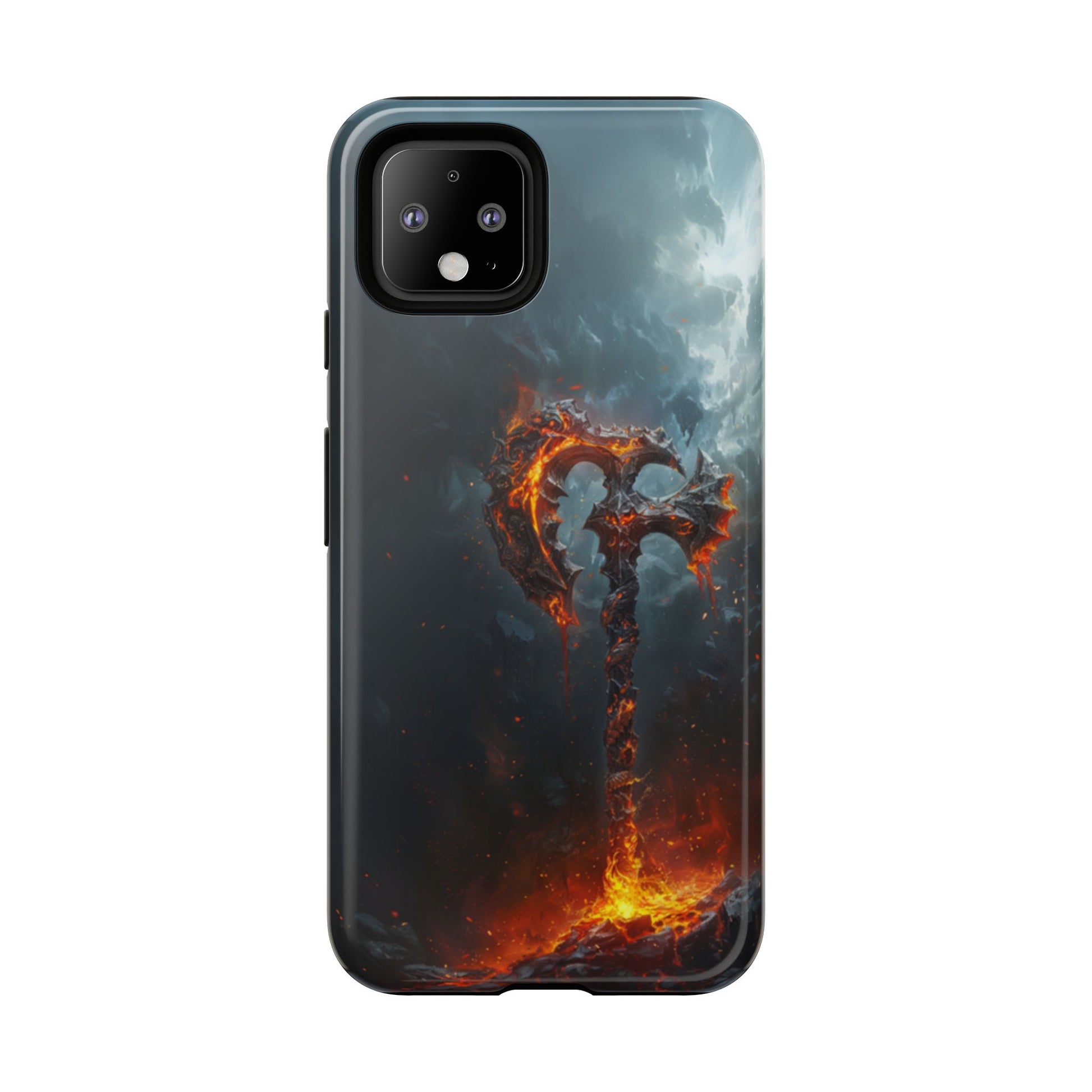 Unleash the power of the forge with our epic Molten War Axe Google Pixel case. This breathtaking design features a massive war axe with molten lava flowing through its battle-scarred surface, creating an awe-inspiring display of raw destructive power. The ancient weapon glows with intense heat as fiery cracks reveal the molten core within the axe head, while a dramatic stormy sky swirls overhead, creating an apocalyptic atmosphere. Embers and sparks dance around this legendary weapon of destruction. Perfect for fantasy warriors, epic weapon enthusiasts, or anyone drawn to powerful imagery that embodies strength, fire, and legendary craftsmanship.