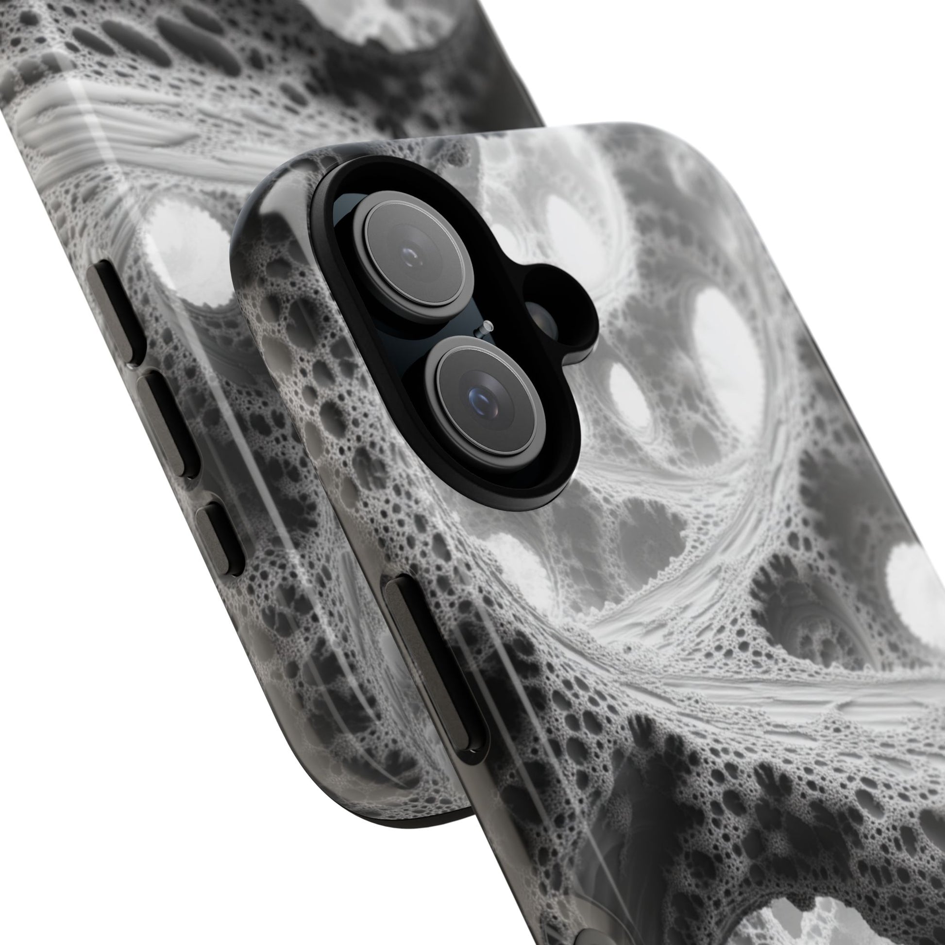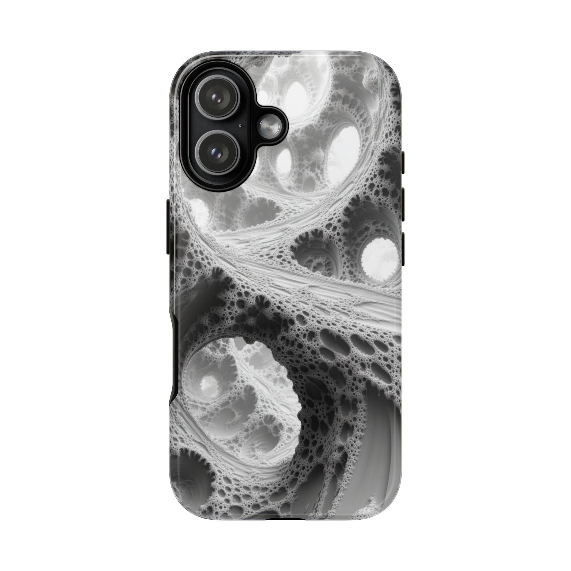 Delicate grey-to-white forms twist into a lacework fractal cavern, letting light spill through cellular tunnels. This wrap-around print turns your iPhone into minimalist math art while rugged dual-layer construction keeps it safe.