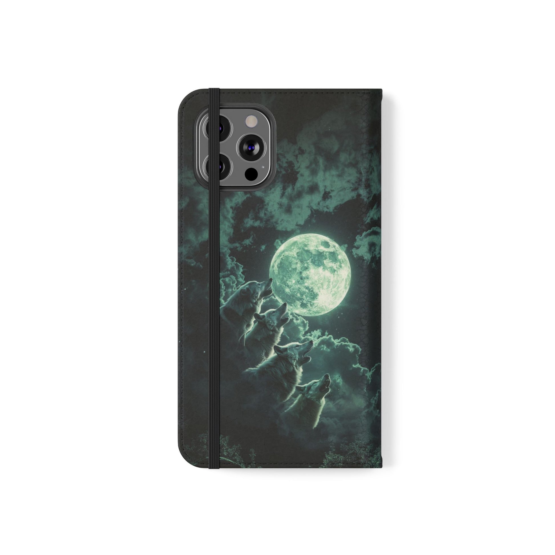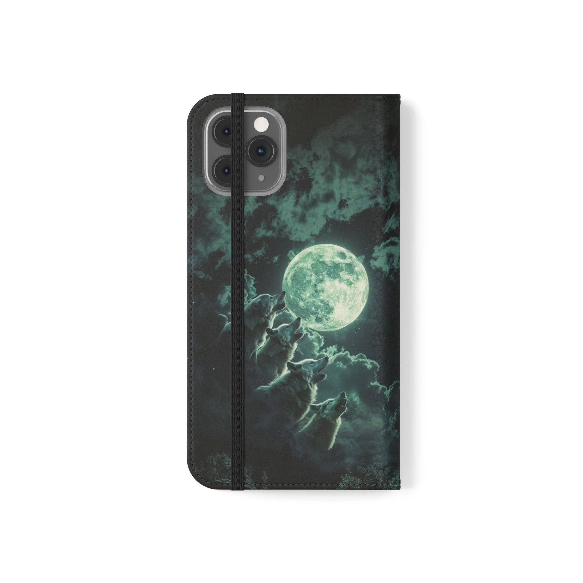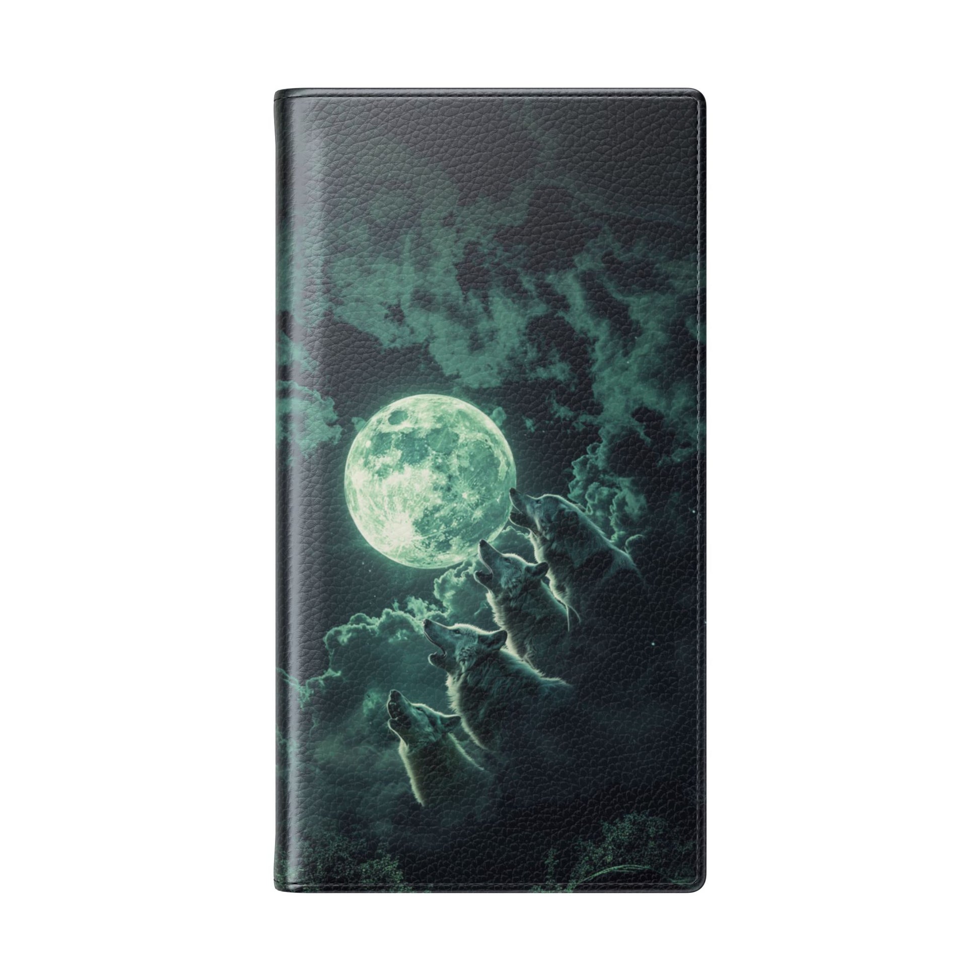 Protect your phone with our premium Moonlit Wolf Chorus wallet case featuring a dramatic wolf pack howling at a glowing green full moon through swirling clouds and starlit sky. This versatile flip case combines wallet functionality with comprehensive phone protection, card storage, and stunning mystical wildlife artwork.