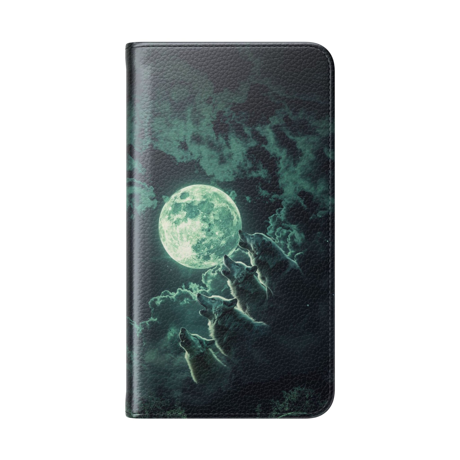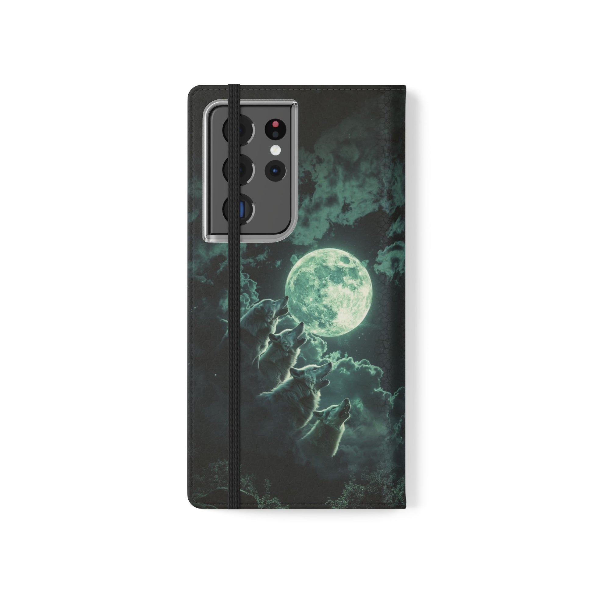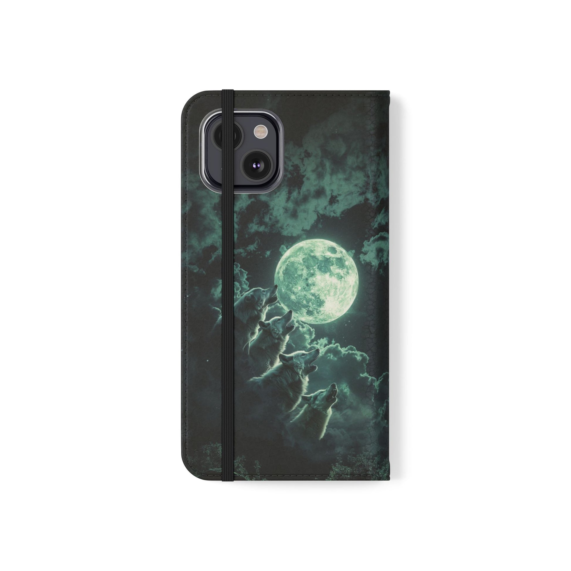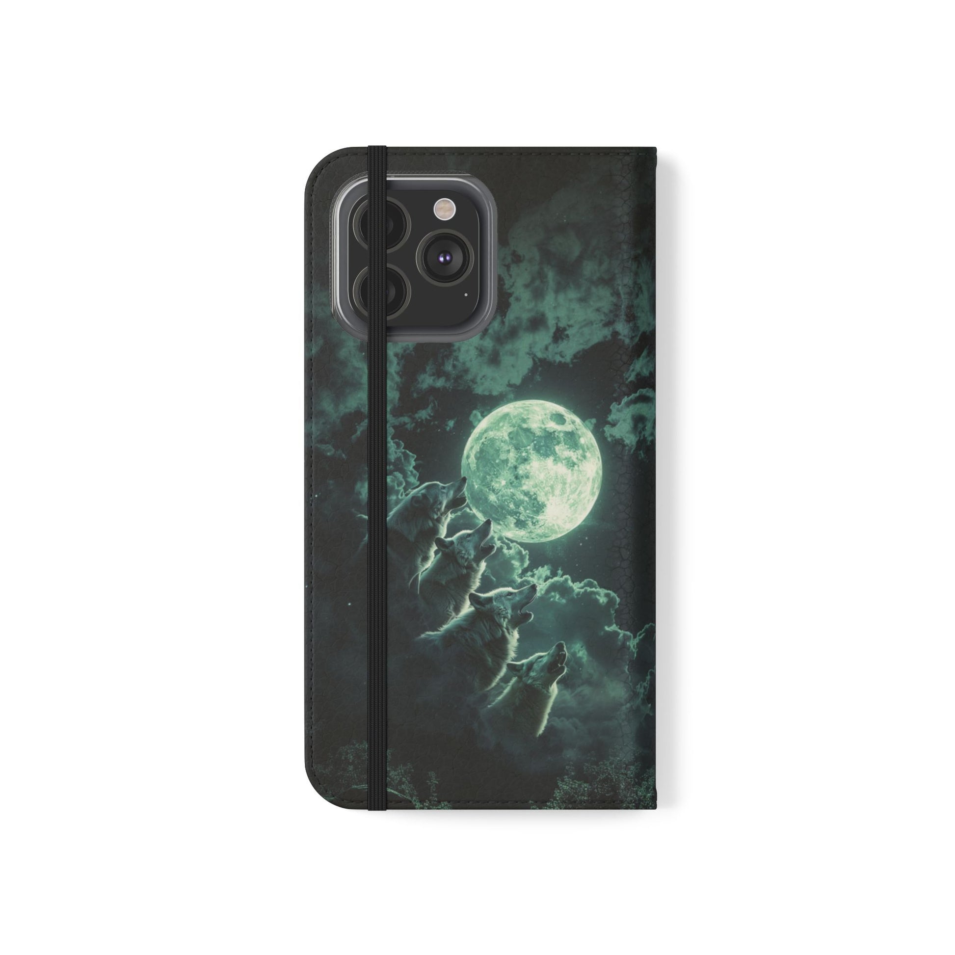 Protect your phone with our premium Moonlit Wolf Chorus wallet case featuring a dramatic wolf pack howling at a glowing green full moon through swirling clouds and starlit sky. This versatile flip case combines wallet functionality with comprehensive phone protection, card storage, and stunning mystical wildlife artwork.