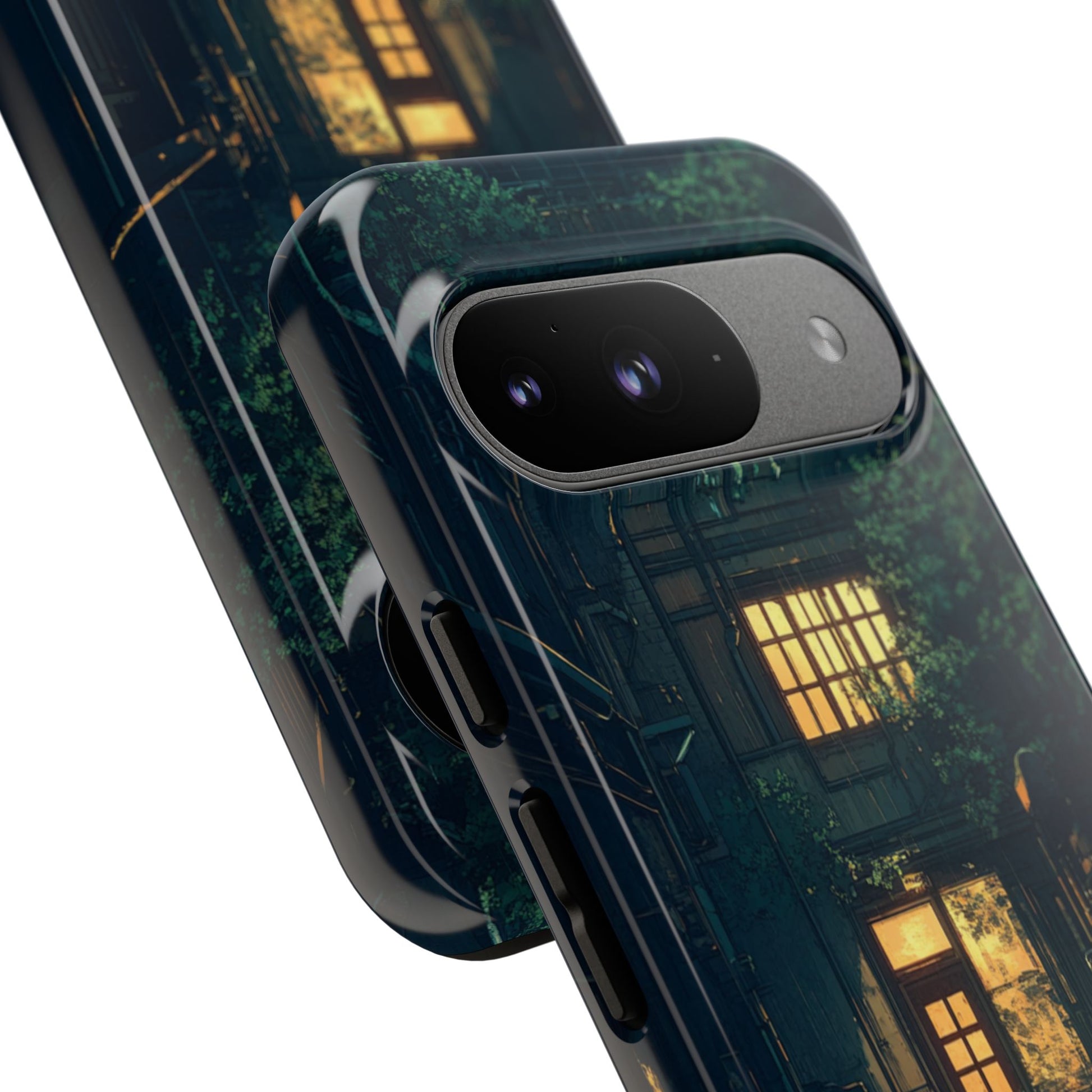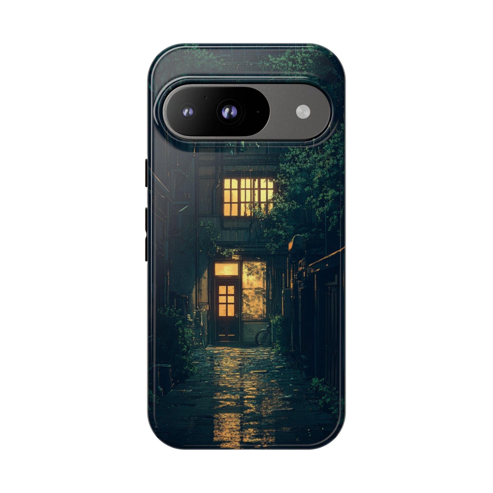 Find tranquility in the gentle rhythm of rain with our enchanting Rainy Alley Google Pixel case. This atmospheric design captures a cozy urban alleyway during a peaceful rainfall, where warm golden light spills from apartment windows and reflects beautifully on wet cobblestones. Lush greenery and climbing plants soften the urban architecture, creating a hidden garden sanctuary in the heart of the city. The gentle rain adds a soothing ambiance while the glowing windows suggest stories of home and comfort within. Perfect for lovers of rainy days, urban exploration, or anyone drawn to the peaceful beauty found in quiet city corners and cozy atmospheric scenes.