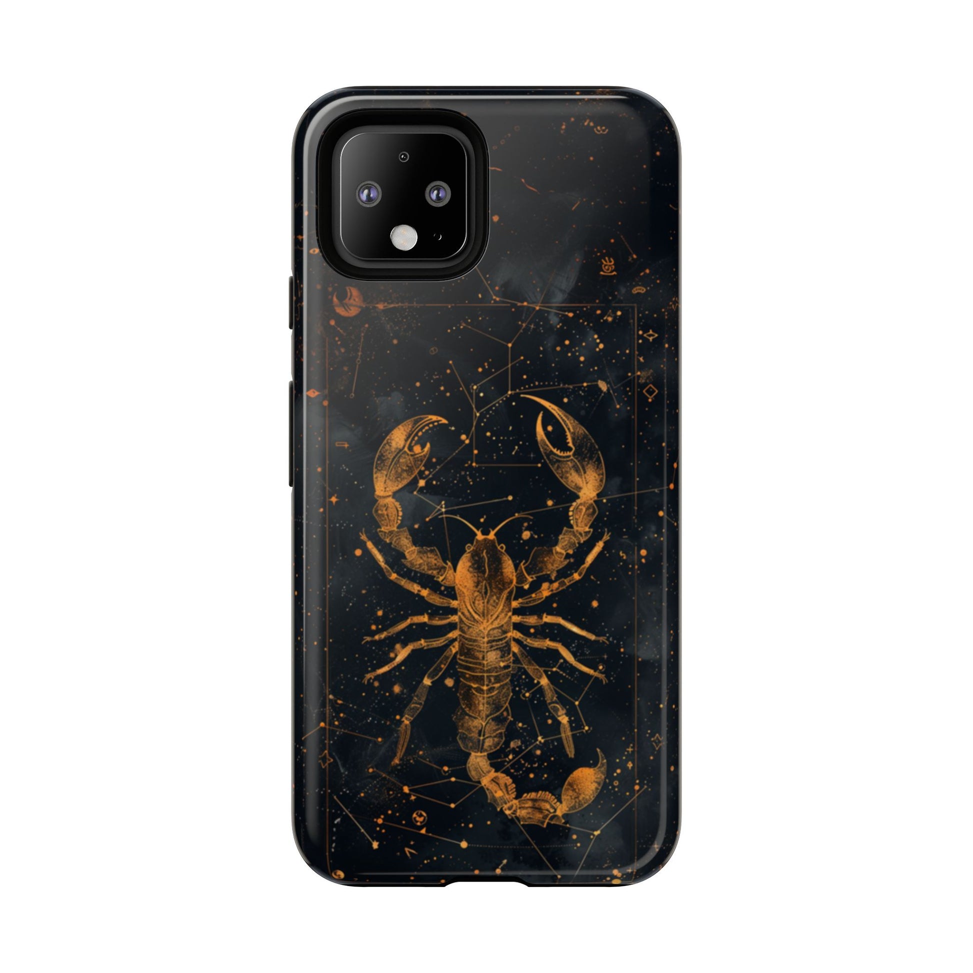 A finely etched golden scorpion spans a constellation grid, shimmering amid cosmic particles on a deep‑space backdrop. Impact‑resistant dual‑layer construction pairs with luxe, high‑definition art to safeguard your Google Pixel.