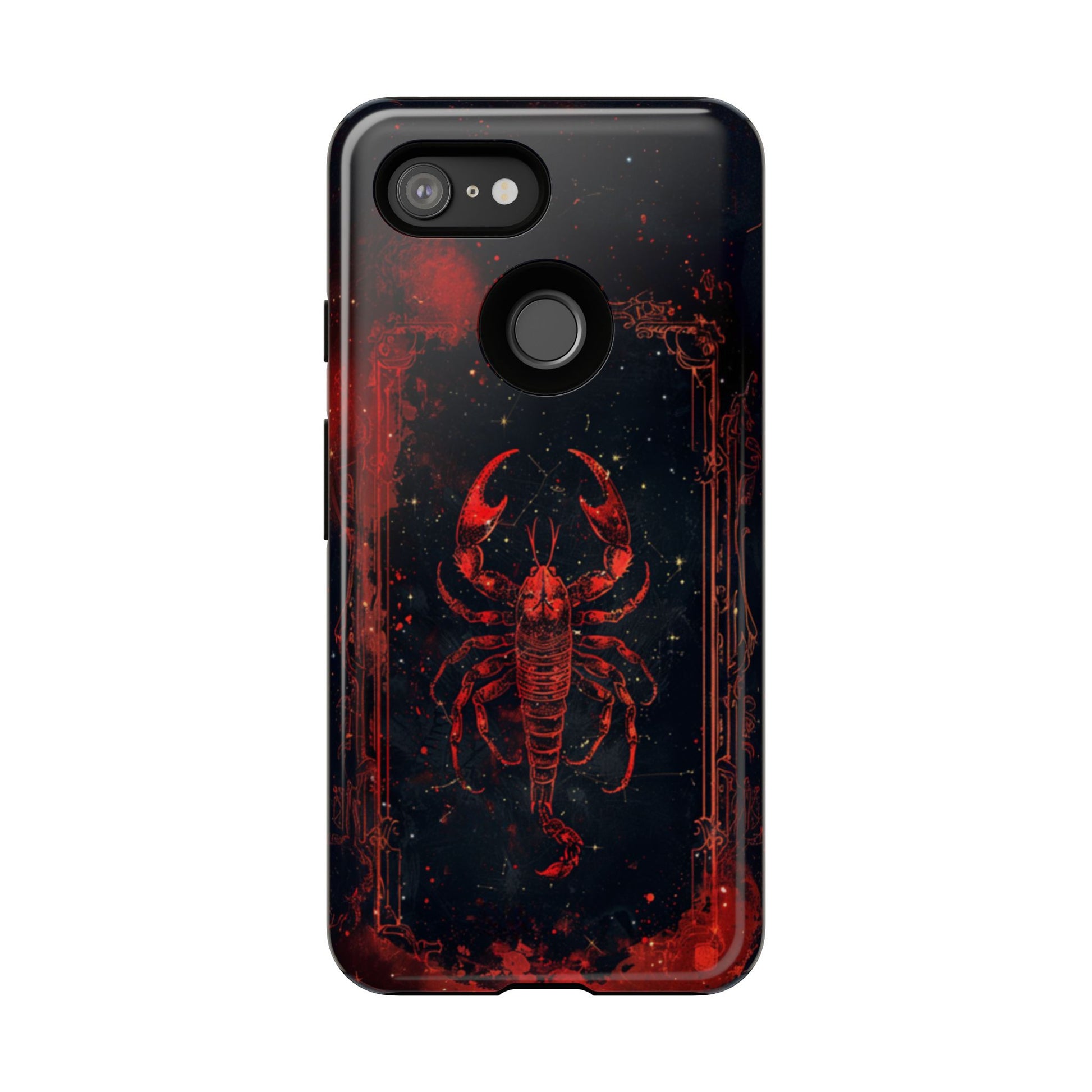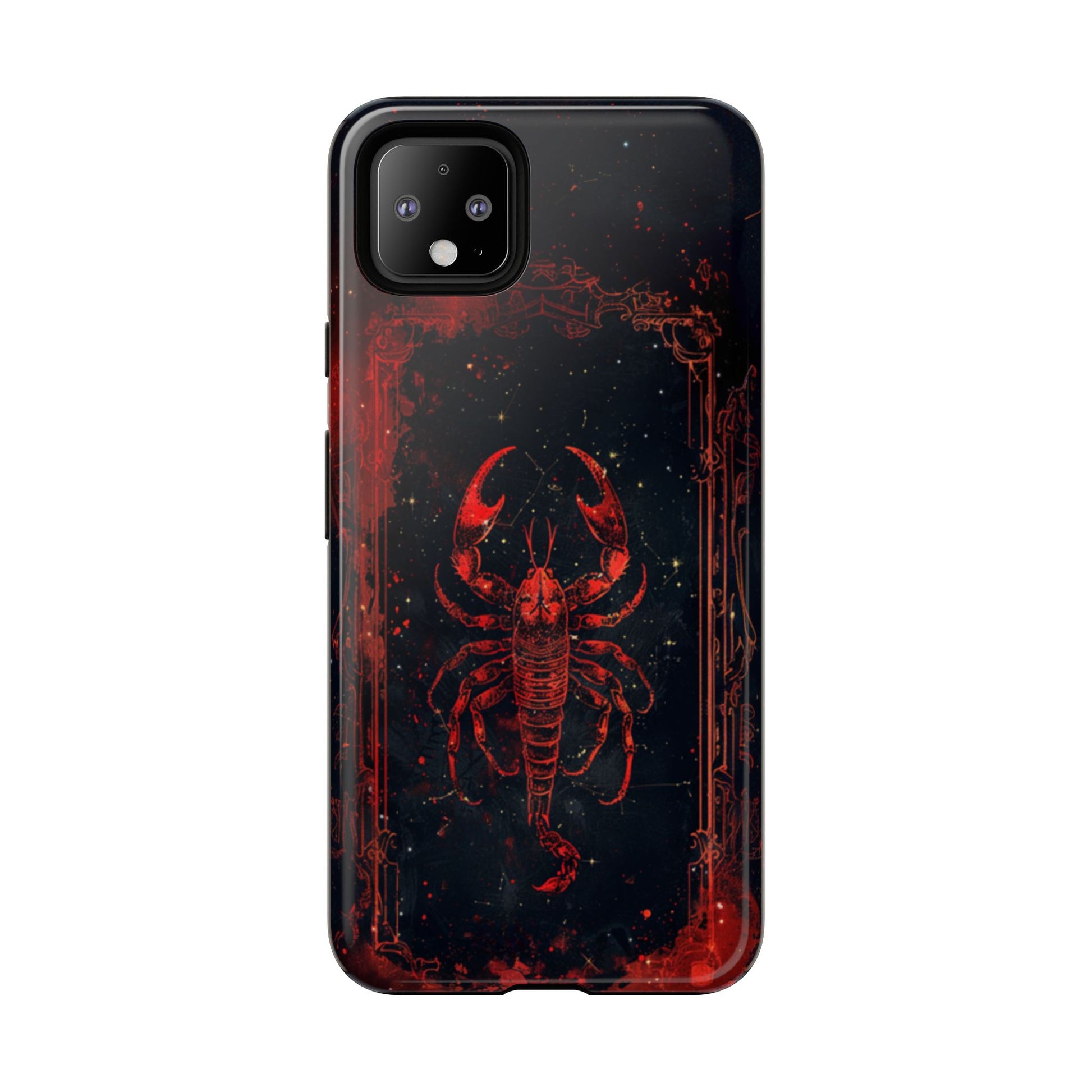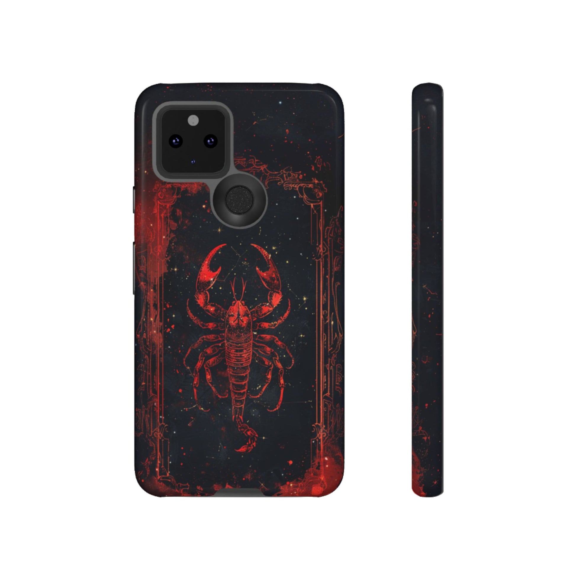 Golden stars shimmer through scarlet nebula clouds behind a red scorpion etched in celestial lines. Impact‑resistant dual‑layer construction pairs with vivid HD art to guard your Google Pixel under every cosmic alignment.