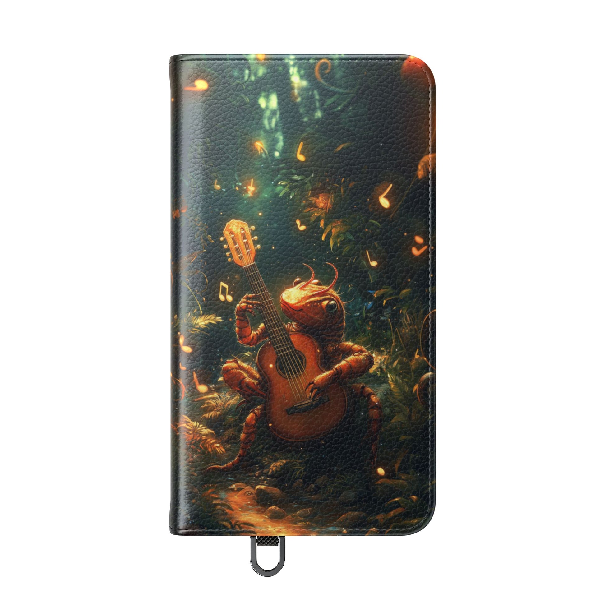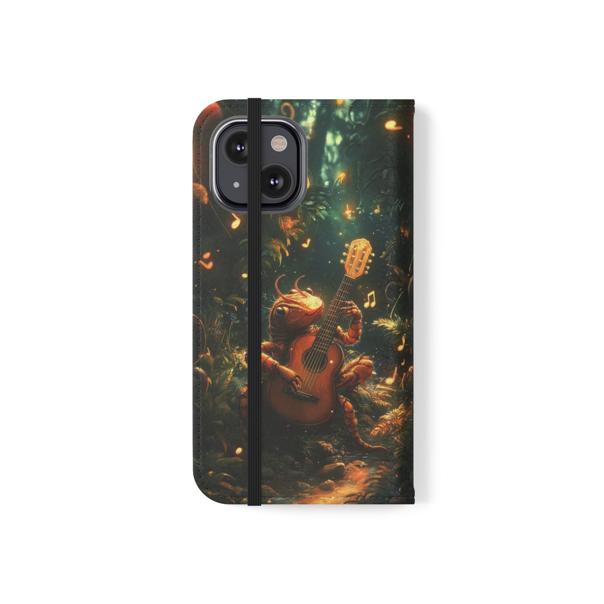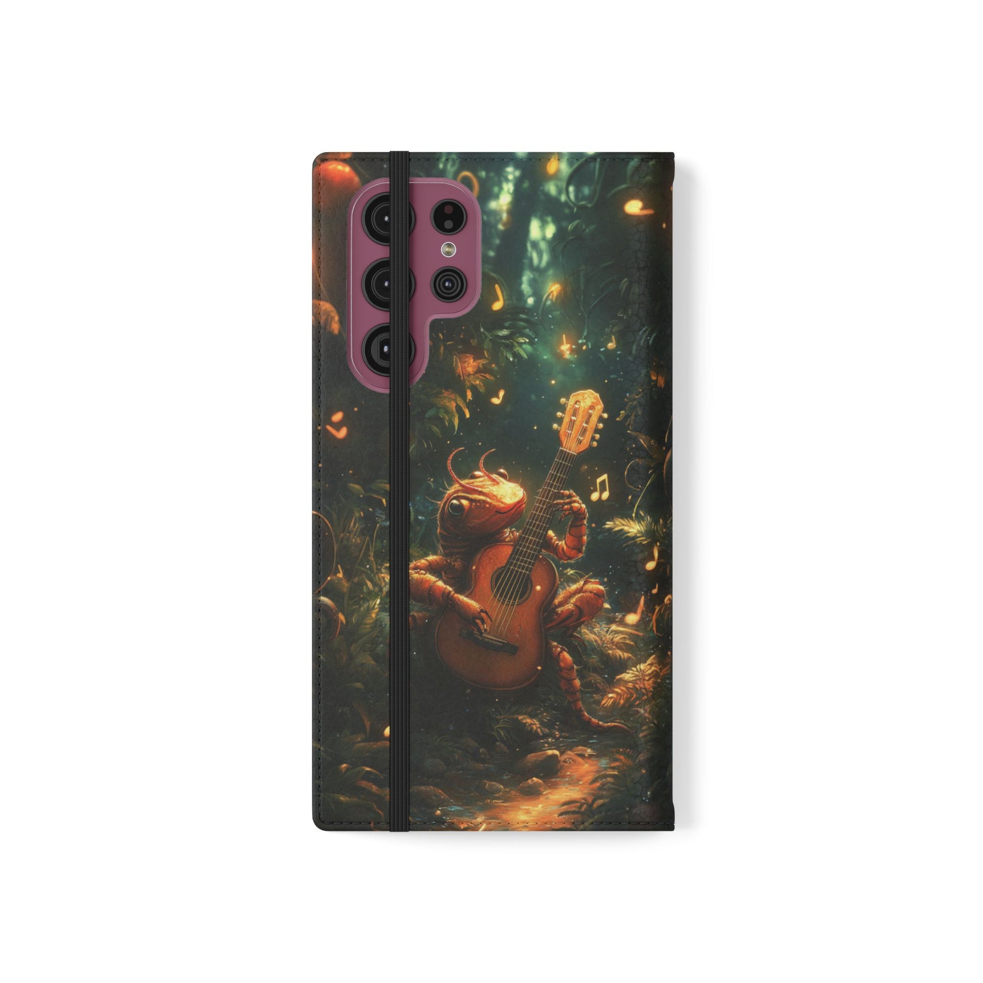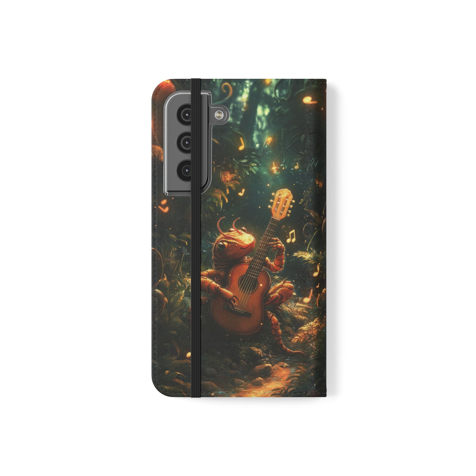 Protect your phone with our premium Serenade Forest Guitarist wallet case featuring an adorable orange frog playing guitar in an enchanted forest with glowing golden music notes floating through lush green foliage. This versatile flip case combines wallet functionality with comprehensive phone protection, card storage, and charming whimsical musical artwork.