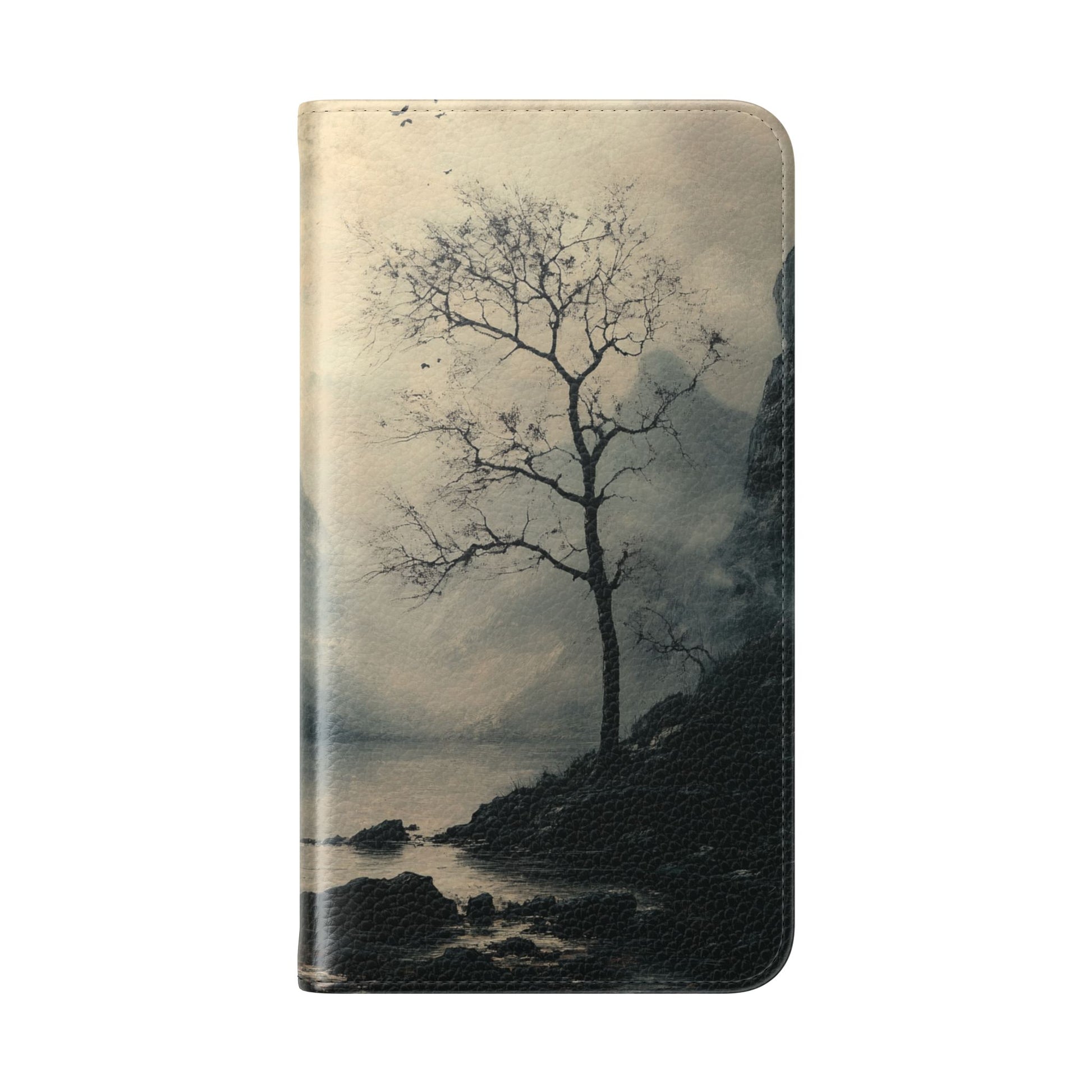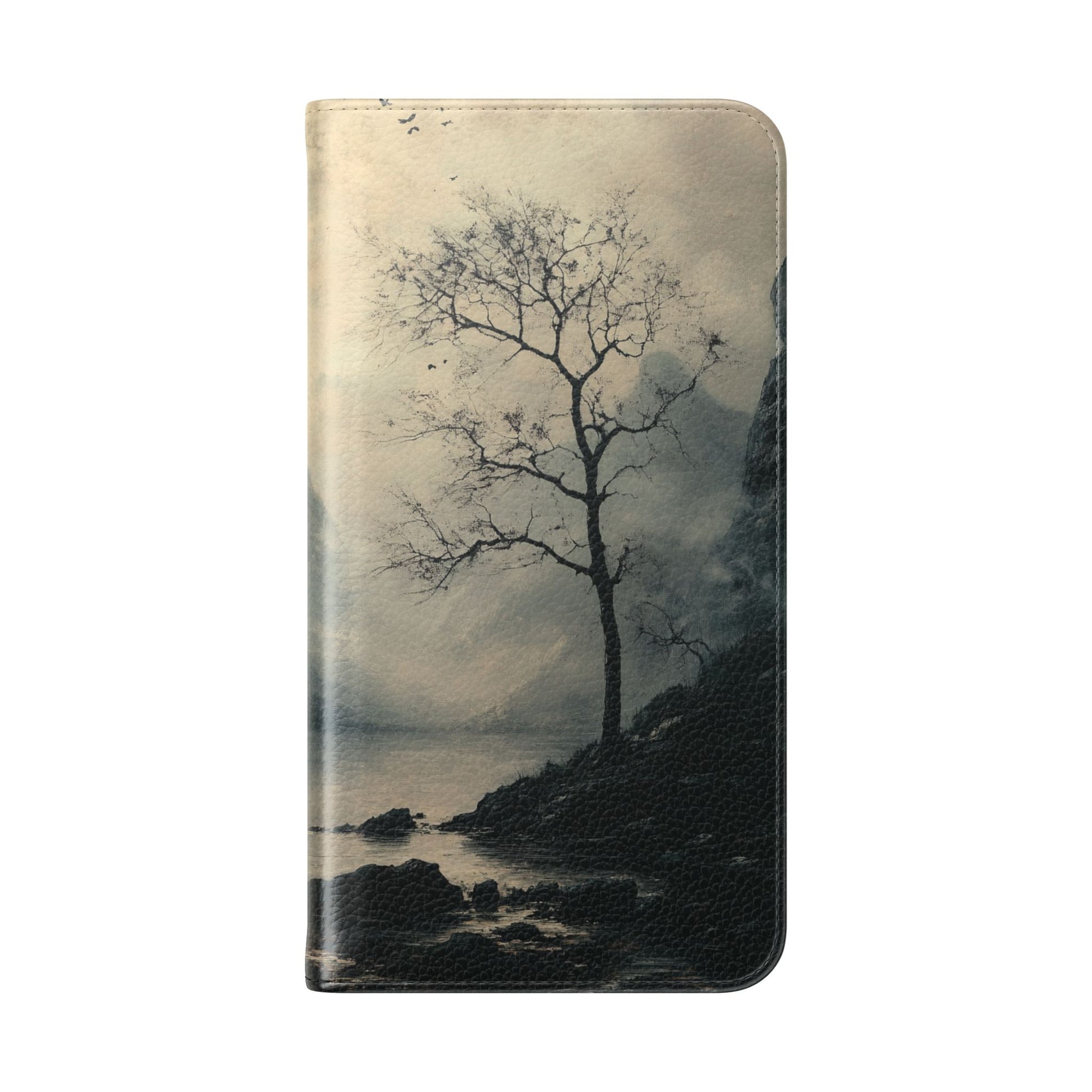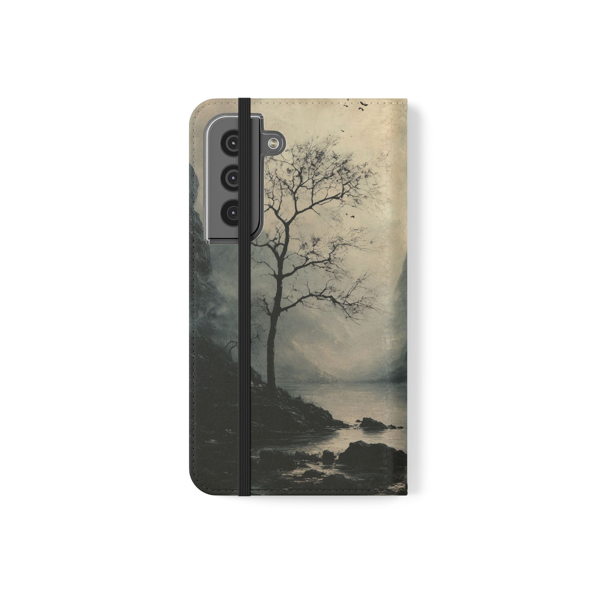 Find peace in nature's quiet moments with our contemplative Solitude Lake Wallet Flip Case. This beautifully rendered vintage-style landscape captures the tranquil essence of a secluded mountain lake, where a lone bare tree stands as a silent sentinel against the misty waters. The soft sepia and muted color palette evokes the timeless quality of classic nature photography, while gentle mountains frame the serene scene in the distance. Birds drift gracefully across the overcast sky, adding life to the peaceful composition. Rocky shores and calm waters create perfect reflections, while the atmospheric quality of the image suggests the quiet solitude found only in nature's most pristine locations. The vintage aesthetic and contemplative mood make this design perfect for those seeking moments of calm in their busy lives. Ideal for nature lovers, meditation enthusiasts, vintage art admirers, or anyone who appreciates the restorative power of quiet natural landscapes.
