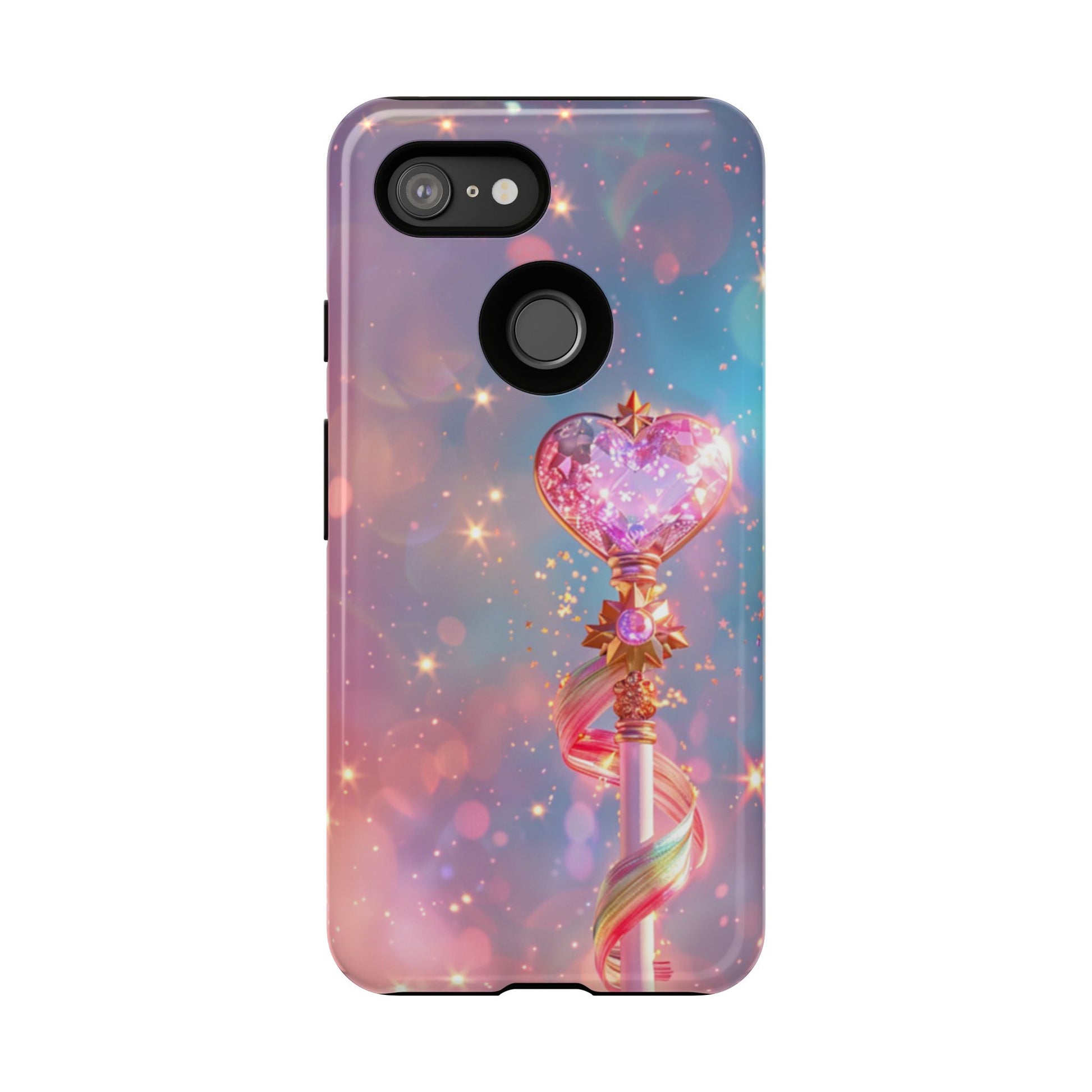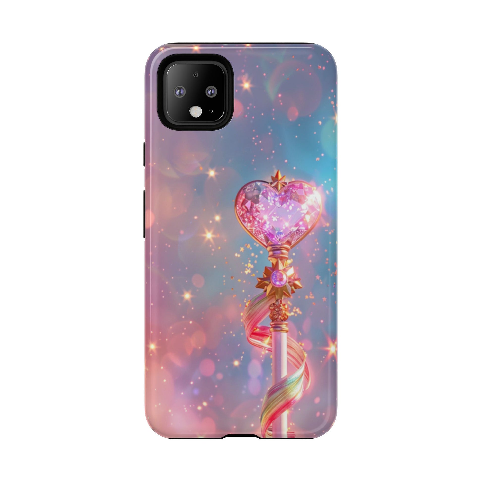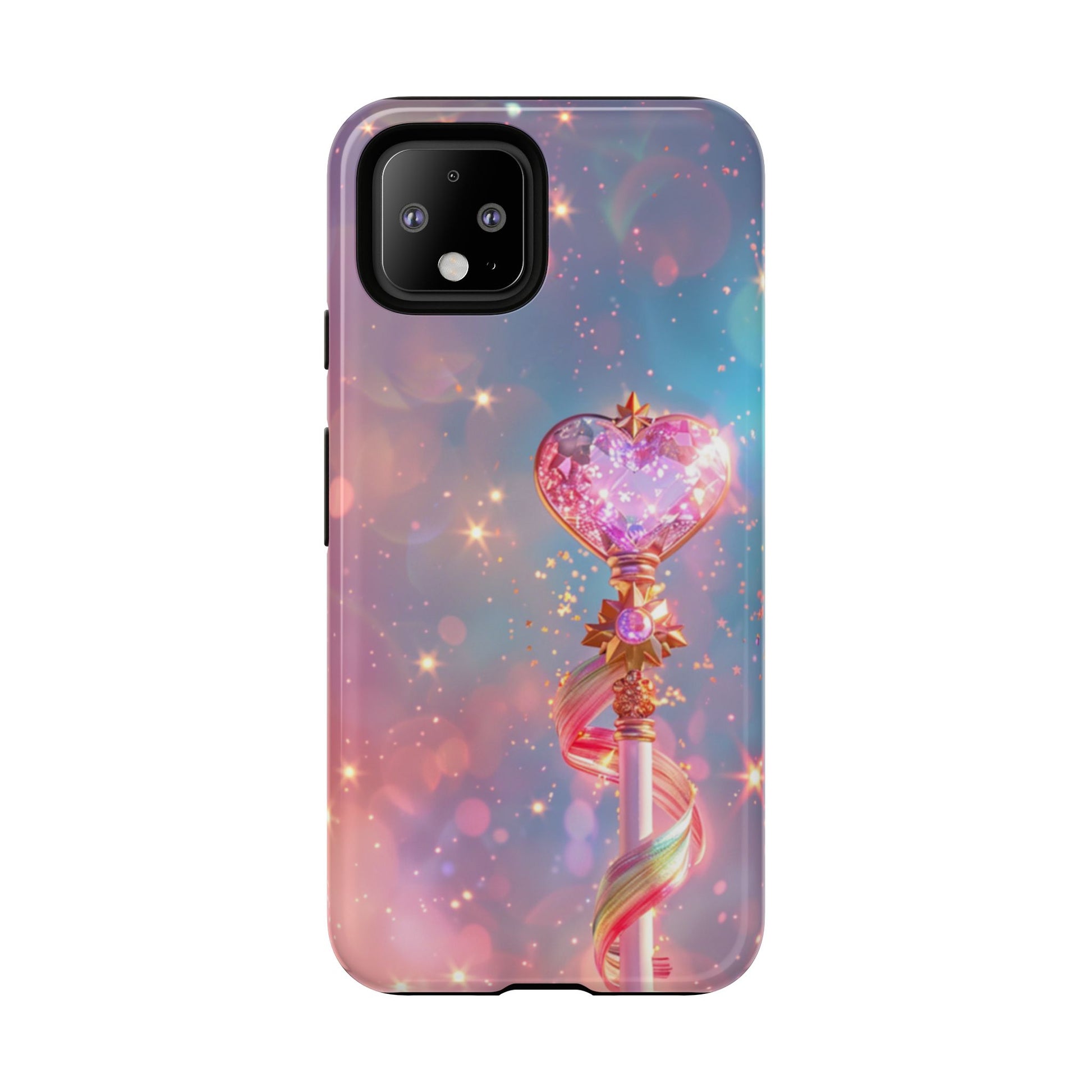 Embrace your inner magical girl with our enchanting Starlight Wand Google Pixel case. This dreamy design features an elegant magical staff topped with a sparkling crystalline heart, adorned with golden accents and flowing rainbow ribbons. Set against a mesmerizing starfield background in soft pastels of pink, purple, and blue, countless twinkling stars and bokeh lights create an atmosphere of pure magic and wonder. Perfect for anime enthusiasts, magical girl fans, or anyone who loves kawaii aesthetics and whimsical, sparkly designs that capture the essence of childhood dreams and fantasy.