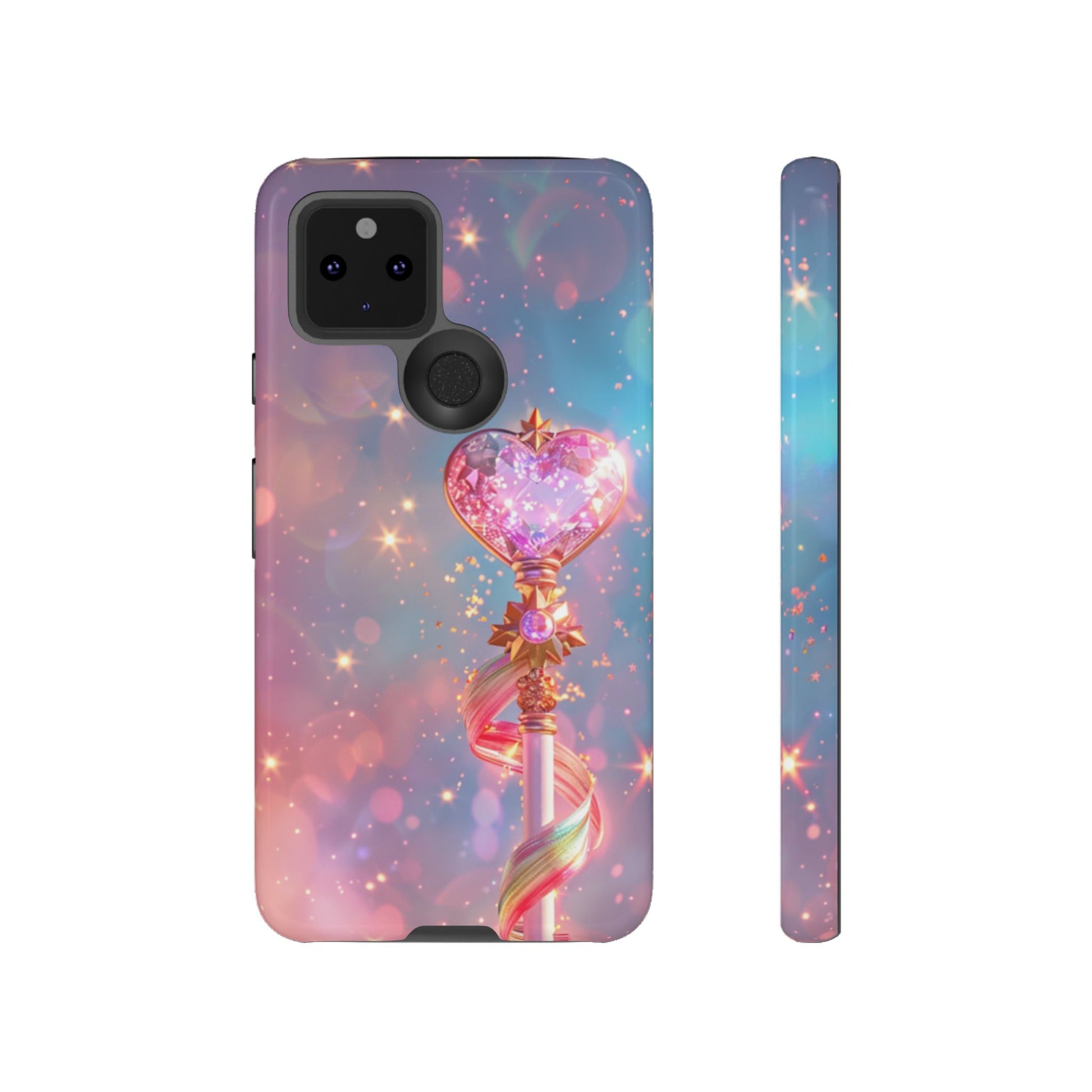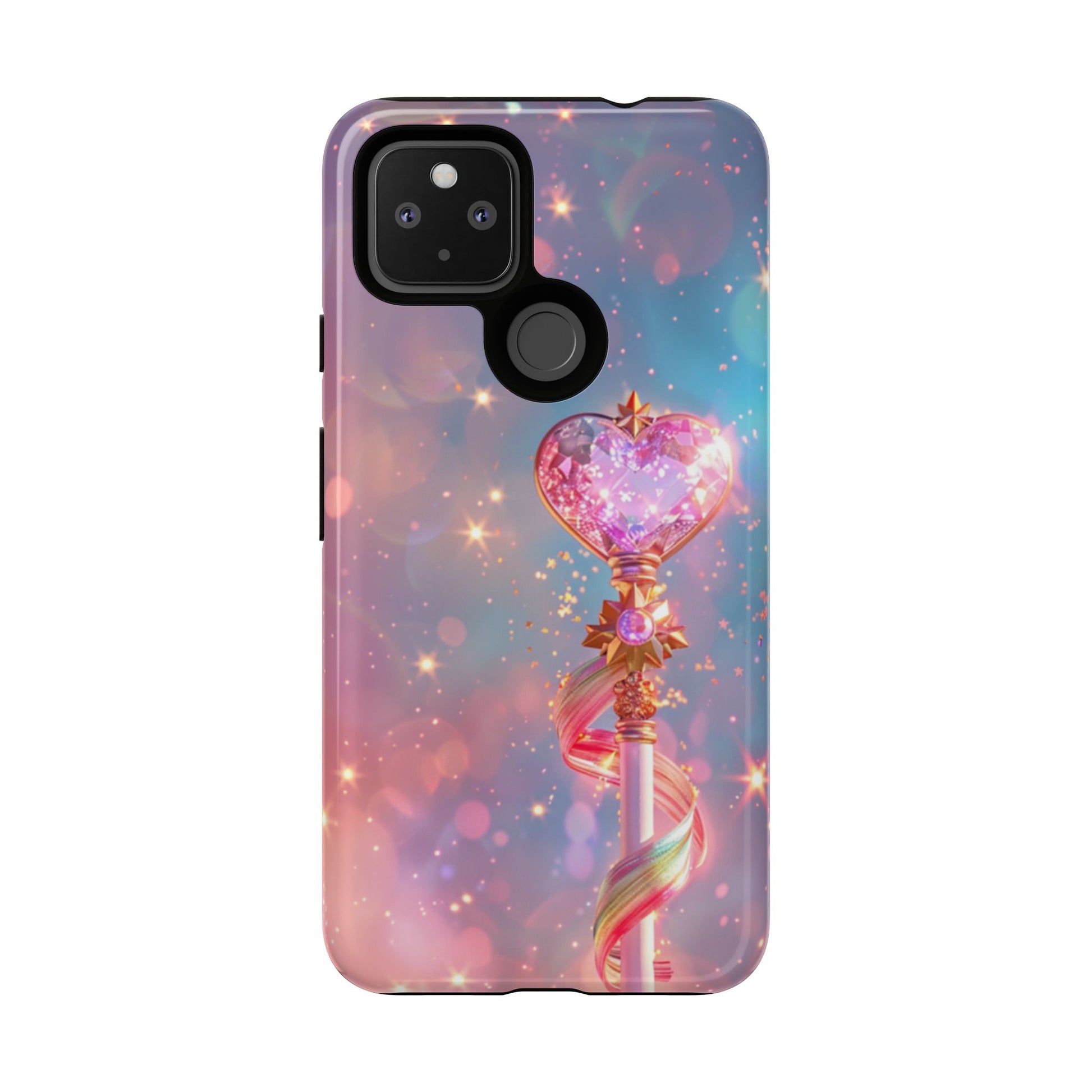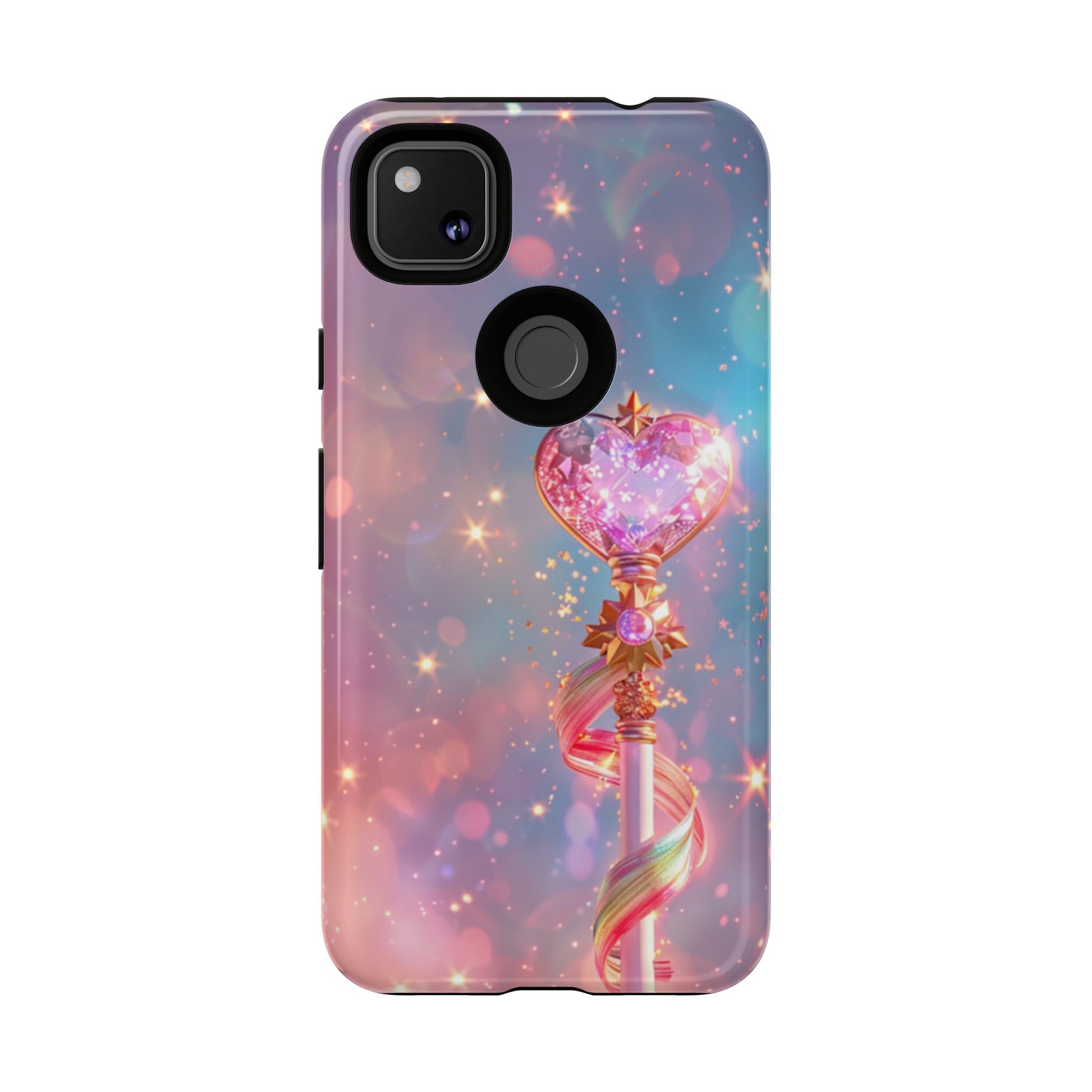 Embrace your inner magical girl with our enchanting Starlight Wand Google Pixel case. This dreamy design features an elegant magical staff topped with a sparkling crystalline heart, adorned with golden accents and flowing rainbow ribbons. Set against a mesmerizing starfield background in soft pastels of pink, purple, and blue, countless twinkling stars and bokeh lights create an atmosphere of pure magic and wonder. Perfect for anime enthusiasts, magical girl fans, or anyone who loves kawaii aesthetics and whimsical, sparkly designs that capture the essence of childhood dreams and fantasy.