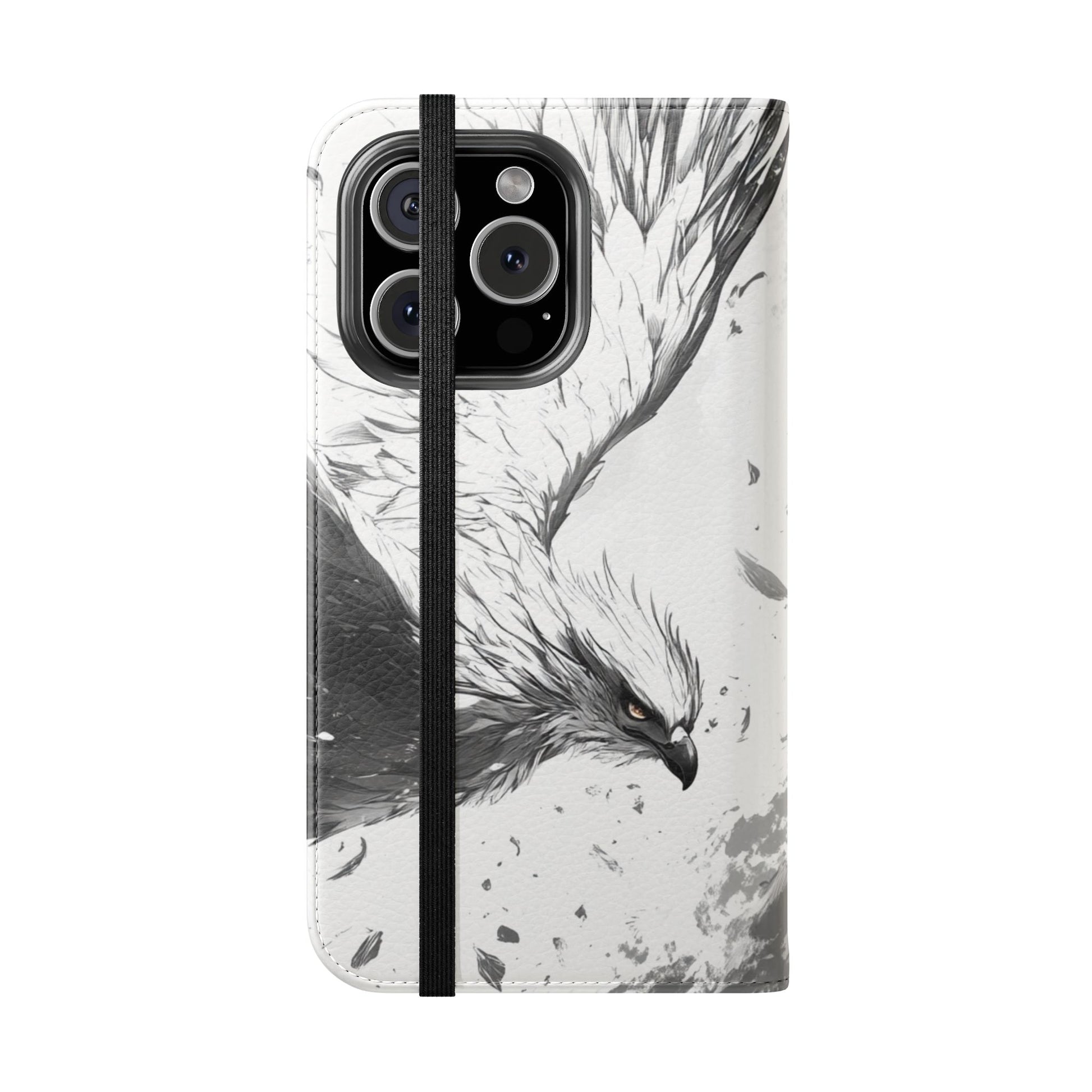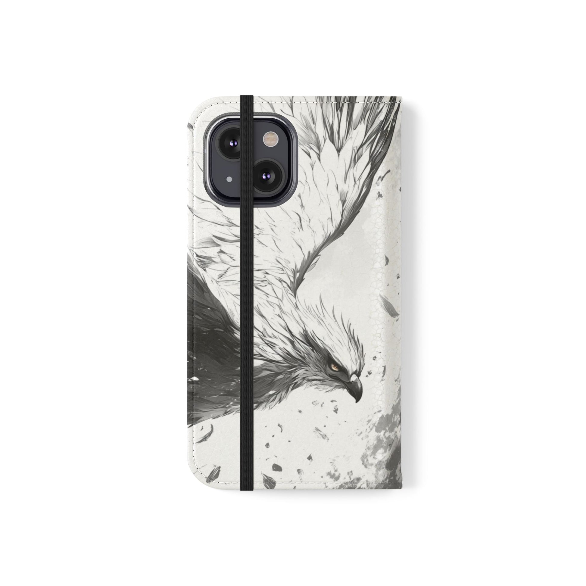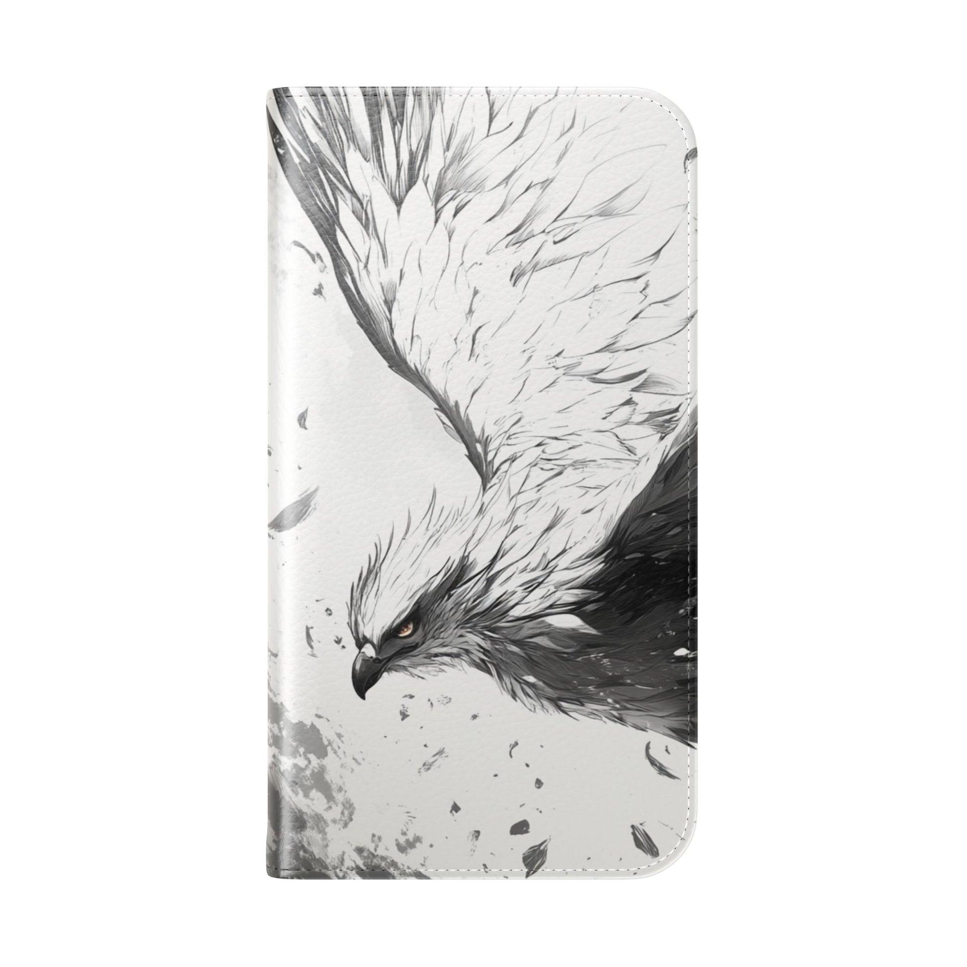 Witness the raw power of nature with our striking Storm Eagle Wallet Flip Case. This dramatic black and white artwork captures a magnificent eagle in mid-flight, its powerful wings spread wide as it soars through a turbulent storm. The monochromatic design emphasizes the bird's incredible detail - from the fierce intensity in its golden eye to every meticulously rendered feather that seems to ripple with movement and energy. Dynamic wind lines and scattered debris create a sense of motion and atmospheric drama, while the high-contrast composition highlights the eagle's commanding presence against the stormy backdrop. The artwork combines realistic detail with artistic expression, showcasing the eagle as a symbol of strength, freedom, and resilience in the face of nature's challenges. Perfect for wildlife enthusiasts, bird lovers, those who appreciate powerful symbolism, or anyone drawn to dramatic black and white artwork that captures the untamed spirit of America's national bird.