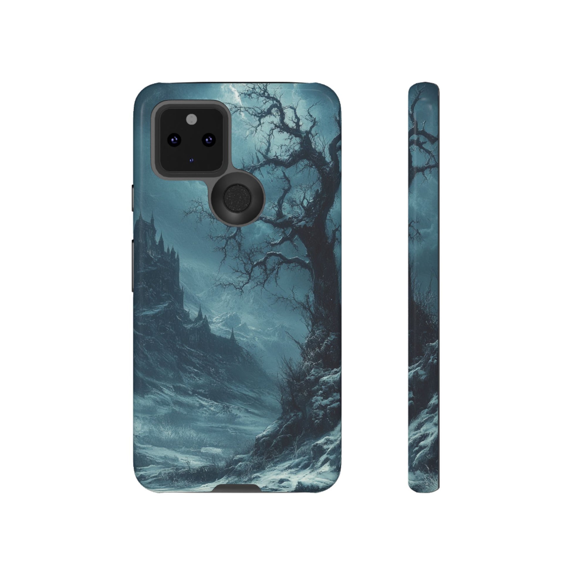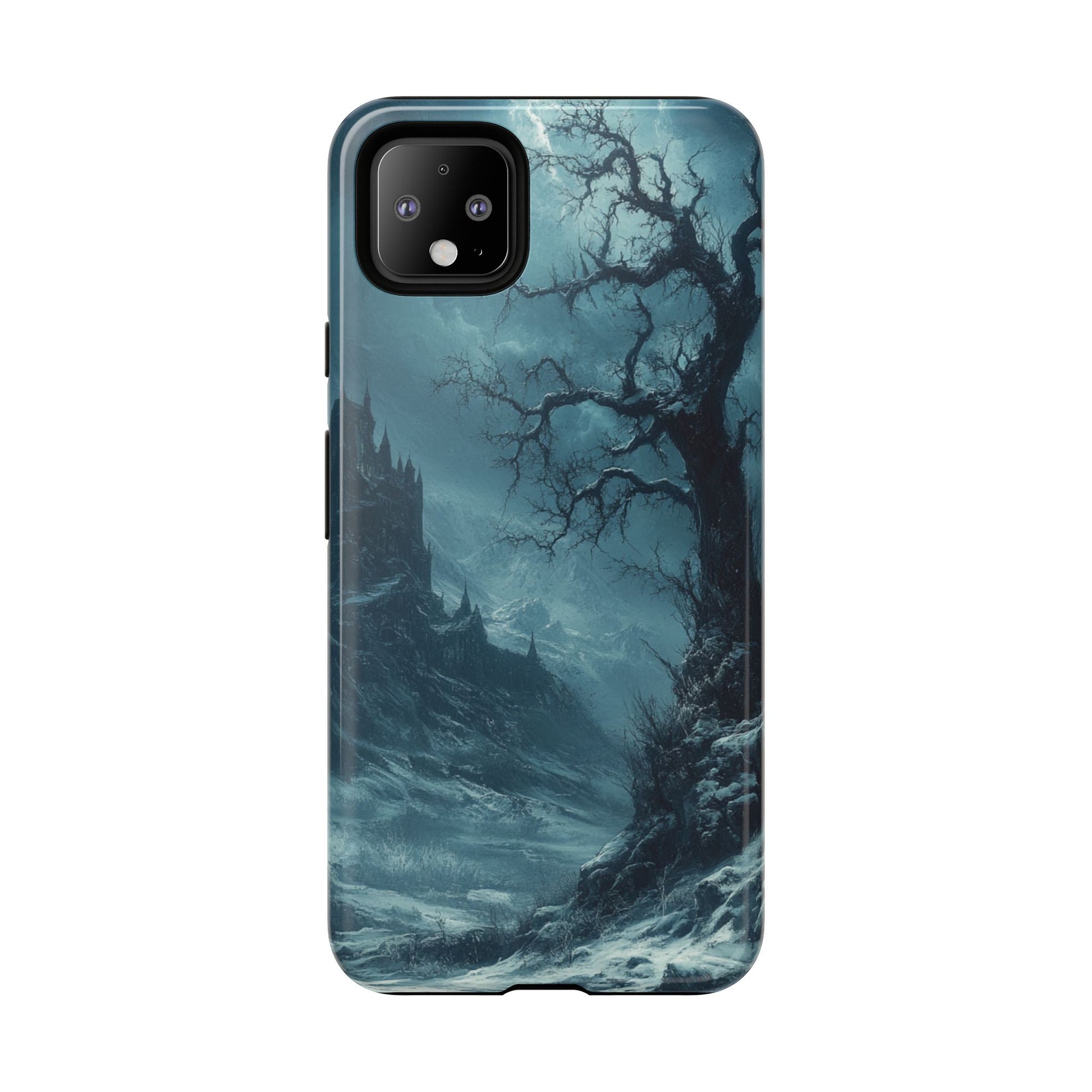 Witness the dramatic power of nature with our captivating Stormy Castle Google Pixel case. This striking design captures a foreboding medieval castle silhouetted against a turbulent sky filled with storm clouds and ethereal light. A gnarled, ancient tree dominates the foreground, its twisted branches reaching toward the tempestuous heavens like weathered fingers telling tales of countless storms. The moody blue-gray palette creates an atmosphere of mystery and drama, while shafts of celestial light pierce through the brooding clouds, illuminating the castle's imposing spires in the distance. The rocky, windswept landscape and rushing waters add to the scene's wild energy, evoking the untamed beauty of medieval times when castles stood as bastions against both human enemies and nature's fury. Every element contributes to the gothic romance of this atmospheric composition - from the castle's distant majesty to the tree's resilient endurance. Perfect for lovers of medieval history, gothic architecture enthusiasts, dark fantasy fans, or anyone drawn to dramatic landscapes that capture the eternal struggle between civilization and the raw power of nature.