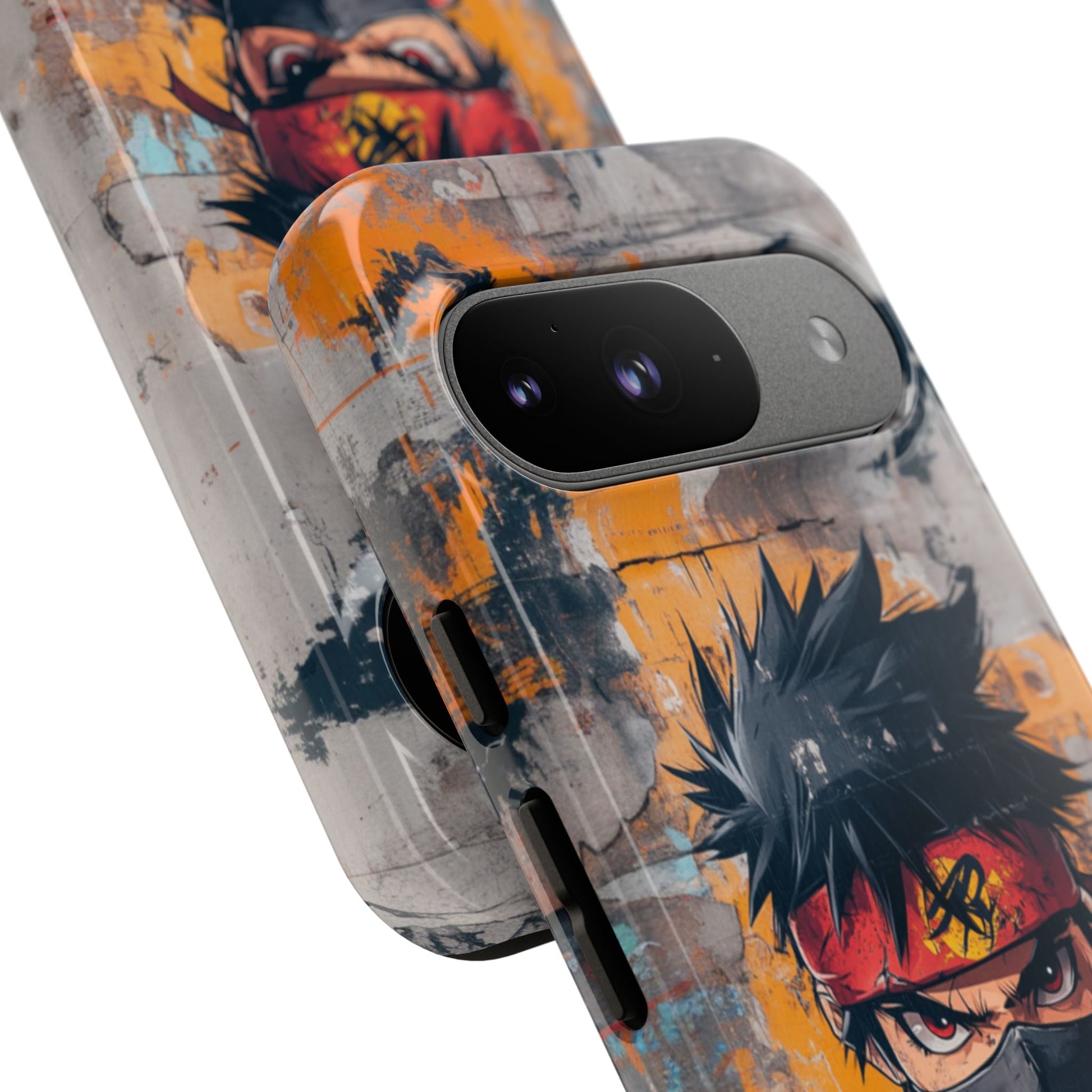 Unleash your inner rebel with our edgy Street Art Ninja Google Pixel case. This bold design features an intense anime-style ninja with piercing eyes and face mask, rendered in striking urban street art style against a weathered concrete wall covered in vibrant graffiti and orange paint splatters. The gritty texture and raw artistic elements capture the essence of underground street culture while the ninja's fierce expression embodies stealth and determination. Perfect for urban culture enthusiasts, street art lovers, or anyone drawn to the fusion of anime aesthetics with rebellious underground art movements.