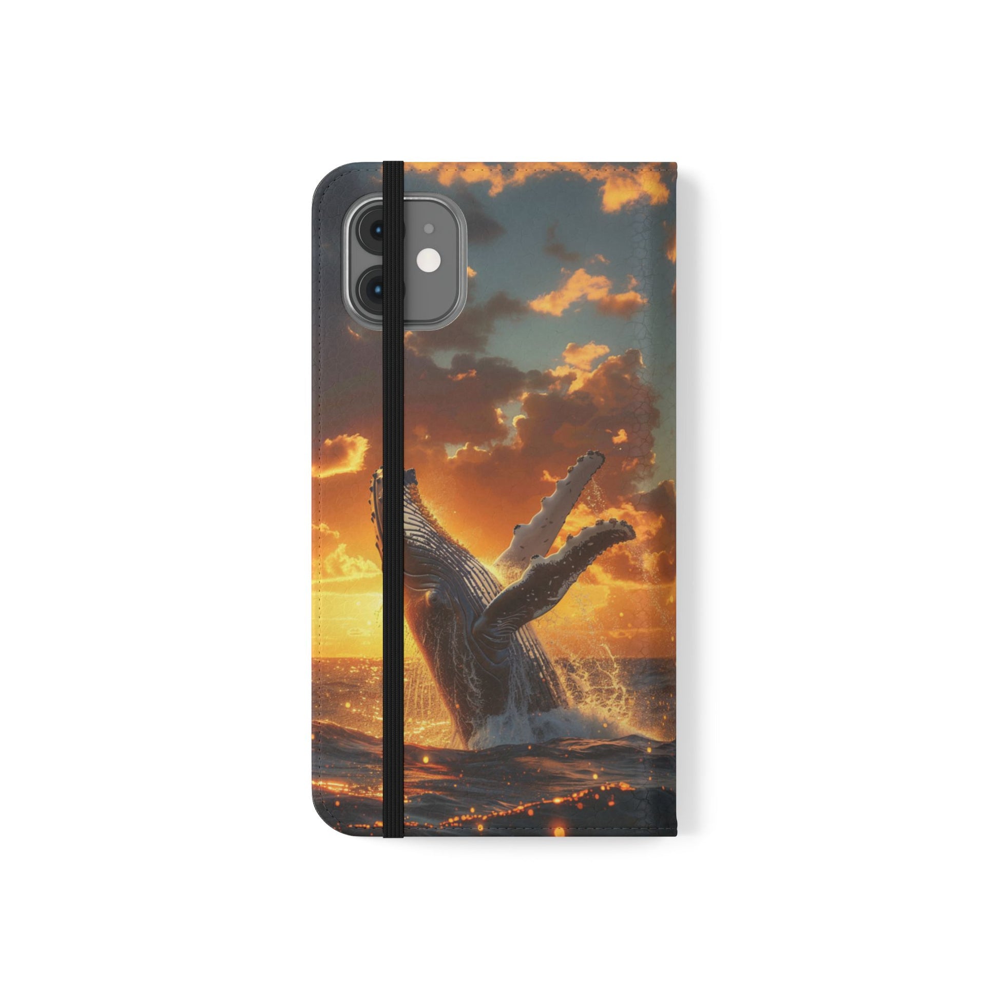 Witness the awe-inspiring power of nature with our Sunset Breach Wallet Flip Case. This breathtaking design captures a magnificent whale breaching the ocean surface against a dramatic sunset sky painted in brilliant golds, oranges, and deep blues. The dynamic splash of water and magical light particles dancing across the scene create a sense of movement and wonder. Perfect for ocean lovers, marine life enthusiasts, and those who appreciate the raw beauty and majesty of nature's most spectacular moments.